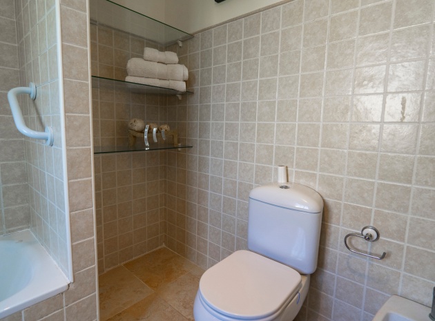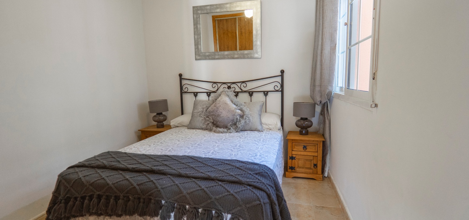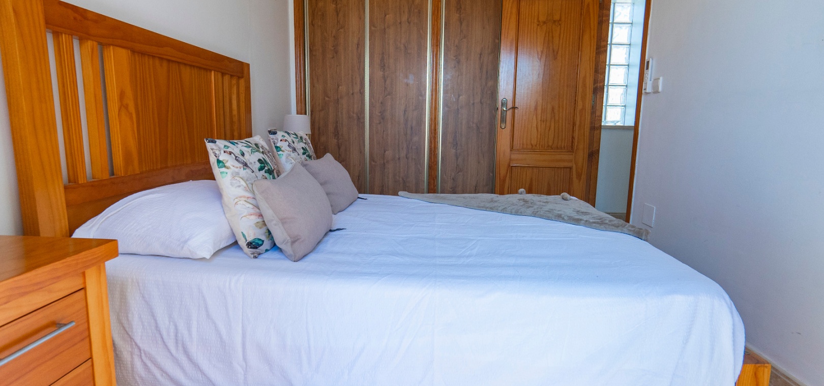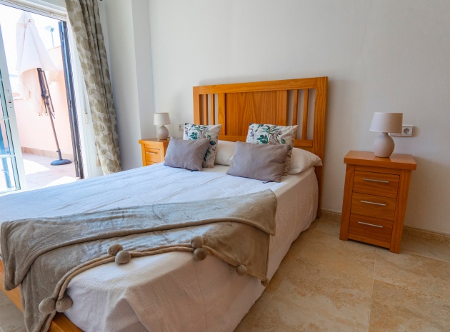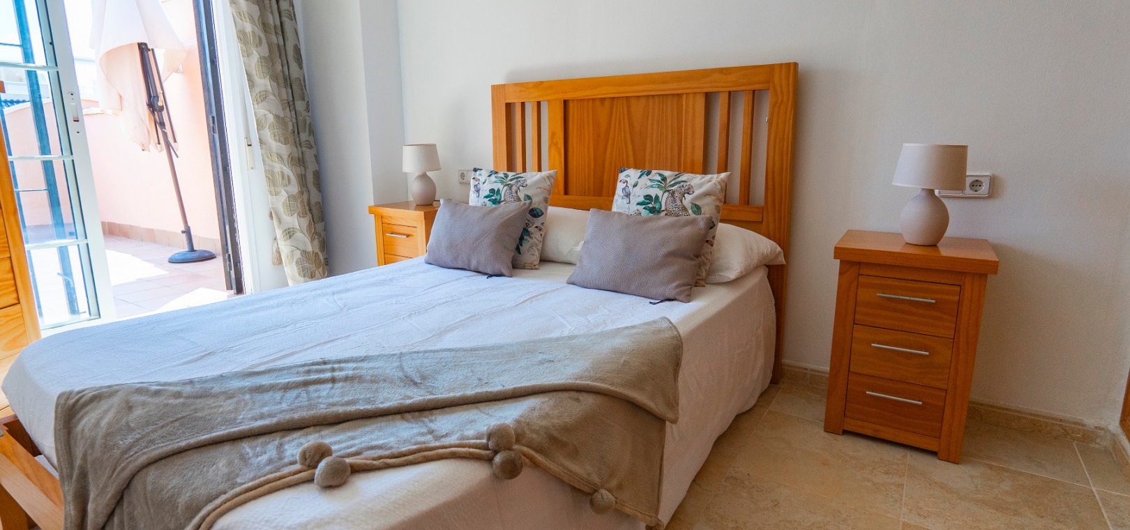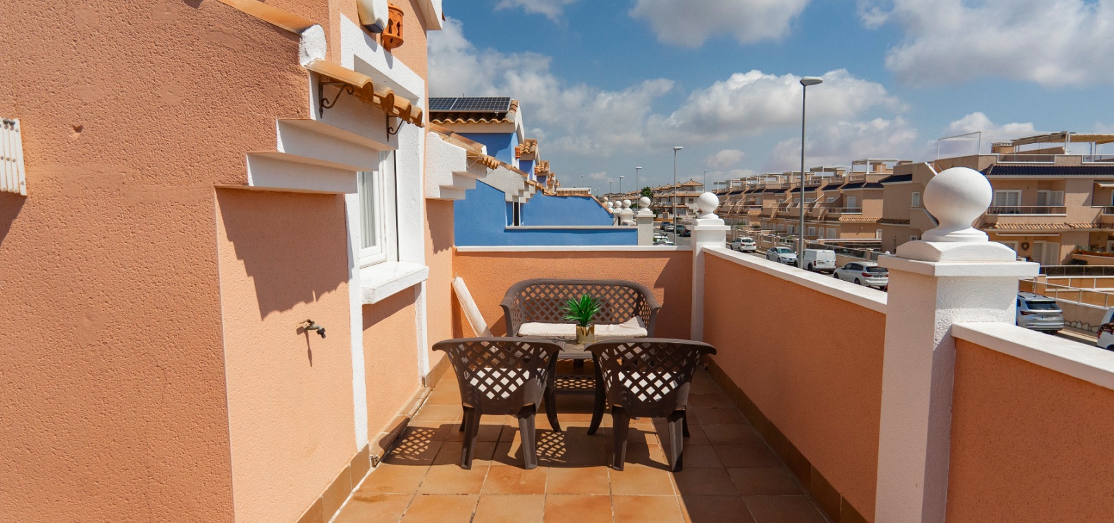 På övervåningen har sovrummet utgång till en stor privat terrass – perfekt för att sola eller njuta av varma medelhavskvällar. Ett andra rymligt dubbelrum med inbyggda garderober och luftkonditionering, plus ett familjebadrum med badkar och dusch, kompletterar denna våning.