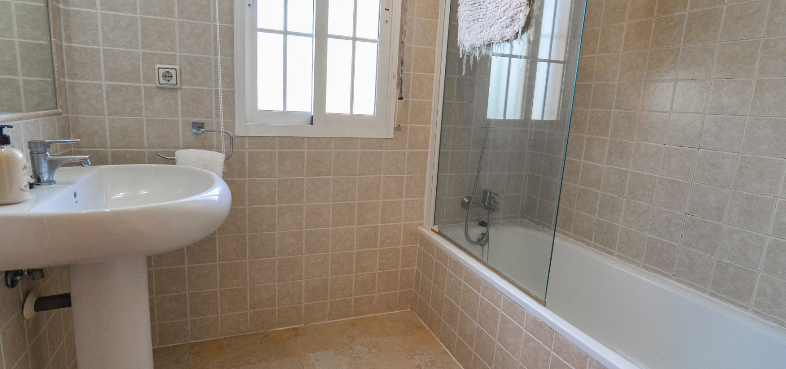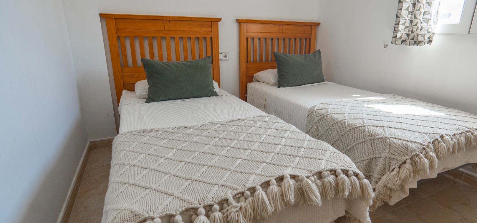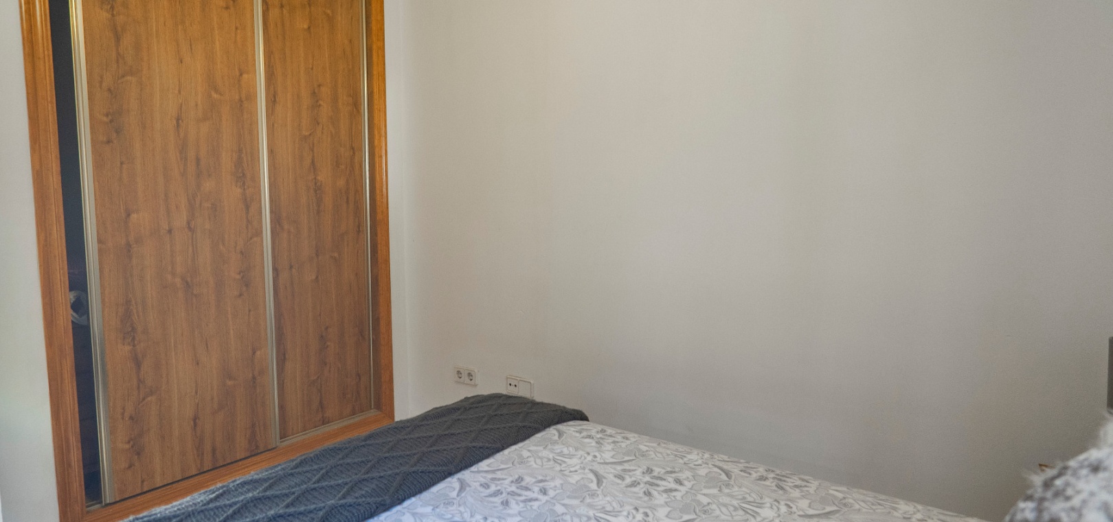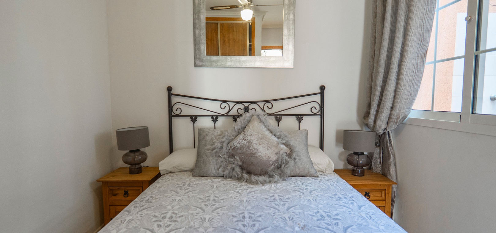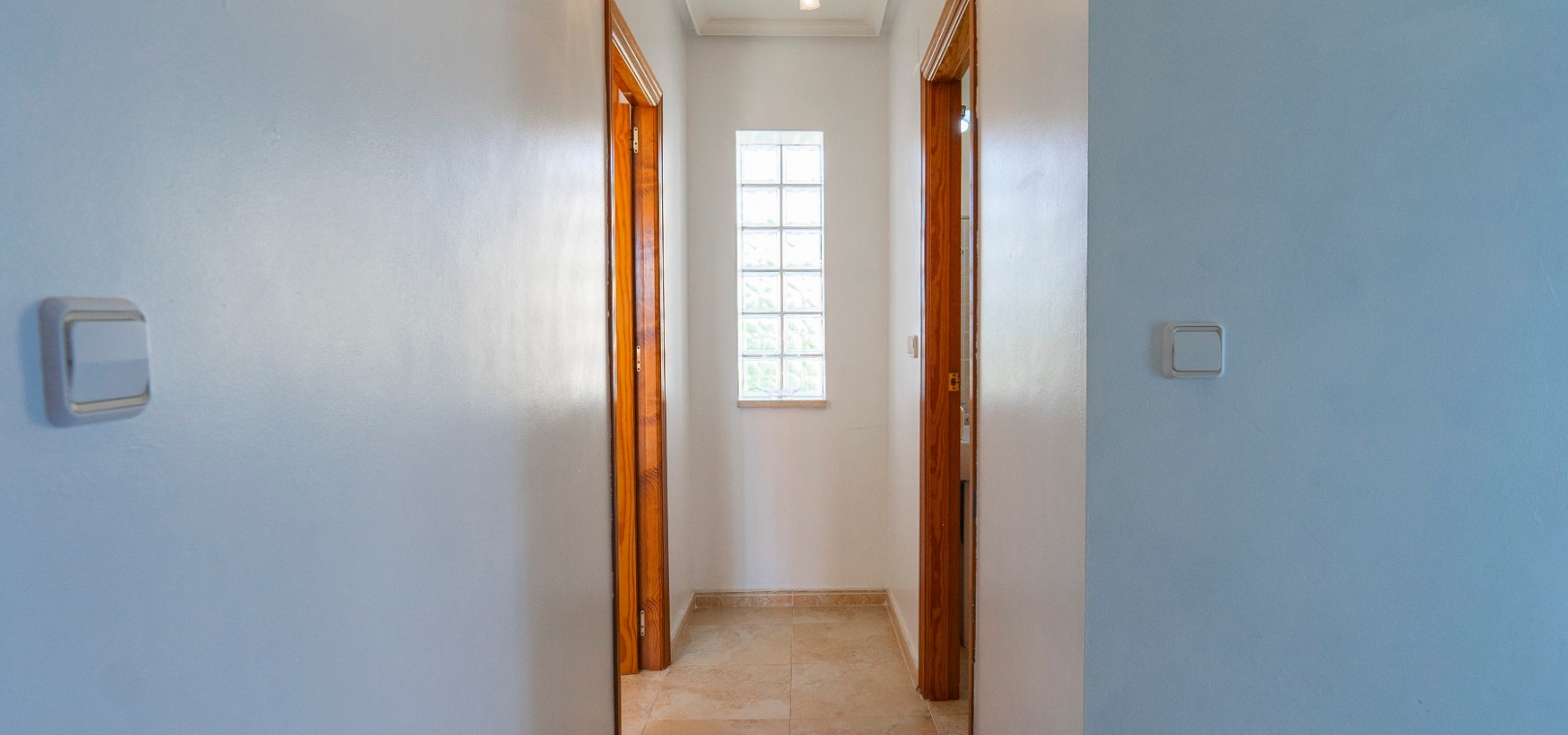 På övervåningen har sovrummet utgång till en stor privat terrass – perfekt för att sola eller njuta av varma medelhavskvällar. Ett andra rymligt dubbelrum med inbyggda garderober och luftkonditionering, plus ett familjebadrum med badkar och dusch, kompletterar denna våning.
