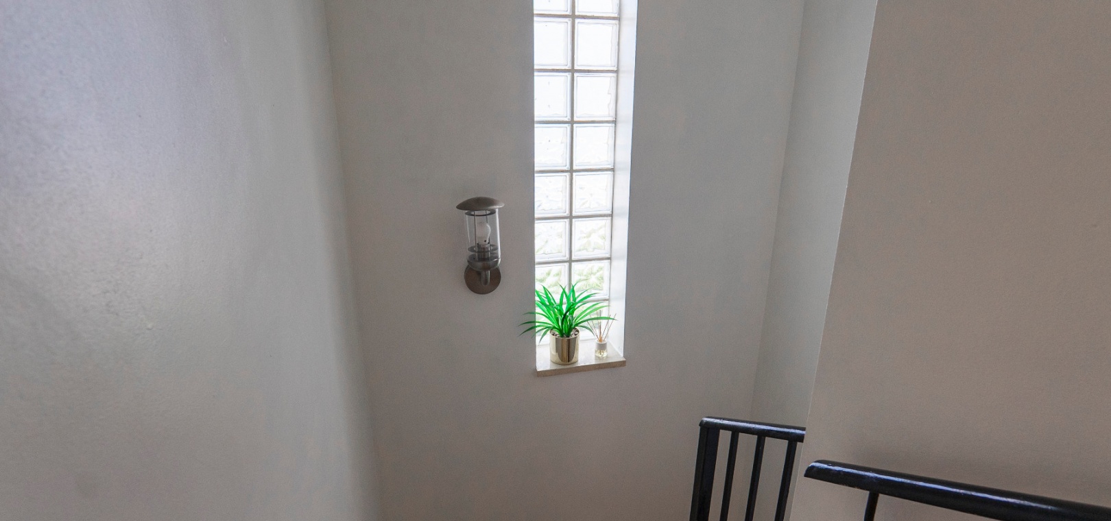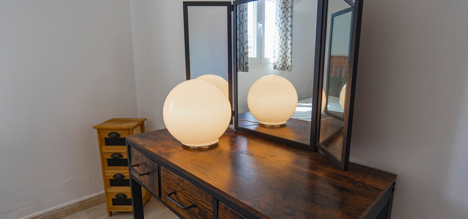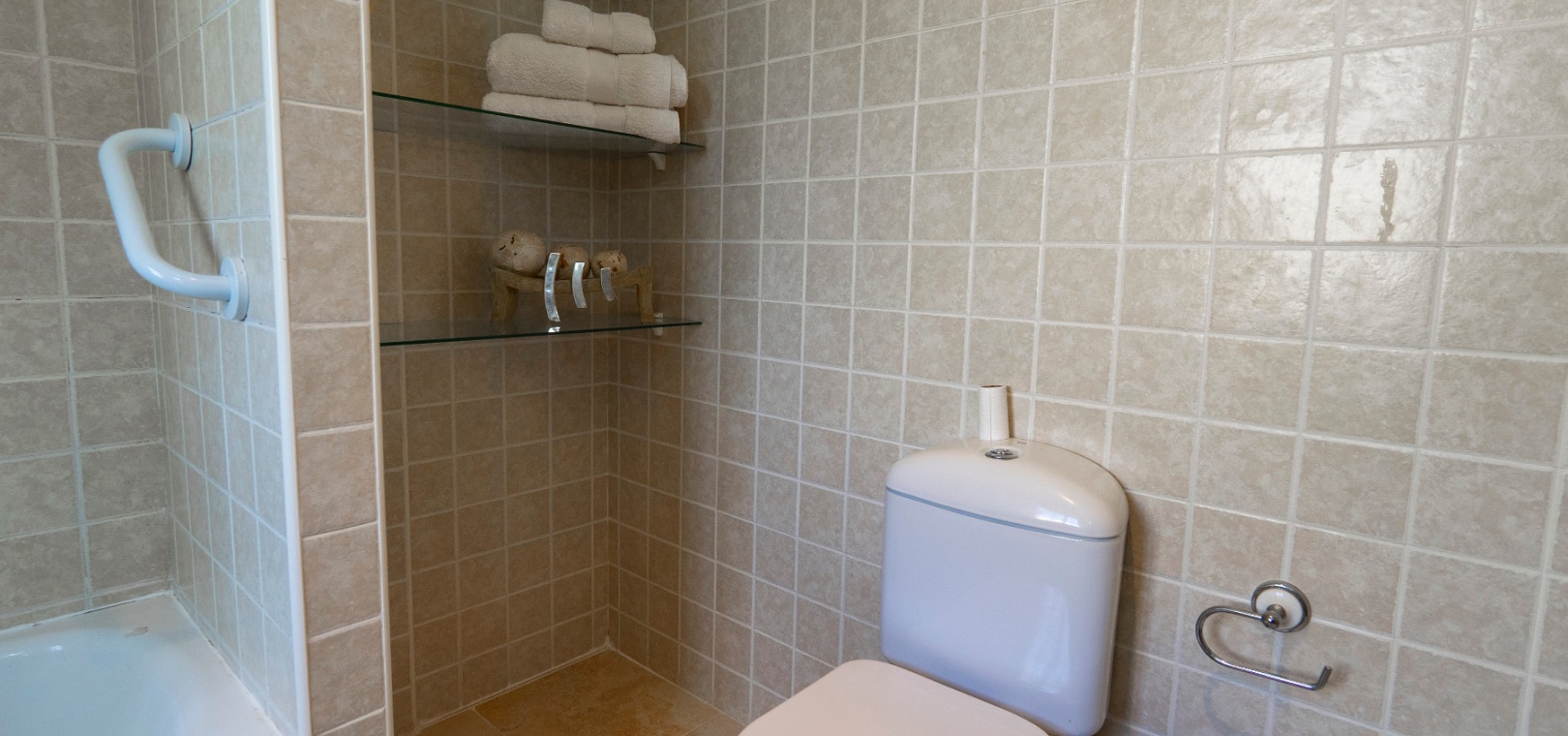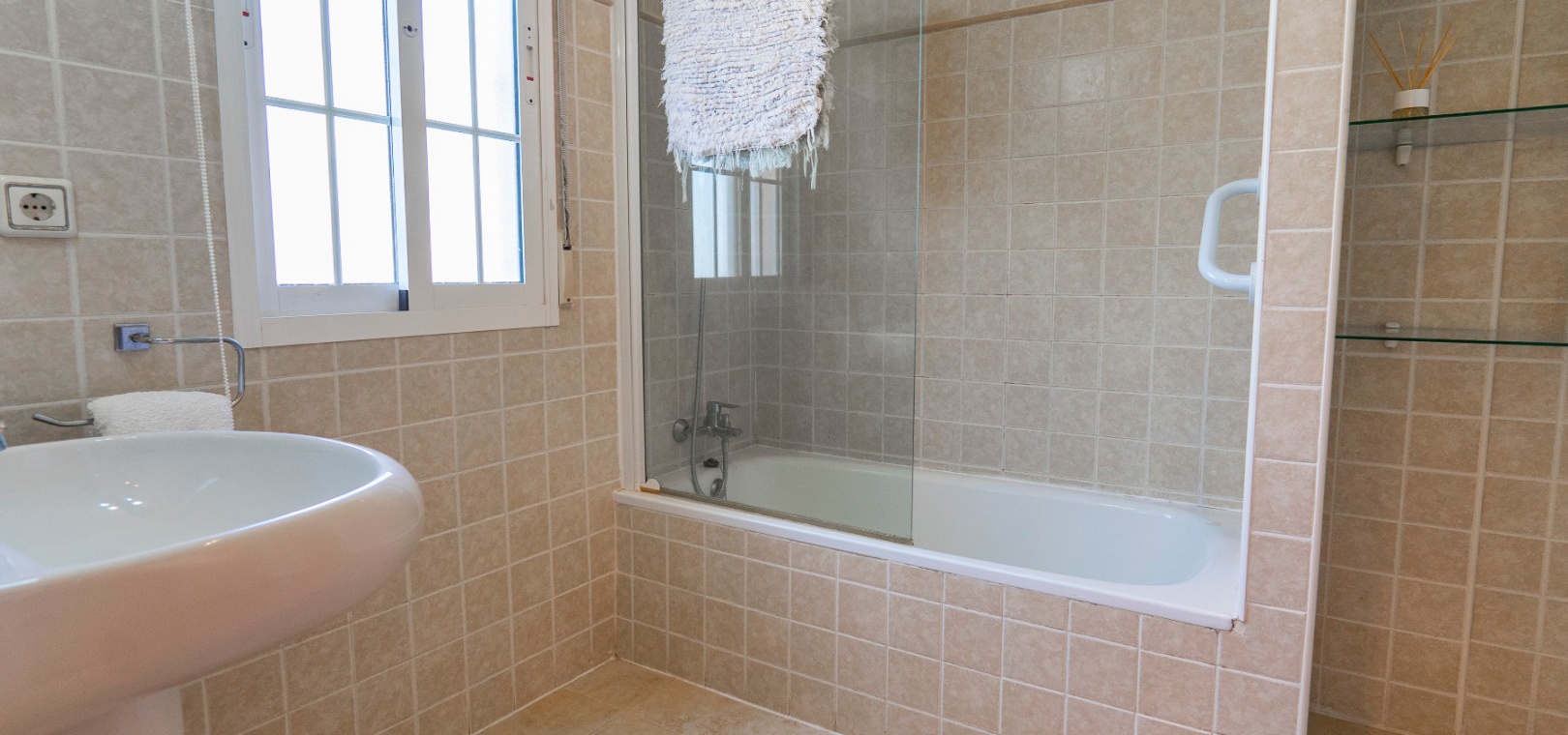 På övervåningen har sovrummet utgång till en stor privat terrass – perfekt för att sola eller njuta av varma medelhavskvällar. Ett andra rymligt dubbelrum med inbyggda garderober och luftkonditionering, plus ett familjebadrum med badkar och dusch, kompletterar denna våning.