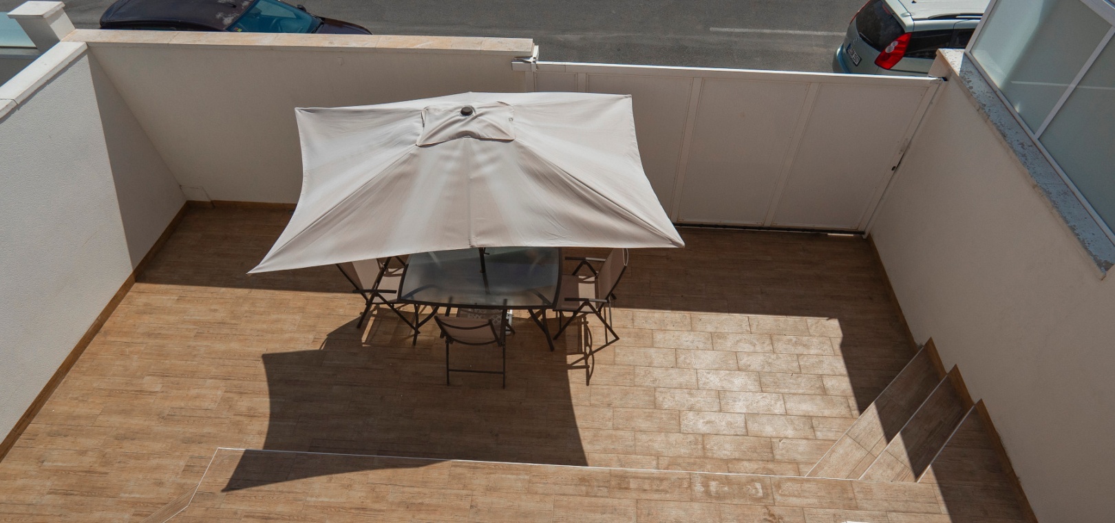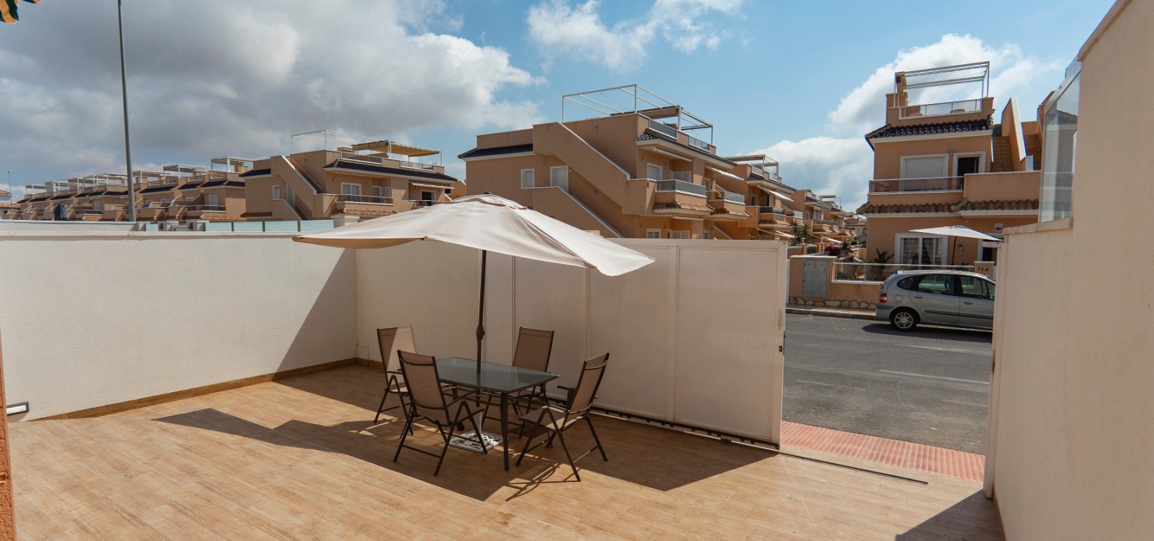 När du kliver in genom grinden möts du av en rymlig täckt terrass i två plan med en utdragbar markis – den perfekta platsen för morgonkaffe eller kvällsavkoppling. Terrassens nedre plan erbjuder också plats för parkering utanför vägen om så önskas.