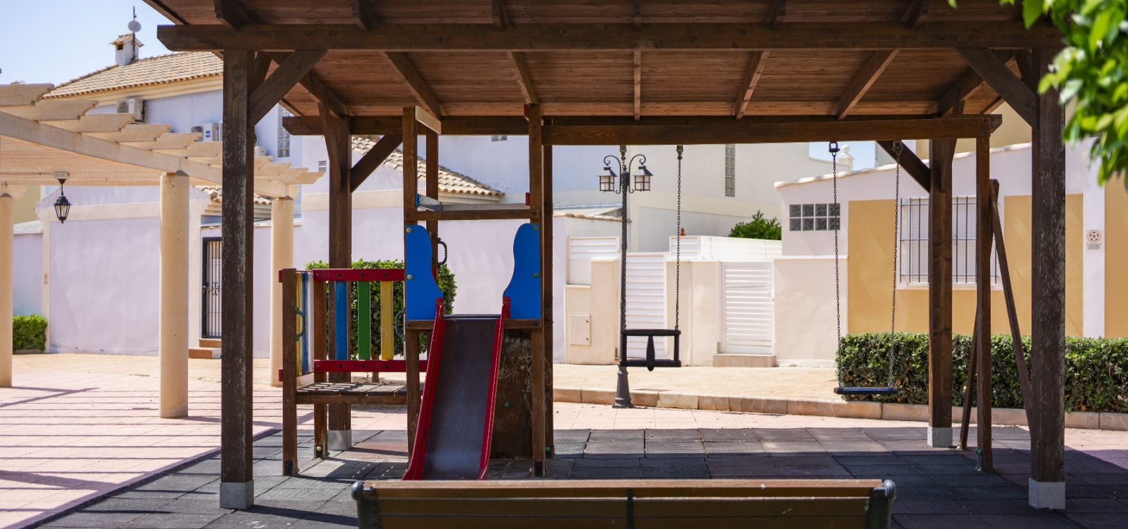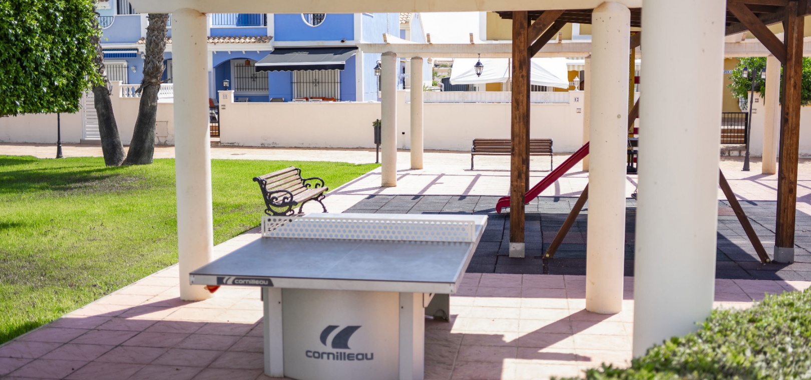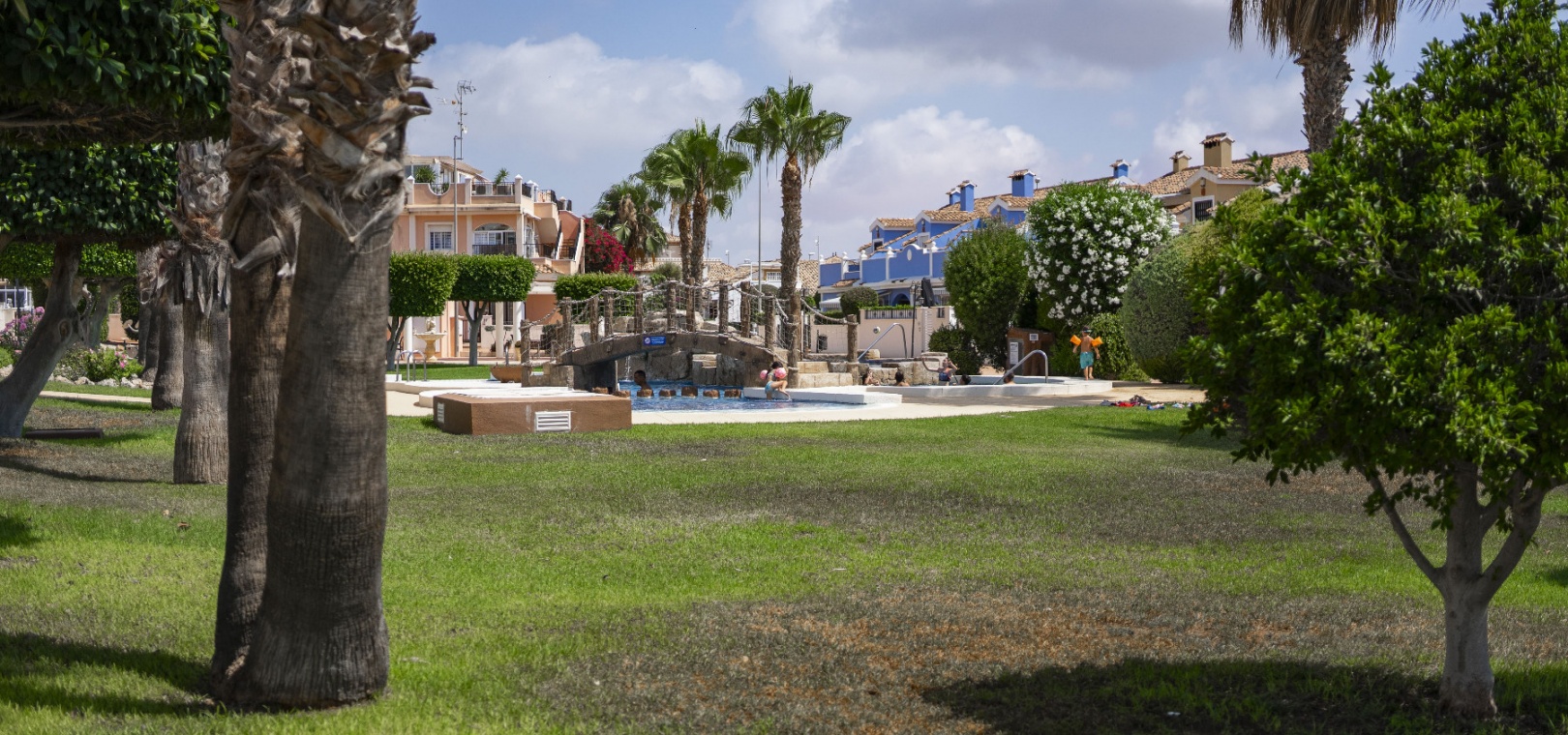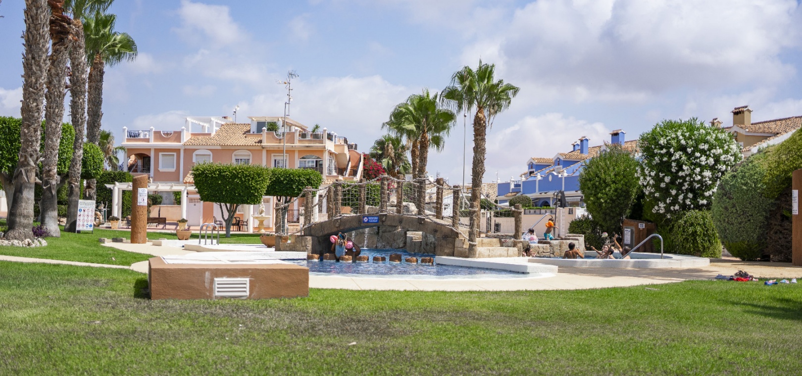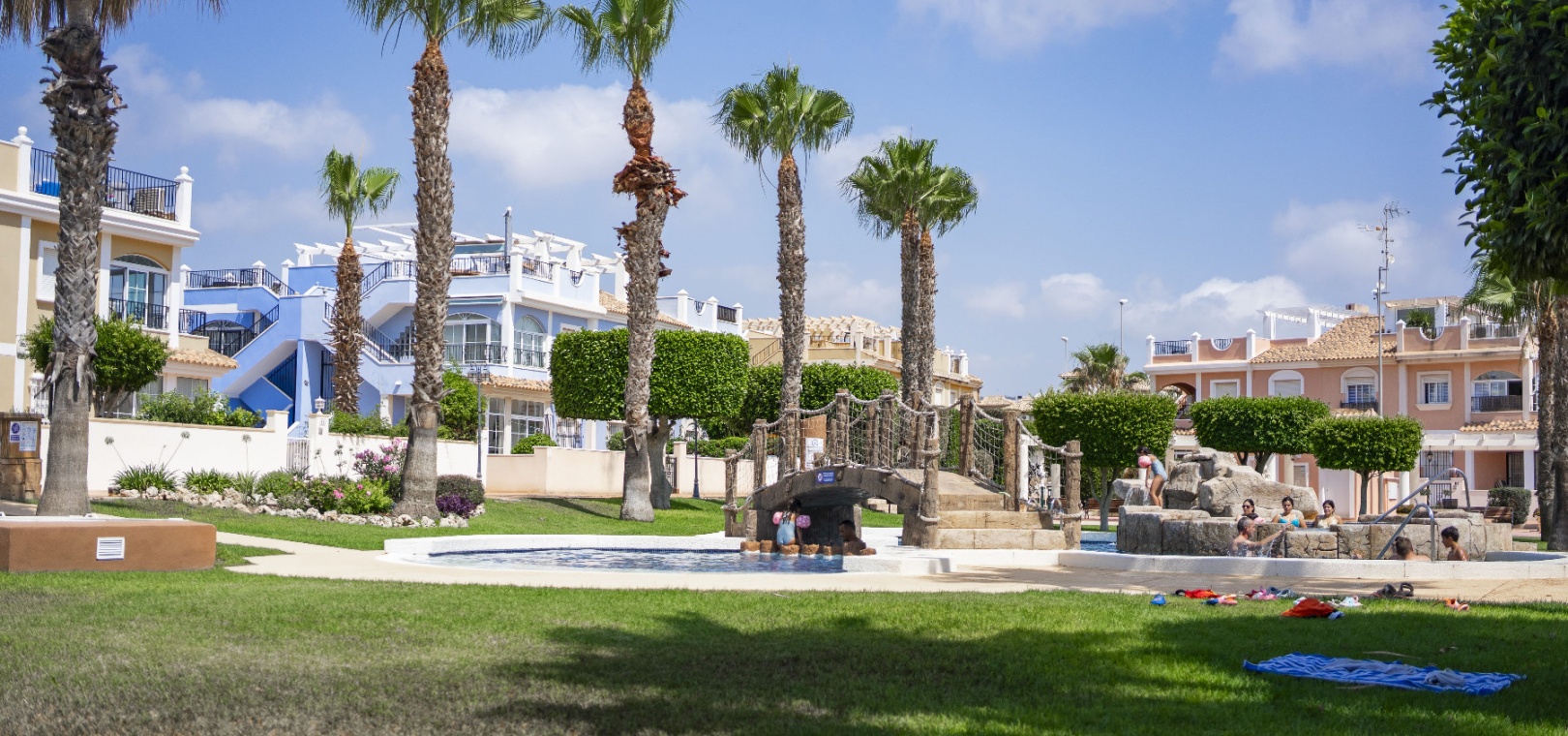 De vackert underhållna gemensamma utrymmena inkluderar en stor pool i japansk stil med jacuzzi, anlagda trädgårdar med skuggade sittplatser, en lekplats och ett utomhusgym – perfekt för en avslappnad medelhavslivsstil.