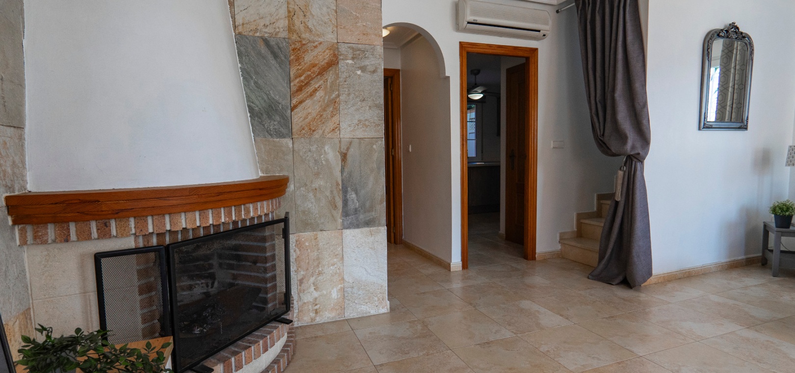 Inuti har bottenvåningen ett ljust och modernt vardagsrum med dubbelfönster, en inbjudande öppen spis, en imponerande stenvägg och luftkonditionering för komfort året runt. Denna våning inkluderar också ett generöst tilltaget dubbelrum med inbyggda garderober, ett elegant familjebadrum med duschkabin och ett välutrustat separat kök med gott om förvaring och arbetsyta. Ett grovkök som nås via köket har en energieffektiv gaspanna, tvättmaskin och till och med ett utomhusduschområde.