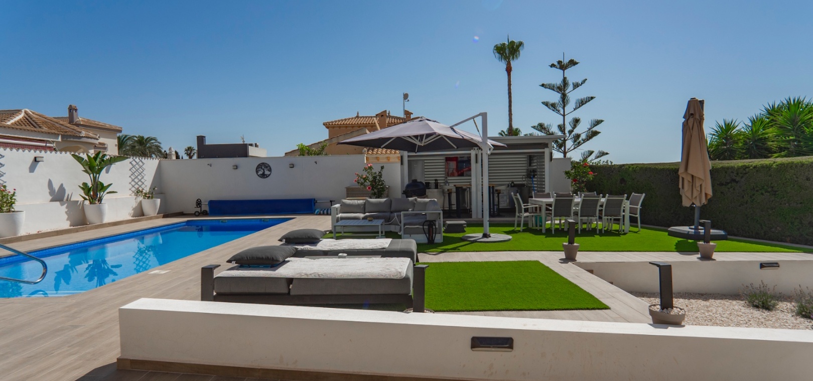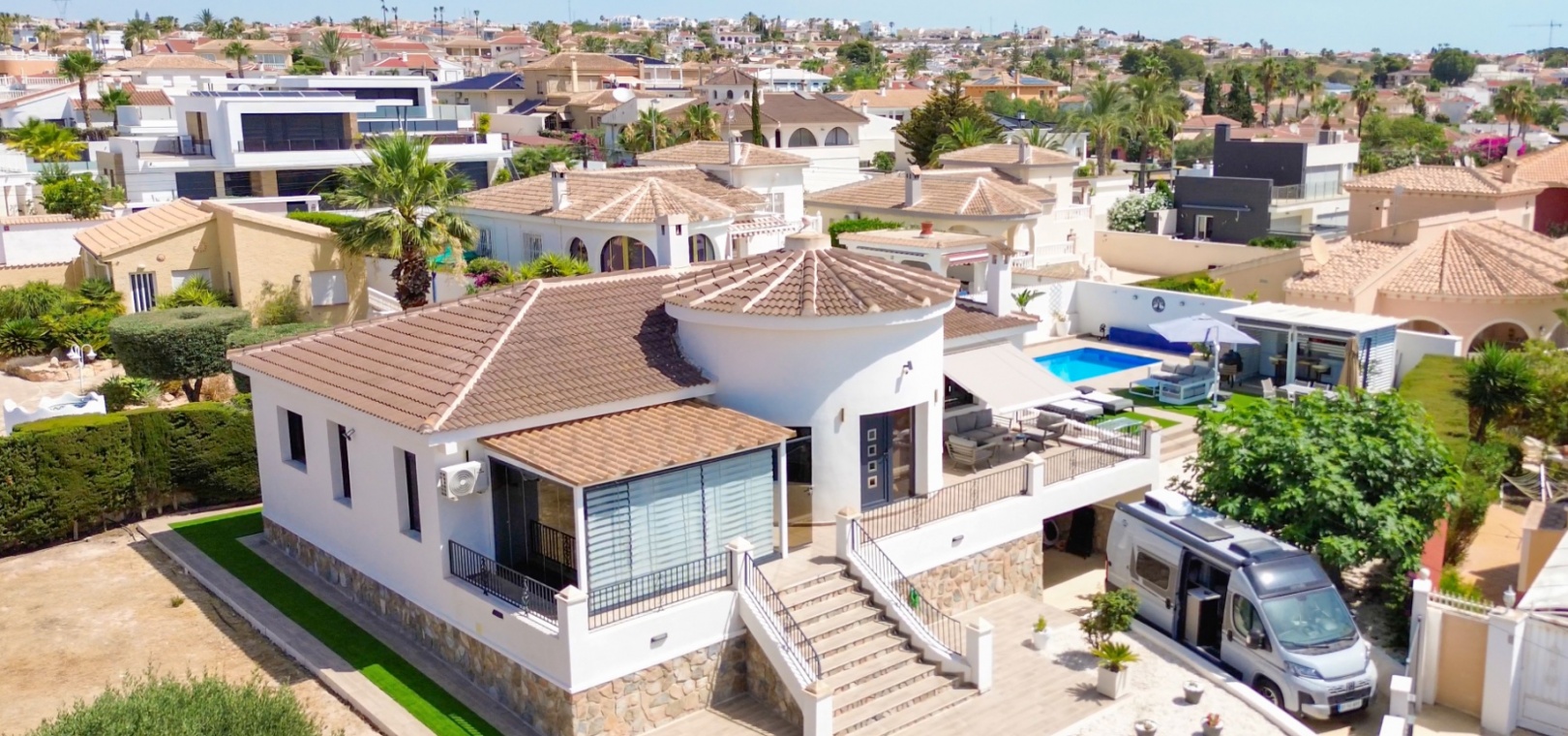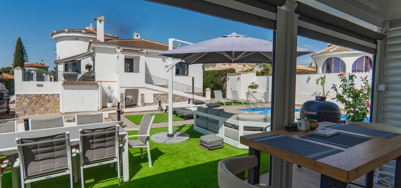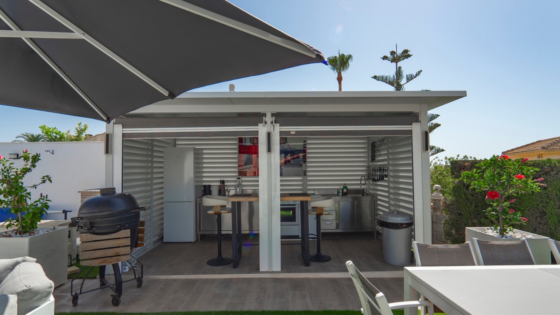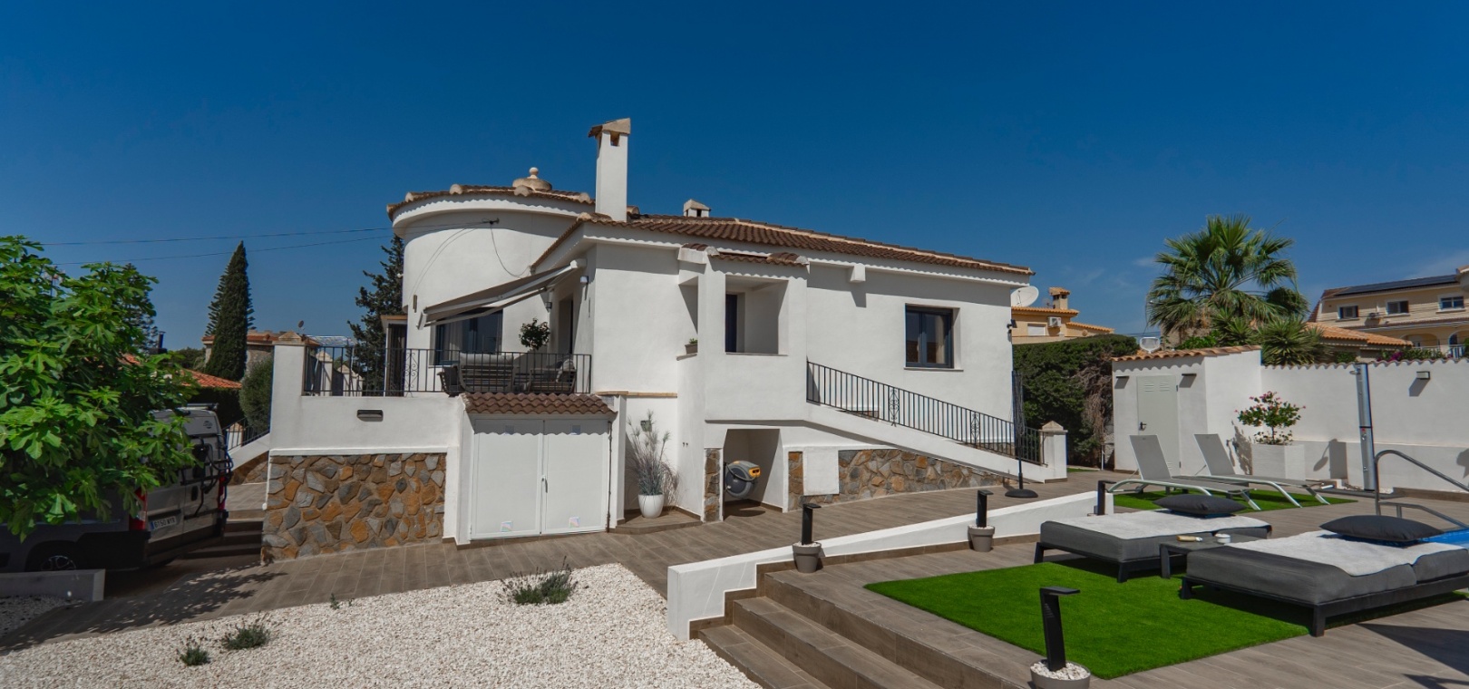 Exceptionell villa som blandar modern komfort med tidlös medelhavselegans — Förhöjd sjö- och havsutsikt Denna exceptionella villa blandar mästerligt moderna bekvämligheter med tidlös medelhavsarkitektur och skapar en lyxig tillflyktsort bara några steg från stadens centrum – men ändå perfekt avskilt för maximal avskildhet. Eleganta stendetaljer, klassiska vita fasader och moderna, rena linjer förstärker hemmets sofistikerade karaktär. Belägen på en upphöjd tomt har fastigheten panoramautsikt över det omgivande naturlandskapet, saltsjöar och till och med det avlägsna Medelhavet, vilket erbjuder en unik känsla av öppenhet och lugn som sällan finns så nära staden. Viktiga funktioner Tre sovrum med eget badrumVarje sovrum erbjuder generösa proportioner, inbyggda garderober och privata badrum i premiuminredning och natursten. Öppen planlösningEn sömlös planlösning förenar vardagsrum, matsal och vardagsrum under höga tak och översvämmar interiören med naturligt ljus. Skjutdörrar ansluter till ett vinterrum omgivet av glasgardiner – perfekt för avkoppling året runt och för att njuta av den vidsträckta utsikten. Gourmetkök och tvättstugaDet eleganta, fullt utrustade köket kompletteras av en separat tvättstuga och en praktisk gästtoalett. Dubbla uppfarter och säker parkeringTvå oberoende grindar ger flexibel åtkomst. Under villan finns ett rymligt garage som rymmer flera fordon. Med förbehåll för ytterligare grävning kan det utökas till en fullstor källare som passar för gym, biograf eller ytterligare gästsviter. Underhållning utomhus Uppvärmd pool kantad av rymliga solterrasser Sommarkök och inbyggd grill för uteservering Dusch vid poolen och utomhus-WC Gräsmatta på motsatt sida – för närvarande en tom duk för landskapsarkitektur, sport eller lek Expansionspotential Befintligt bygglov möjliggör ett fristående gästhus med upp till tre sovrum. Tomten kan också lagligen segregeras, vilket erbjuder attraktiva möjligheter för framtida utveckling eller återförsäljning. Läge Beläget i ett förstklassigt läge med "bäst av två världar", ligger fastigheten i hjärtat av staden – inom gångavstånd till kaféer, butiker och viktiga tjänster – men ändå diskret undangömd på en lugn gata, vilket garanterar lugn, avskildhet och vidsträckt utsikt över sjön och havet. Investeringsattraktion Oavsett om den är tänkt som ett prestigefyllt permanent boende, en lyxig semester eller en högavkastande hyresinvestering, representerar denna villa en sällsynt möjlighet i ett oslagbart läge, med potential att öka värdet ytterligare över tid. Boka din privata visning idag för att uppleva dess fulla potential.