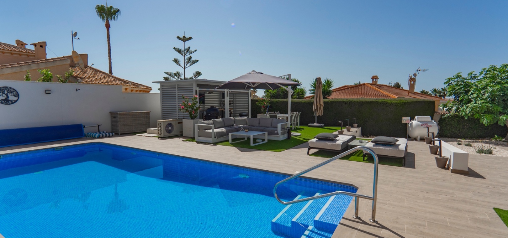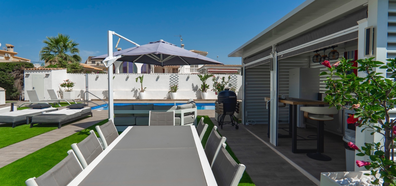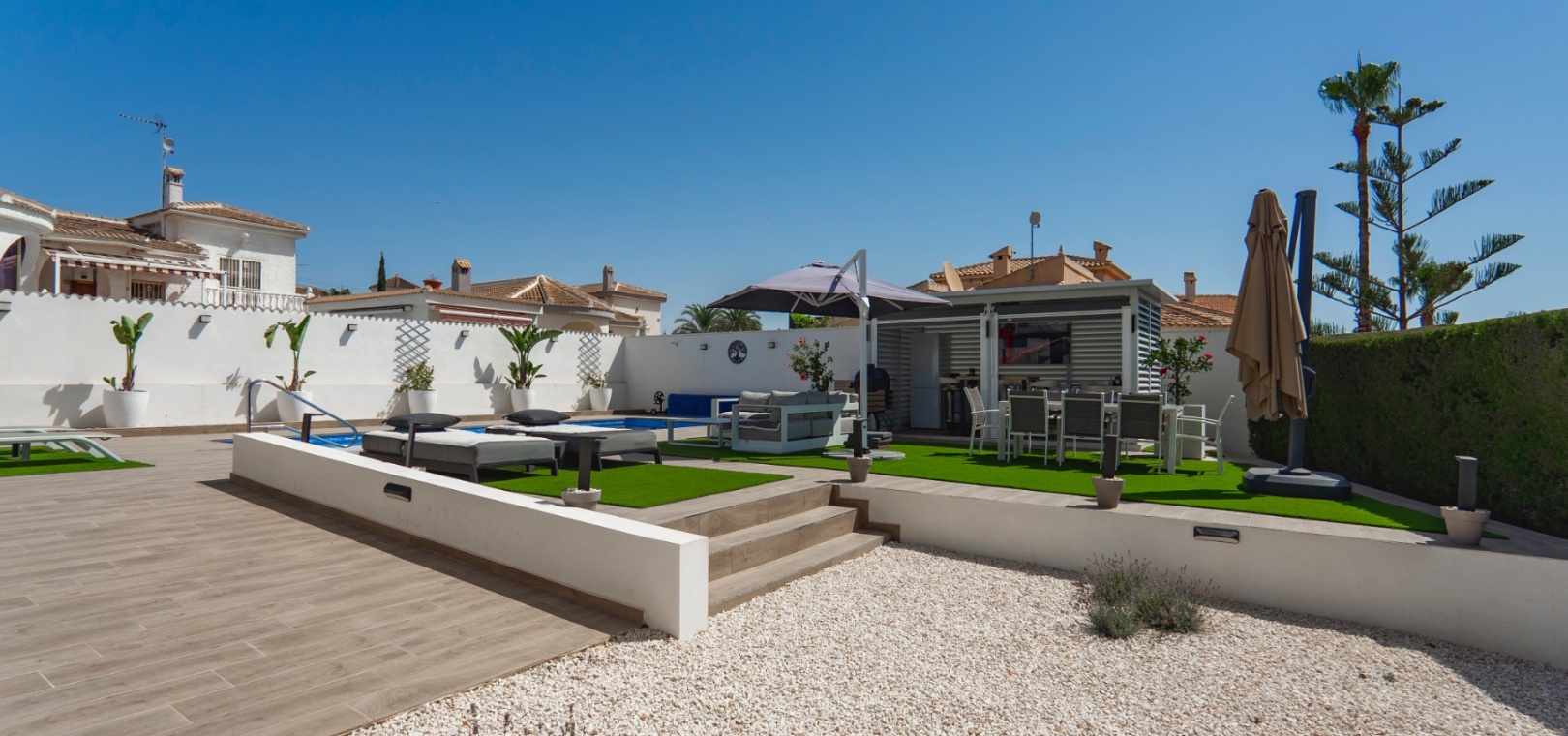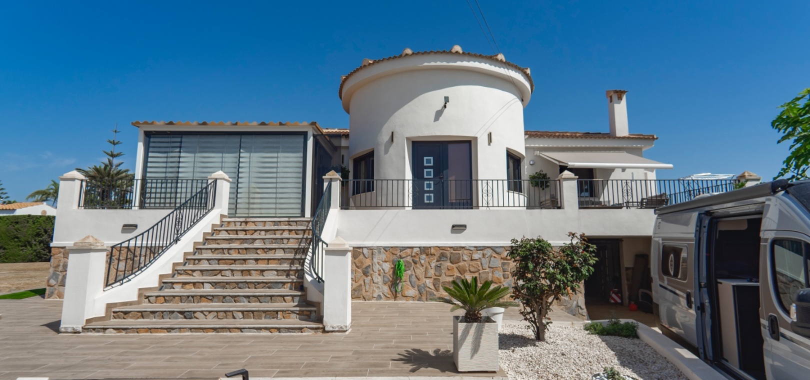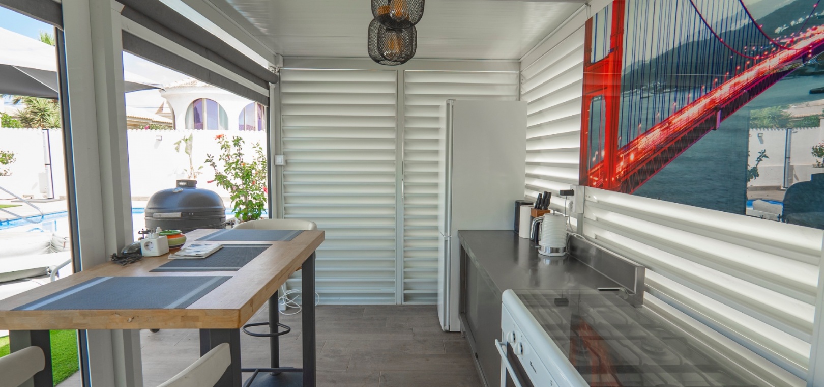 Exceptionell villa som blandar modern komfort med tidlös medelhavselegans — Förhöjd sjö- och havsutsikt Denna exceptionella villa blandar mästerligt moderna bekvämligheter med tidlös medelhavsarkitektur och skapar en lyxig tillflyktsort bara några steg från stadens centrum – men ändå perfekt avskilt för maximal avskildhet. Eleganta stendetaljer, klassiska vita fasader och moderna, rena linjer förstärker hemmets sofistikerade karaktär. Belägen på en upphöjd tomt har fastigheten panoramautsikt över det omgivande naturlandskapet, saltsjöar och till och med det avlägsna Medelhavet, vilket erbjuder en unik känsla av öppenhet och lugn som sällan finns så nära staden. Viktiga funktioner Tre sovrum med eget badrumVarje sovrum erbjuder generösa proportioner, inbyggda garderober och privata badrum i premiuminredning och natursten. Öppen planlösningEn sömlös planlösning förenar vardagsrum, matsal och vardagsrum under höga tak och översvämmar interiören med naturligt ljus. Skjutdörrar ansluter till ett vinterrum omgivet av glasgardiner – perfekt för avkoppling året runt och för att njuta av den vidsträckta utsikten. Gourmetkök och tvättstugaDet eleganta, fullt utrustade köket kompletteras av en separat tvättstuga och en praktisk gästtoalett. Dubbla uppfarter och säker parkeringTvå oberoende grindar ger flexibel åtkomst. Under villan finns ett rymligt garage som rymmer flera fordon. Med förbehåll för ytterligare grävning kan det utökas till en fullstor källare som passar för gym, biograf eller ytterligare gästsviter. Underhållning utomhus Uppvärmd pool kantad av rymliga solterrasser Sommarkök och inbyggd grill för uteservering Dusch vid poolen och utomhus-WC Gräsmatta på motsatt sida – för närvarande en tom duk för landskapsarkitektur, sport eller lek Expansionspotential Befintligt bygglov möjliggör ett fristående gästhus med upp till tre sovrum. Tomten kan också lagligen segregeras, vilket erbjuder attraktiva möjligheter för framtida utveckling eller återförsäljning. Läge Beläget i ett förstklassigt läge med "bäst av två världar", ligger fastigheten i hjärtat av staden – inom gångavstånd till kaféer, butiker och viktiga tjänster – men ändå diskret undangömd på en lugn gata, vilket garanterar lugn, avskildhet och vidsträckt utsikt över sjön och havet. Investeringsattraktion Oavsett om den är tänkt som ett prestigefyllt permanent boende, en lyxig semester eller en högavkastande hyresinvestering, representerar denna villa en sällsynt möjlighet i ett oslagbart läge, med potential att öka värdet ytterligare över tid. Boka din privata visning idag för att uppleva dess fulla potential.