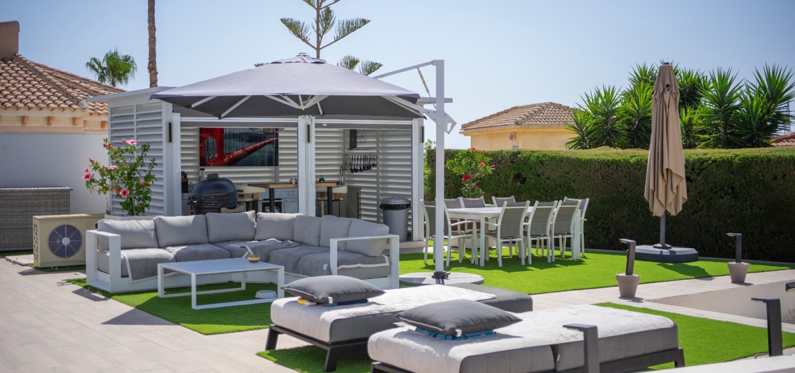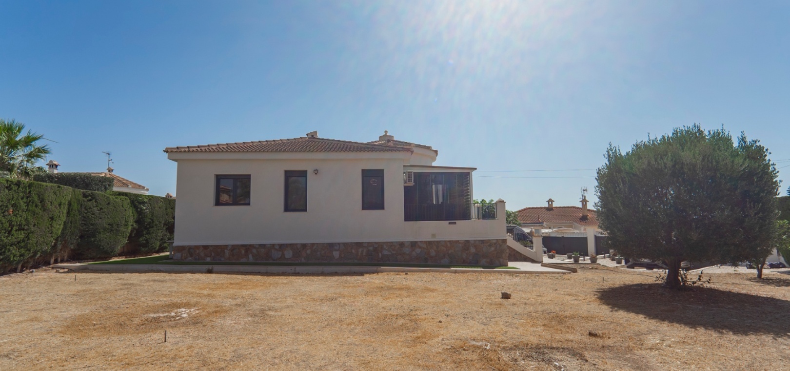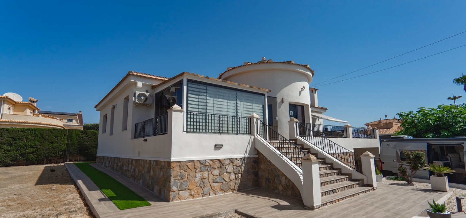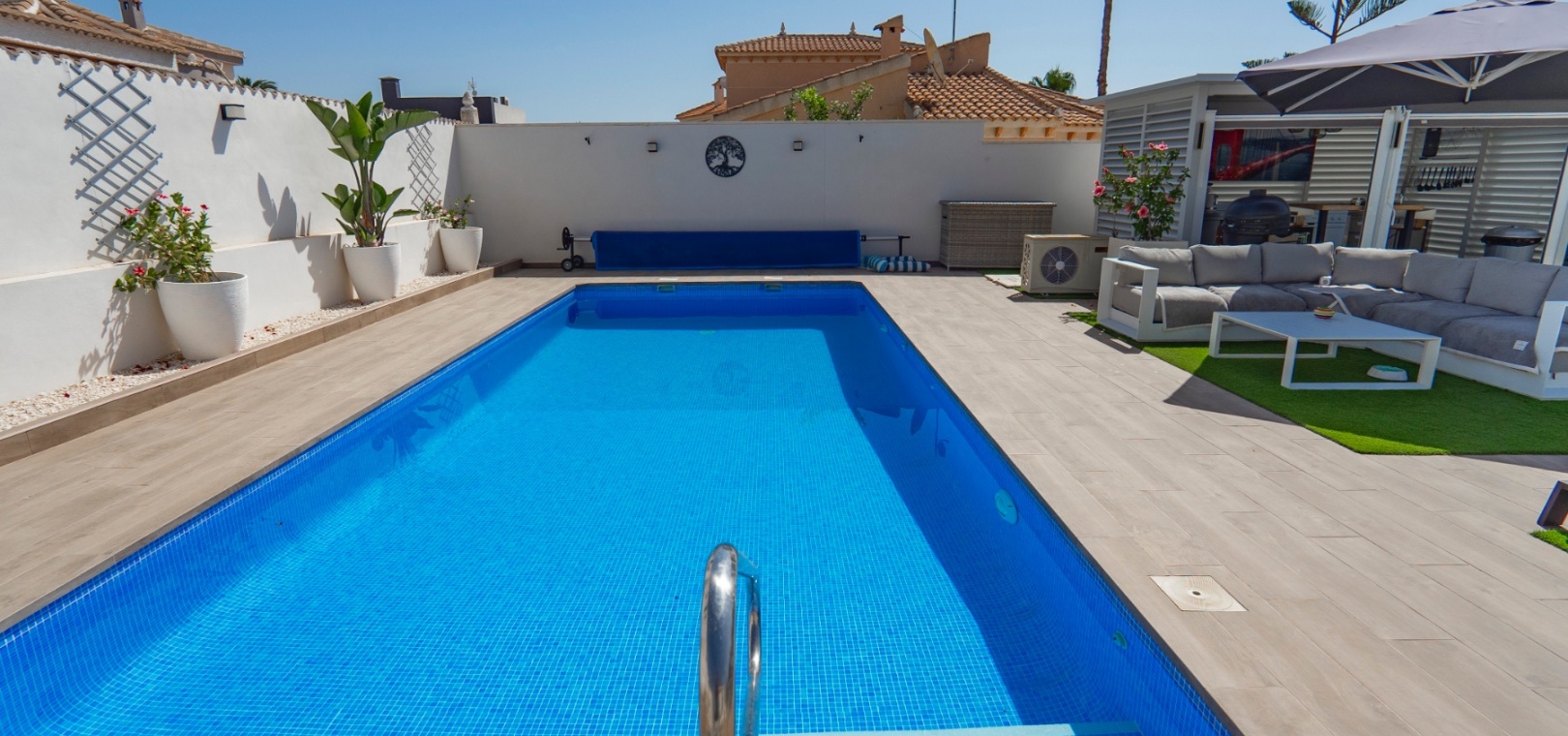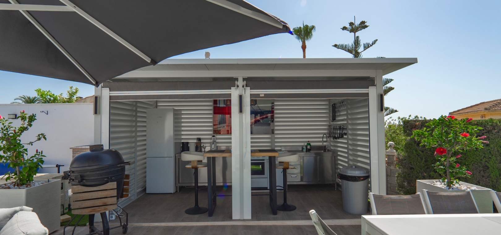 Exceptionell villa som blandar modern komfort med tidlös medelhavselegans — Förhöjd sjö- och havsutsikt Denna exceptionella villa blandar mästerligt moderna bekvämligheter med tidlös medelhavsarkitektur och skapar en lyxig tillflyktsort bara några steg från stadens centrum – men ändå perfekt avskilt för maximal avskildhet. Eleganta stendetaljer, klassiska vita fasader och moderna, rena linjer förstärker hemmets sofistikerade karaktär. Belägen på en upphöjd tomt har fastigheten panoramautsikt över det omgivande naturlandskapet, saltsjöar och till och med det avlägsna Medelhavet, vilket erbjuder en unik känsla av öppenhet och lugn som sällan finns så nära staden. Viktiga funktioner Tre sovrum med eget badrumVarje sovrum erbjuder generösa proportioner, inbyggda garderober och privata badrum i premiuminredning och natursten. Öppen planlösningEn sömlös planlösning förenar vardagsrum, matsal och vardagsrum under höga tak och översvämmar interiören med naturligt ljus. Skjutdörrar ansluter till ett vinterrum omgivet av glasgardiner – perfekt för avkoppling året runt och för att njuta av den vidsträckta utsikten. Gourmetkök och tvättstugaDet eleganta, fullt utrustade köket kompletteras av en separat tvättstuga och en praktisk gästtoalett. Dubbla uppfarter och säker parkeringTvå oberoende grindar ger flexibel åtkomst. Under villan finns ett rymligt garage som rymmer flera fordon. Med förbehåll för ytterligare grävning kan det utökas till en fullstor källare som passar för gym, biograf eller ytterligare gästsviter. Underhållning utomhus Uppvärmd pool kantad av rymliga solterrasser Sommarkök och inbyggd grill för uteservering Dusch vid poolen och utomhus-WC Gräsmatta på motsatt sida – för närvarande en tom duk för landskapsarkitektur, sport eller lek Expansionspotential Befintligt bygglov möjliggör ett fristående gästhus med upp till tre sovrum. Tomten kan också lagligen segregeras, vilket erbjuder attraktiva möjligheter för framtida utveckling eller återförsäljning. Läge Beläget i ett förstklassigt läge med "bäst av två världar", ligger fastigheten i hjärtat av staden – inom gångavstånd till kaféer, butiker och viktiga tjänster – men ändå diskret undangömd på en lugn gata, vilket garanterar lugn, avskildhet och vidsträckt utsikt över sjön och havet. Investeringsattraktion Oavsett om den är tänkt som ett prestigefyllt permanent boende, en lyxig semester eller en högavkastande hyresinvestering, representerar denna villa en sällsynt möjlighet i ett oslagbart läge, med potential att öka värdet ytterligare över tid. Boka din privata visning idag för att uppleva dess fulla potential.