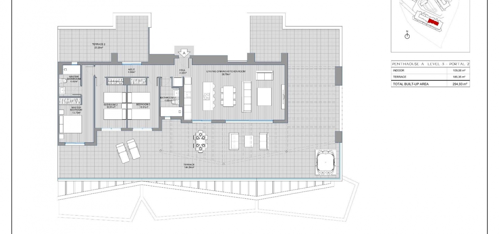 De anlagda områdena och de hängande trädgårdarna omsluter de privata faciliteterna i bostadskomplexet: