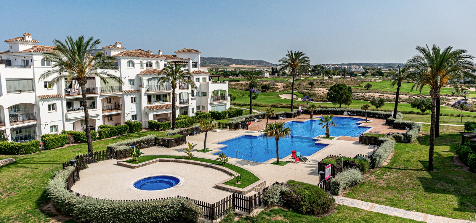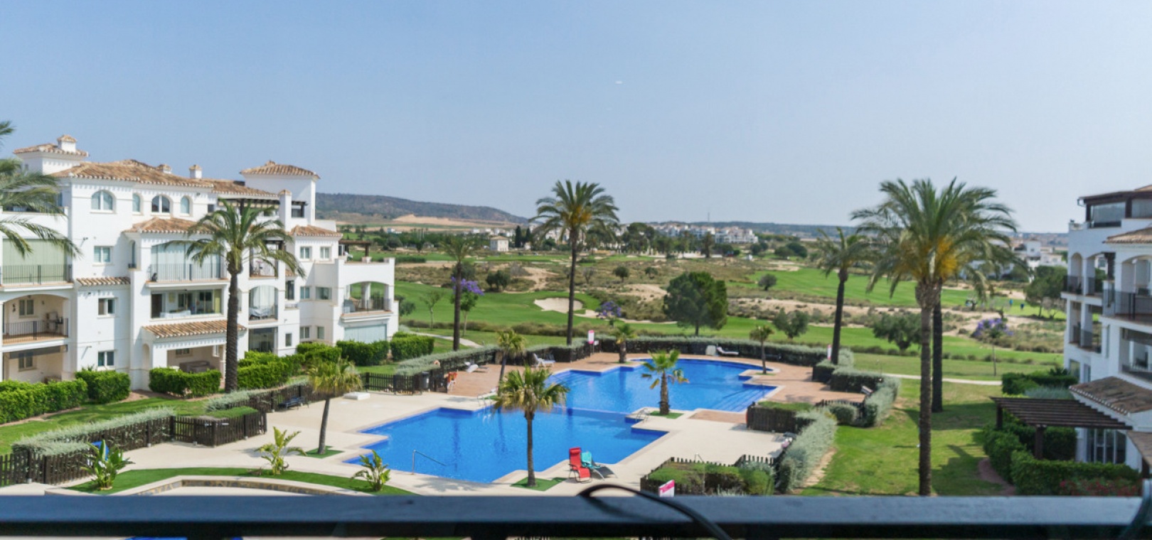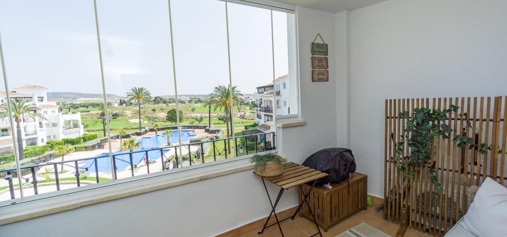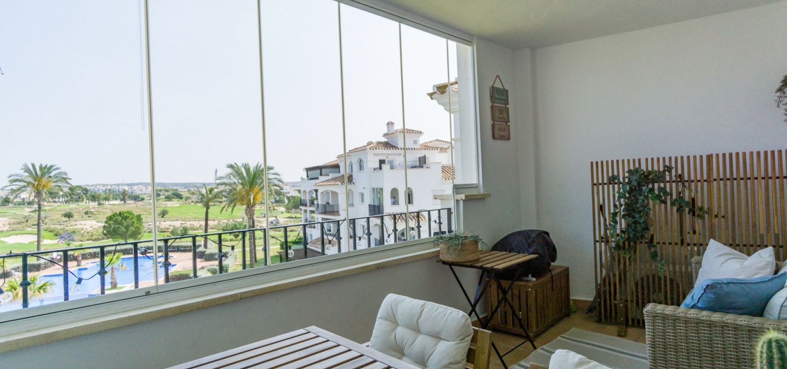 Helrenoverad lägenhet till salu på Hacienda Riquelme Golf Resort, Sucina, Murcia. Lägenheten erbjuder 2 dubbelrum (båda sovrummen har fransk balkong), 1 modernt badrum med dusch, rymligt vardagsrum/matrum med inglasad terrass med fantastisk utsikt över de gemensamma trädgårdarna, poolen och själva golfbanan, plus ett separat fullt utrustat kök. Fastigheten säljs helrenoverad och är redo att användas med många lyxiga extrafunktioner och detaljer. Hacienda Riquelme Golf Resort är ett familjevänligt semester-, golf- och fritidsanläggning belägen mellan bergen och Medelhavet. Med en kompromisslös Nicklaus-design har den 18-håls, par 72-golfbanan i linksstil byggts enligt mästerskapsstandard. Den erbjuder en lugn miljö för dem som vill koppla av i sina lyxiga trädgårdar och pooler, samtidigt som den erbjuder en mängd olika fritidsfaciliteter för dem som gillar att hålla sig aktiva med slag som försvåras av böljande fairways, bunkerhinder, vildgräs, olivträd och stora sjöar. Mar Menor och lokala stränder kan nås på under 20 minuter. Den vänliga och typiska spanska byn Sucina med sina barer, restauranger och kyrktorg ligger bara några minuter bort med bil. Murcias internationella flygplats ligger cirka 20 minuter bort med bil. Ett perfekt hem för både golfentusiaster och semesterfirare. Kontakta oss idag för en visning.