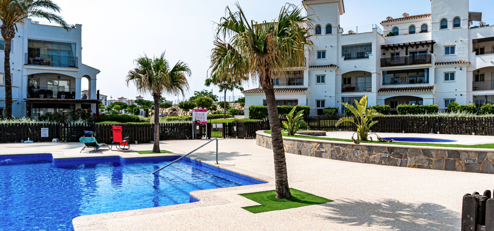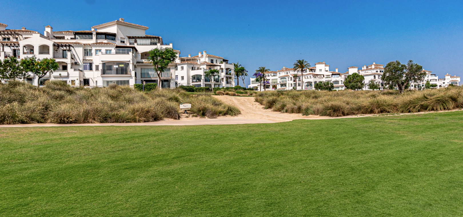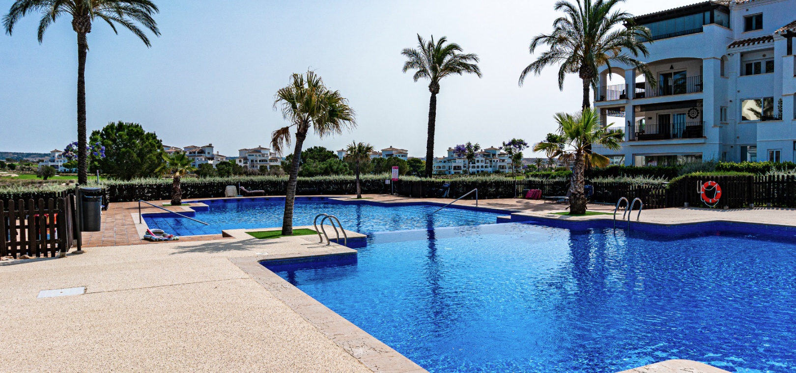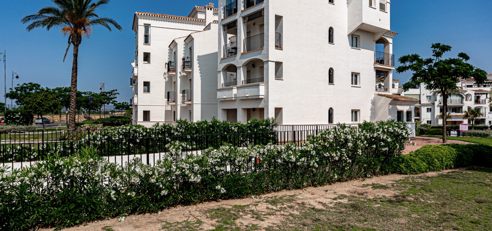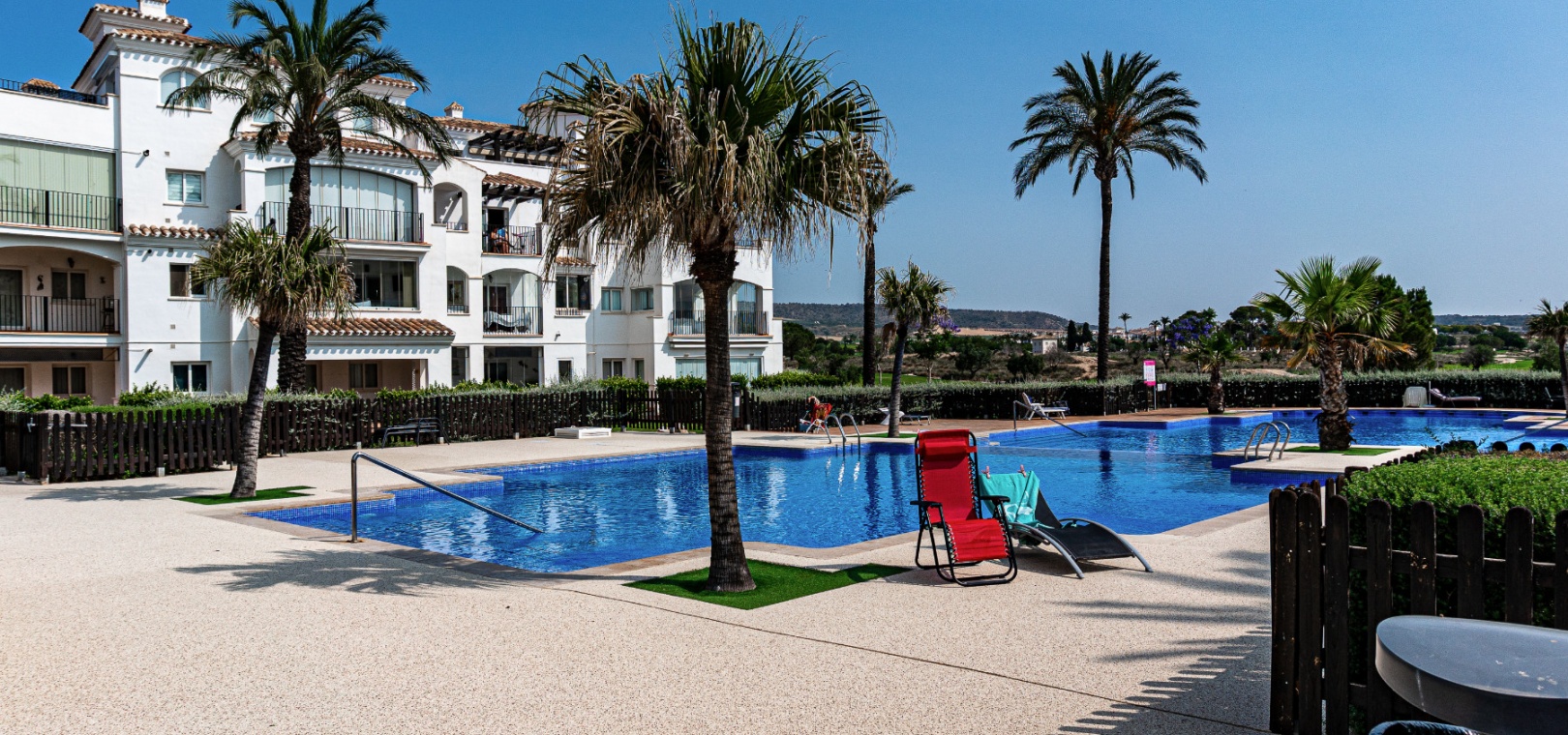 Helrenoverad lägenhet till salu på Hacienda Riquelme Golf Resort, Sucina, Murcia. Lägenheten erbjuder 2 dubbelrum (båda sovrummen har fransk balkong), 1 modernt badrum med dusch, rymligt vardagsrum/matrum med inglasad terrass med fantastisk utsikt över de gemensamma trädgårdarna, poolen och själva golfbanan, plus ett separat fullt utrustat kök. Fastigheten säljs helrenoverad och är redo att användas med många lyxiga extrafunktioner och detaljer. Hacienda Riquelme Golf Resort är ett familjevänligt semester-, golf- och fritidsanläggning belägen mellan bergen och Medelhavet. Med en kompromisslös Nicklaus-design har den 18-håls, par 72-golfbanan i linksstil byggts enligt mästerskapsstandard. Den erbjuder en lugn miljö för dem som vill koppla av i sina lyxiga trädgårdar och pooler, samtidigt som den erbjuder en mängd olika fritidsfaciliteter för dem som gillar att hålla sig aktiva med slag som försvåras av böljande fairways, bunkerhinder, vildgräs, olivträd och stora sjöar. Mar Menor och lokala stränder kan nås på under 20 minuter. Den vänliga och typiska spanska byn Sucina med sina barer, restauranger och kyrktorg ligger bara några minuter bort med bil. Murcias internationella flygplats ligger cirka 20 minuter bort med bil. Ett perfekt hem för både golfentusiaster och semesterfirare. Kontakta oss idag för en visning.