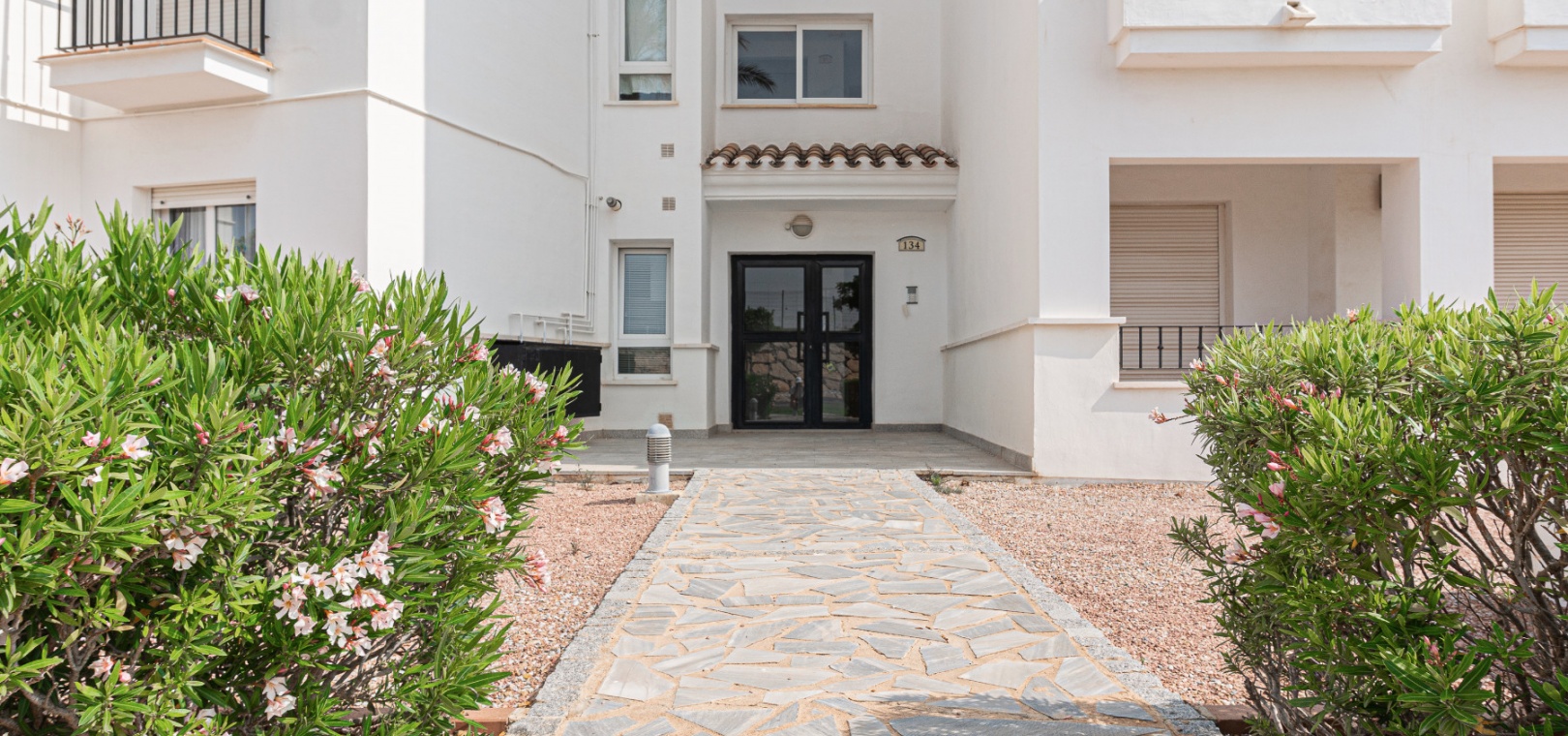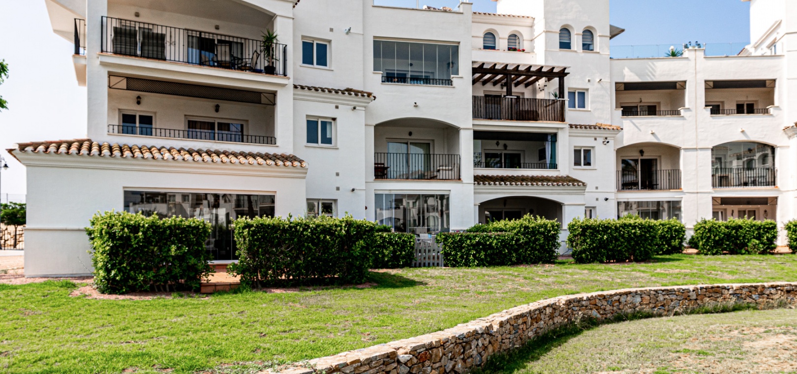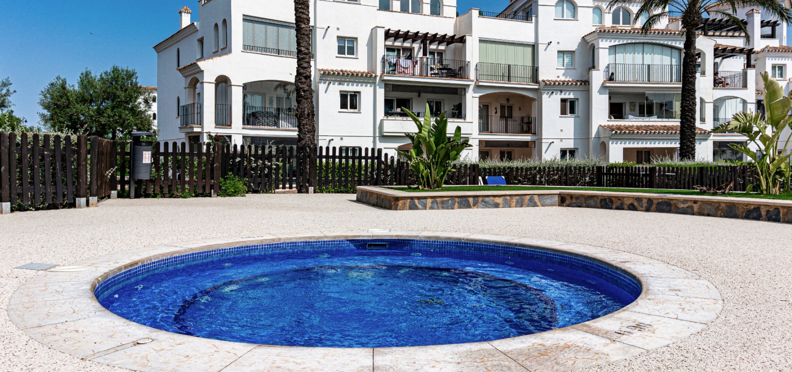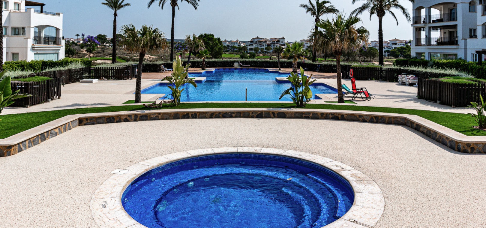 Helrenoverad lägenhet till salu på Hacienda Riquelme Golf Resort, Sucina, Murcia. Lägenheten erbjuder 2 dubbelrum (båda sovrummen har fransk balkong), 1 modernt badrum med dusch, rymligt vardagsrum/matrum med inglasad terrass med fantastisk utsikt över de gemensamma trädgårdarna, poolen och själva golfbanan, plus ett separat fullt utrustat kök. Fastigheten säljs helrenoverad och är redo att användas med många lyxiga extrafunktioner och detaljer. Hacienda Riquelme Golf Resort är ett familjevänligt semester-, golf- och fritidsanläggning belägen mellan bergen och Medelhavet. Med en kompromisslös Nicklaus-design har den 18-håls, par 72-golfbanan i linksstil byggts enligt mästerskapsstandard. Den erbjuder en lugn miljö för dem som vill koppla av i sina lyxiga trädgårdar och pooler, samtidigt som den erbjuder en mängd olika fritidsfaciliteter för dem som gillar att hålla sig aktiva med slag som försvåras av böljande fairways, bunkerhinder, vildgräs, olivträd och stora sjöar. Mar Menor och lokala stränder kan nås på under 20 minuter. Den vänliga och typiska spanska byn Sucina med sina barer, restauranger och kyrktorg ligger bara några minuter bort med bil. Murcias internationella flygplats ligger cirka 20 minuter bort med bil. Ett perfekt hem för både golfentusiaster och semesterfirare. Kontakta oss idag för en visning.