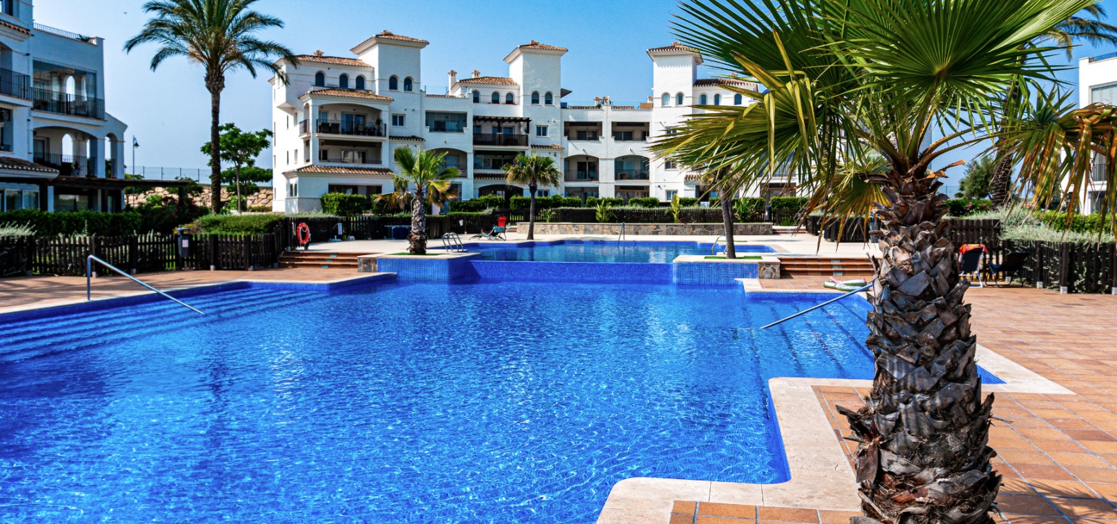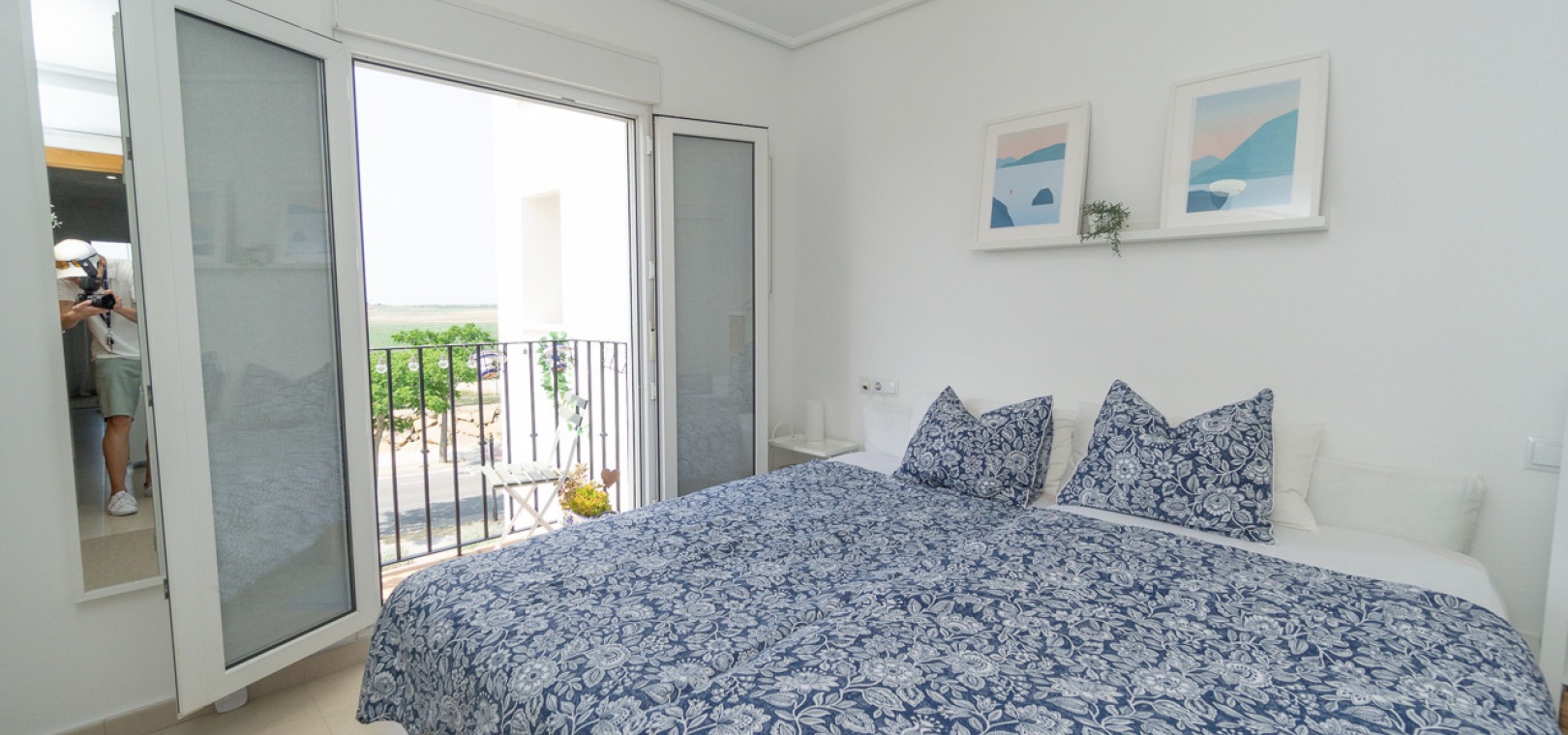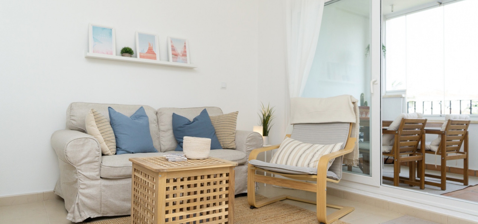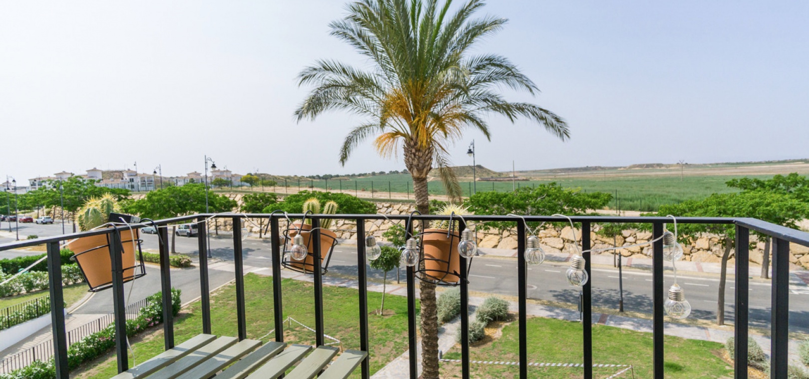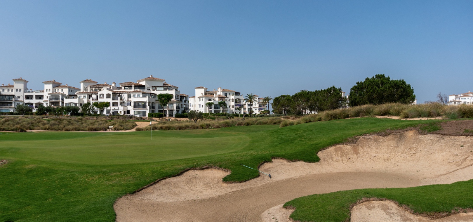 Helrenoverad lägenhet till salu på Hacienda Riquelme Golf Resort, Sucina, Murcia. Lägenheten erbjuder 2 dubbelrum (båda sovrummen har fransk balkong), 1 modernt badrum med dusch, rymligt vardagsrum/matrum med inglasad terrass med fantastisk utsikt över de gemensamma trädgårdarna, poolen och själva golfbanan, plus ett separat fullt utrustat kök. Fastigheten säljs helrenoverad och är redo att användas med många lyxiga extrafunktioner och detaljer. Hacienda Riquelme Golf Resort är ett familjevänligt semester-, golf- och fritidsanläggning belägen mellan bergen och Medelhavet. Med en kompromisslös Nicklaus-design har den 18-håls, par 72-golfbanan i linksstil byggts enligt mästerskapsstandard. Den erbjuder en lugn miljö för dem som vill koppla av i sina lyxiga trädgårdar och pooler, samtidigt som den erbjuder en mängd olika fritidsfaciliteter för dem som gillar att hålla sig aktiva med slag som försvåras av böljande fairways, bunkerhinder, vildgräs, olivträd och stora sjöar. Mar Menor och lokala stränder kan nås på under 20 minuter. Den vänliga och typiska spanska byn Sucina med sina barer, restauranger och kyrktorg ligger bara några minuter bort med bil. Murcias internationella flygplats ligger cirka 20 minuter bort med bil. Ett perfekt hem för både golfentusiaster och semesterfirare. Kontakta oss idag för en visning.