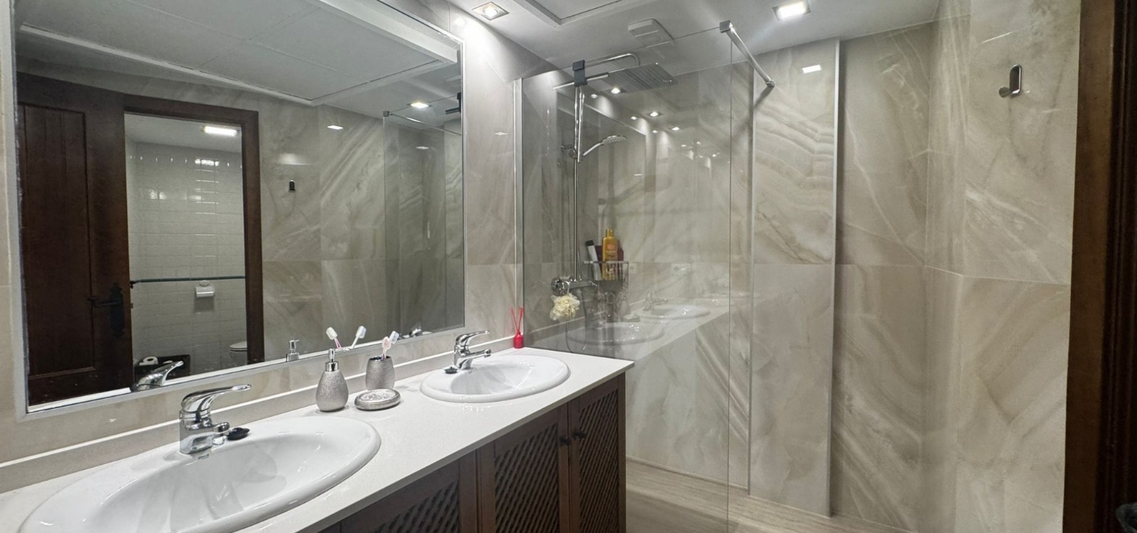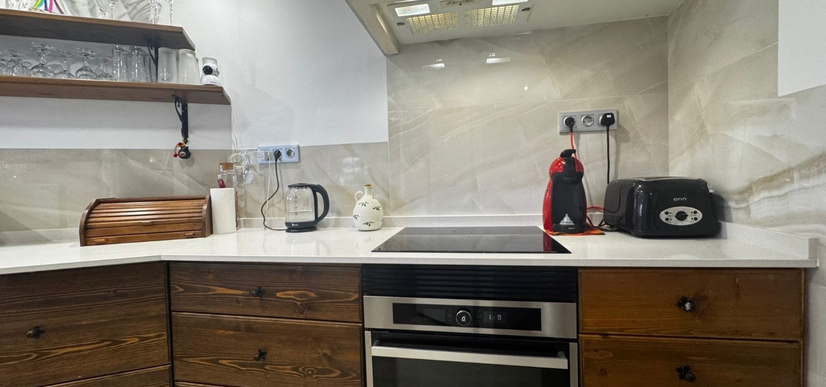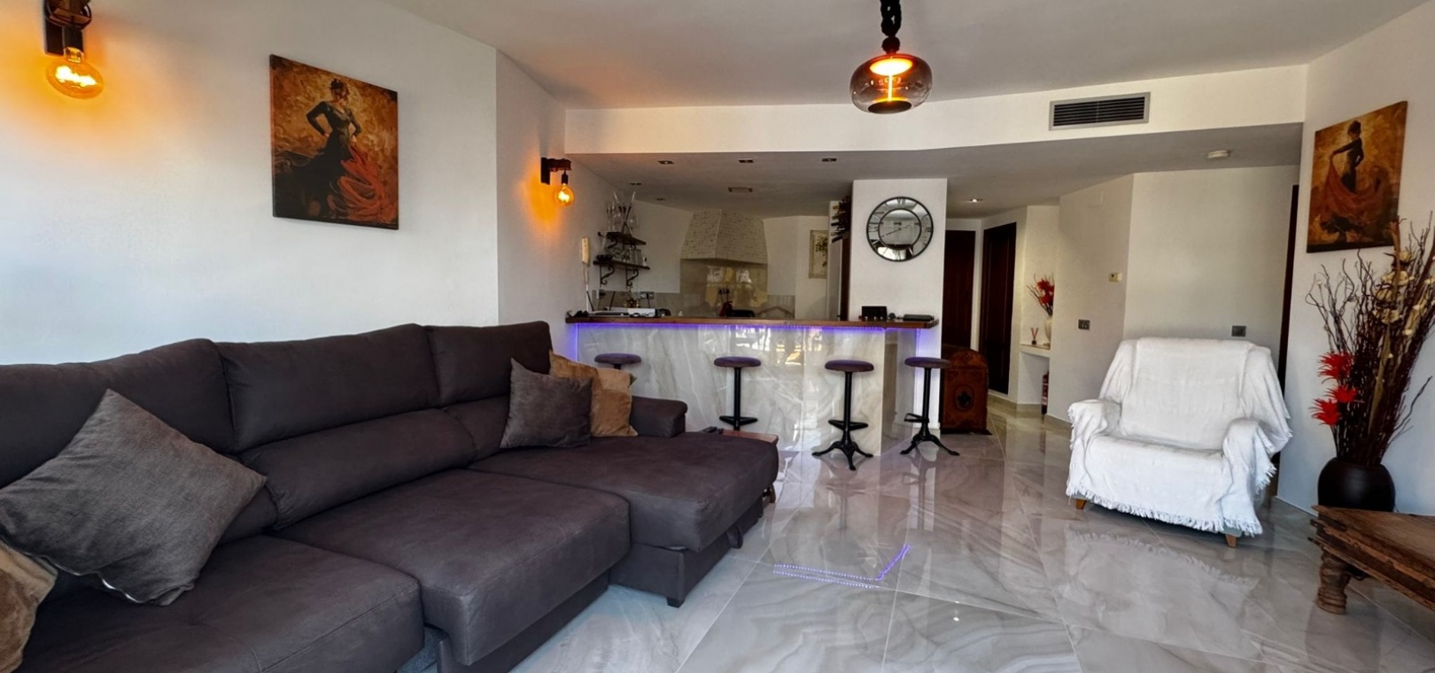 Lägenheten har genomgått en totalrenovering , inklusive fullständig elomläggning, dolda anslutningar för el, TV, radio och internet. Det rymliga vardagsrummet med öppen spis är integrerat med ett öppet kök i amerikansk stil med frukostbar, moderna vitvaror och elegant belysning. Golv och badrumskakel har också uppdaterats helt.