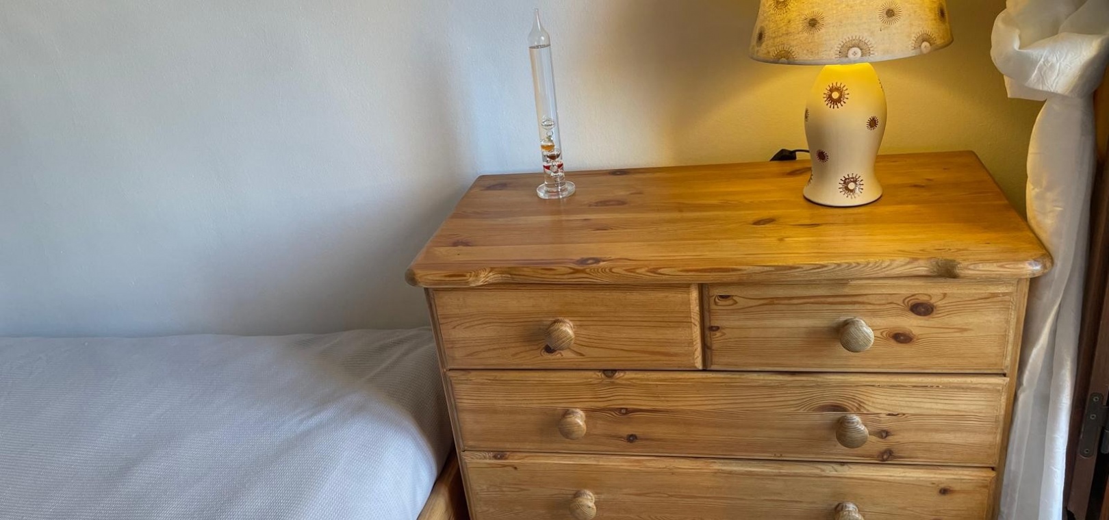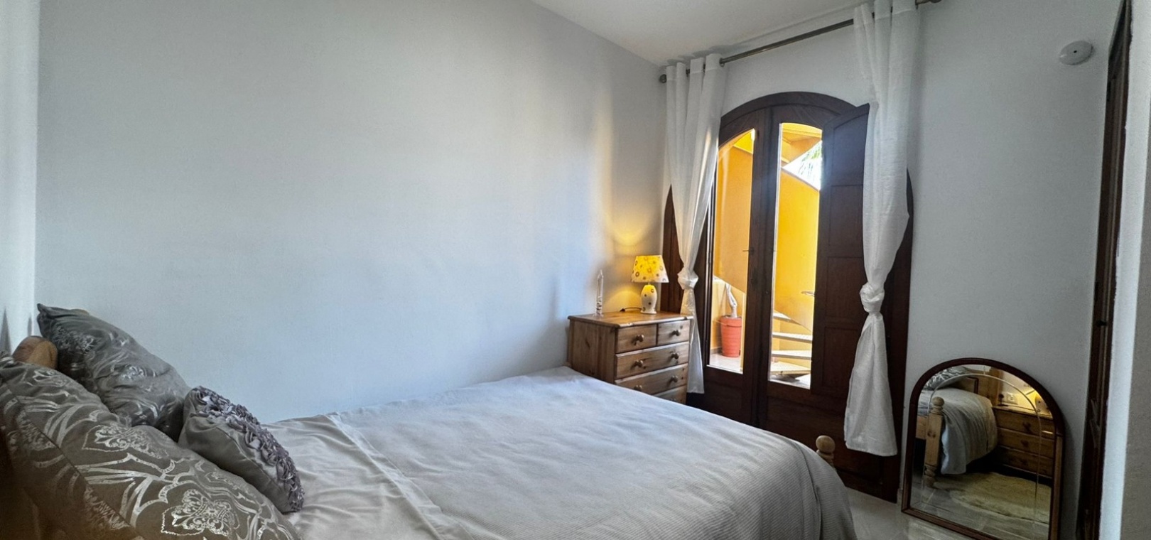 Till vänster om entrén hittar du två bekväma sovrum och ett badrum . Från vardagsrummet kommer du ut på en balkong som via en utvändig trappa leder till ditt privata takterrass med solterrass , komplett med förråd och havsutsikt – perfekt för solbad och avkoppling utomhus.
