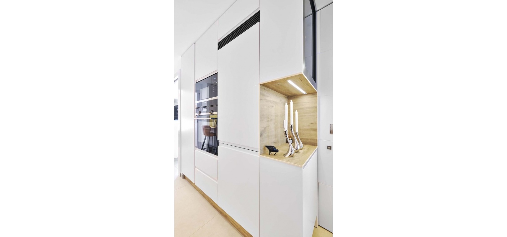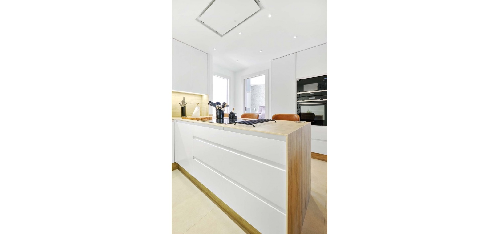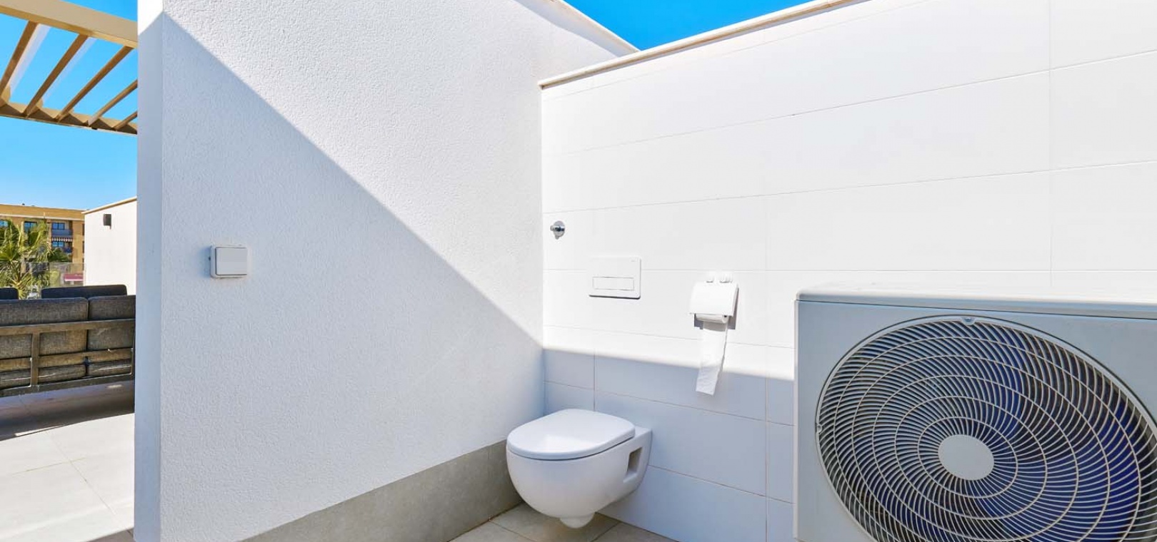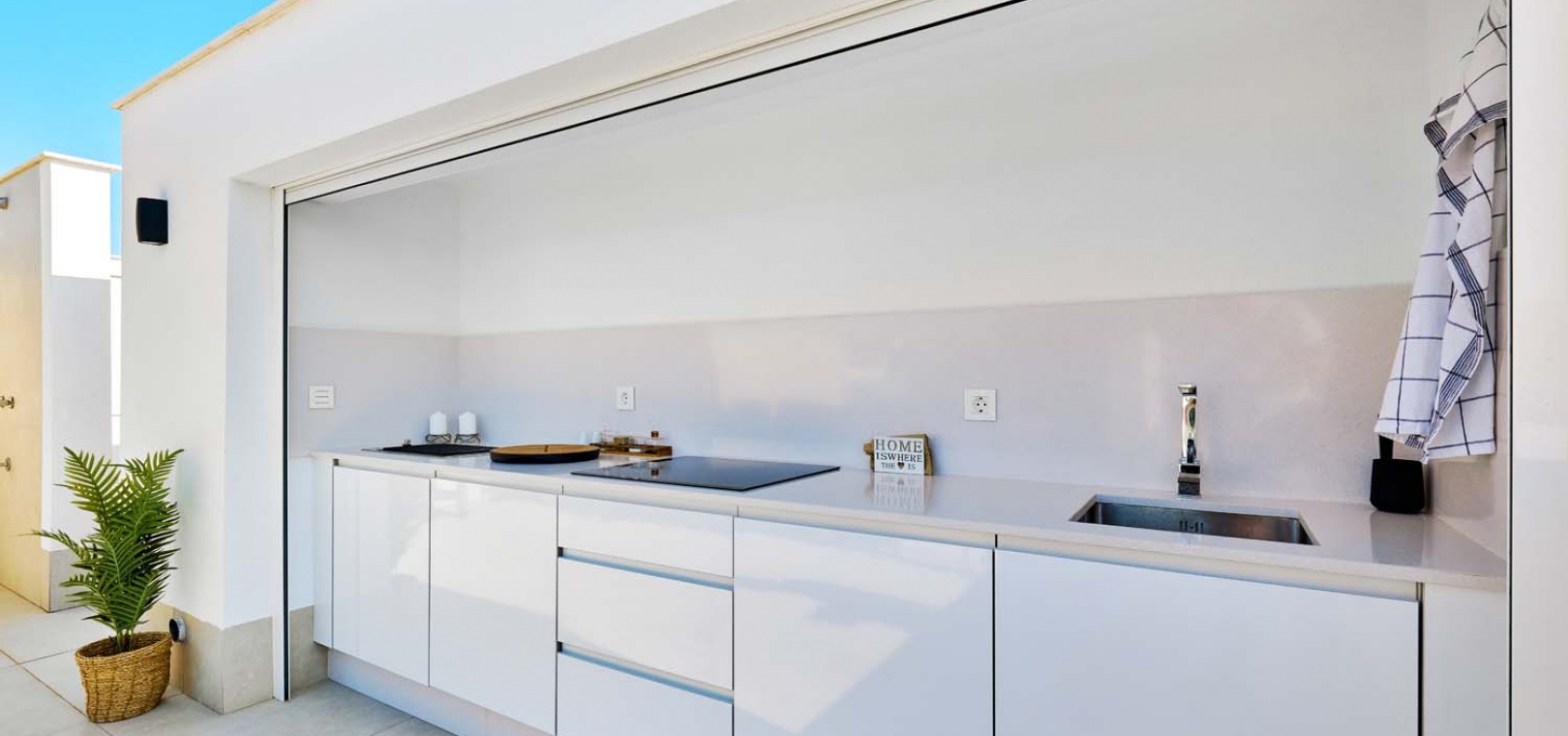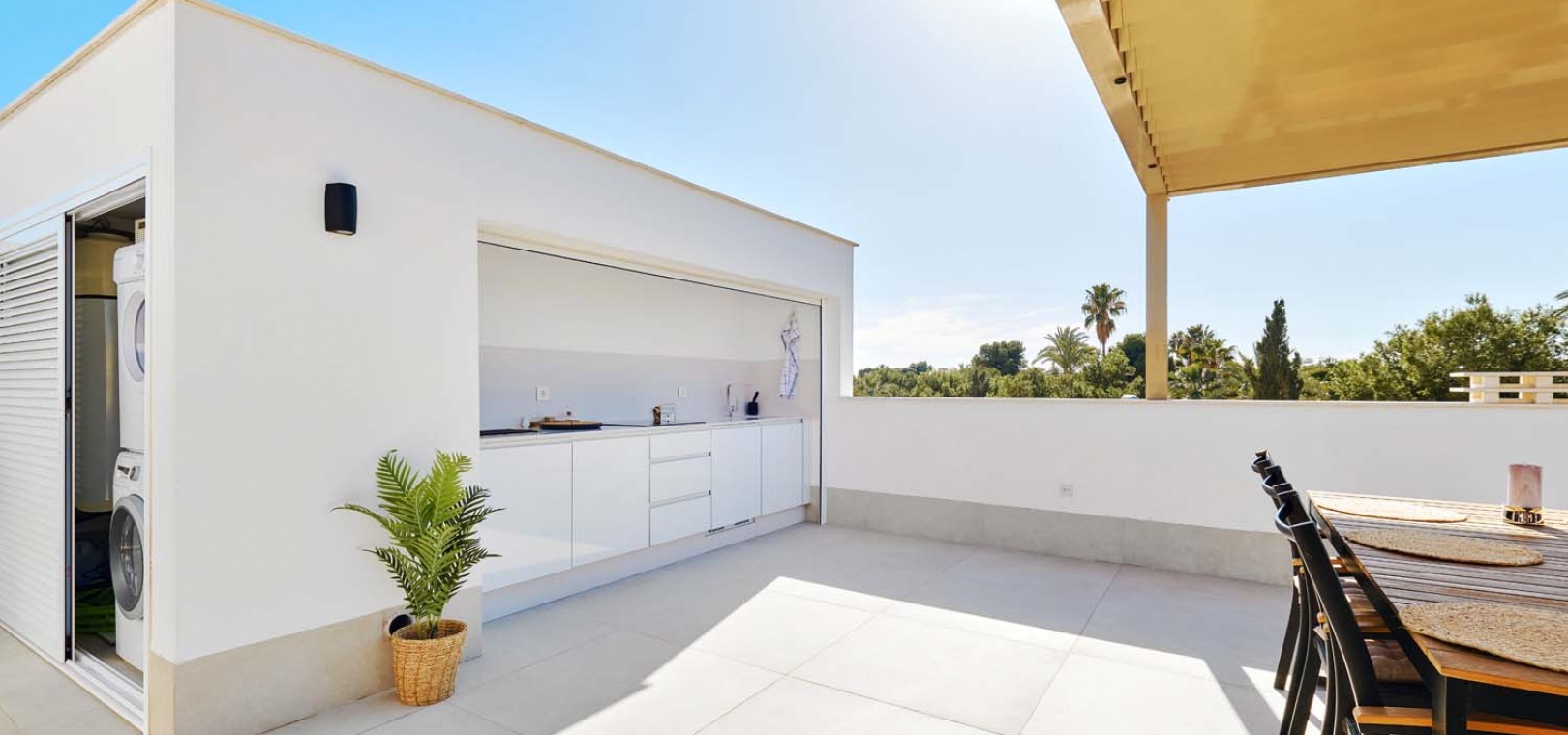 Från terrassen leder en utvändig trappa till en 70 m² stor privat takterrass, komplett med ett utekök (med elektrisk jalusi), tvättstuga, toalett och gott om plats för solbad och umgänge.