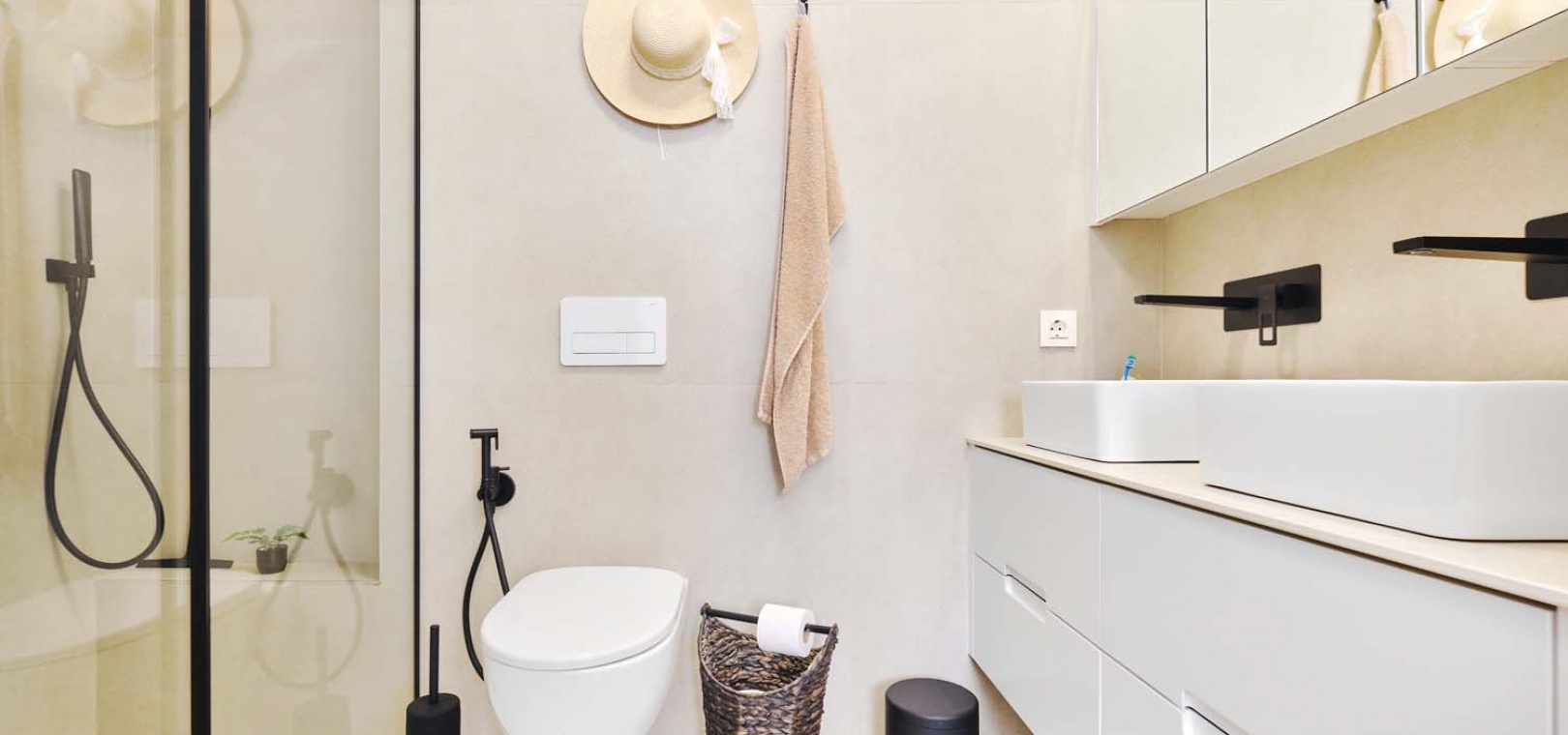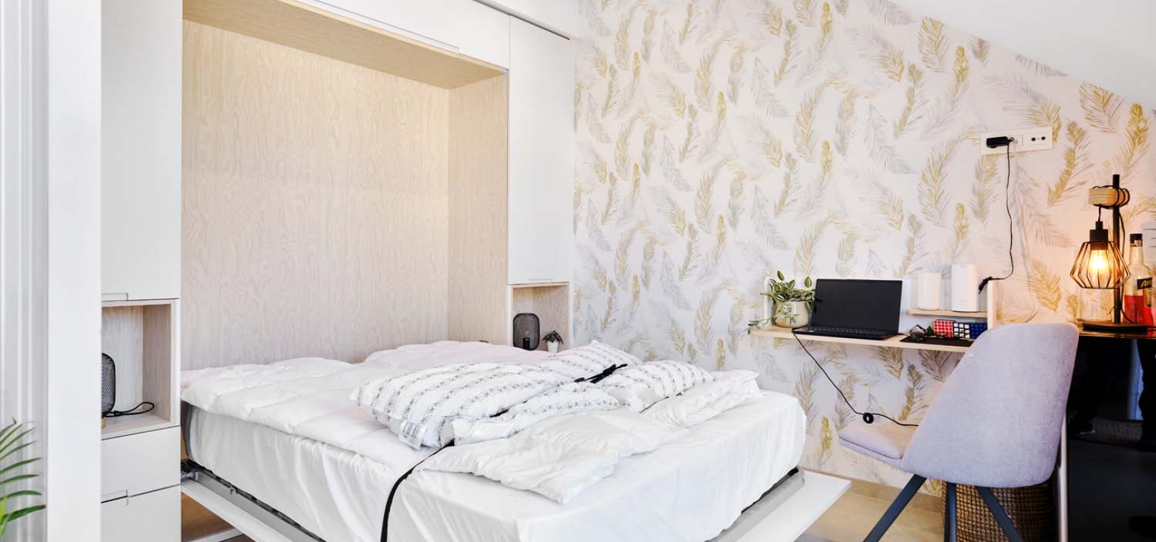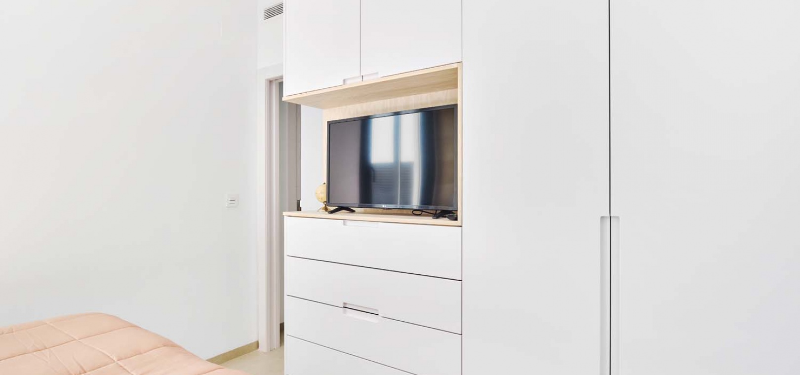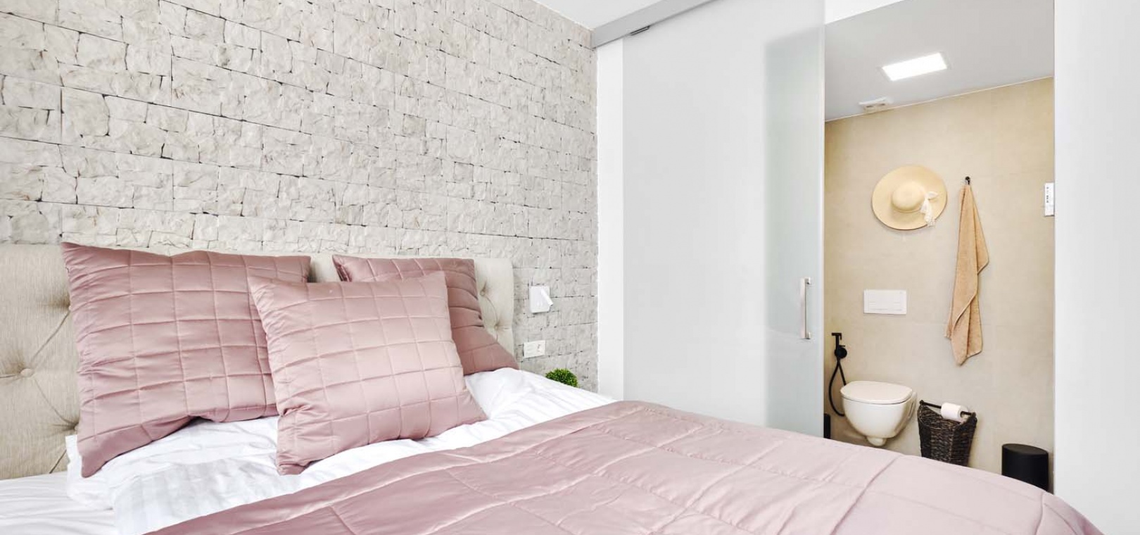 Det första dubbelrummet, som för närvarande används som arbetsrum, har en fällbar säng för gästerna. En hall leder till det andra sovrummet med inbyggda garderober, ett modernt familjebadrum med duschkabin och det stora sovrummet med eget badrum, även det med duschkabin.