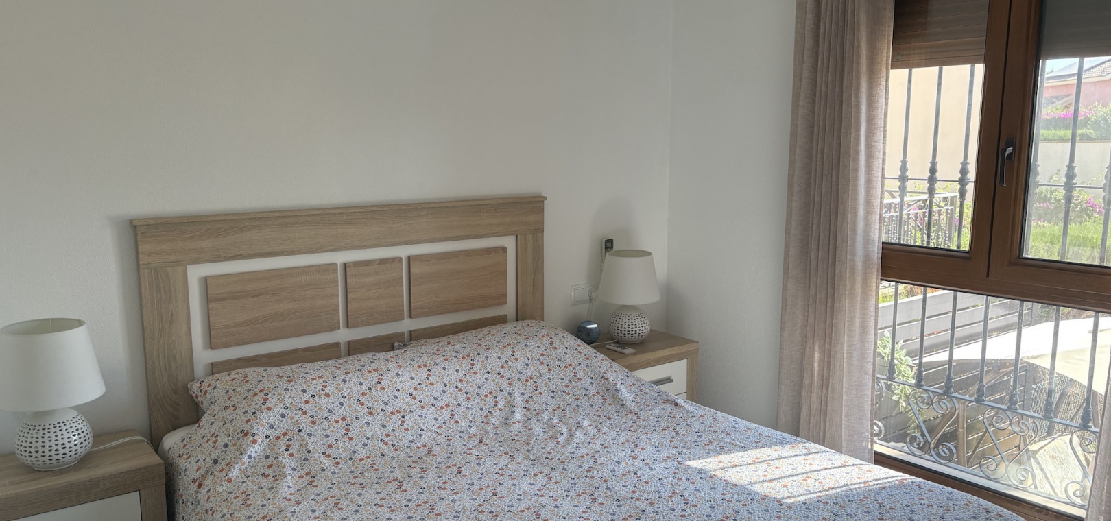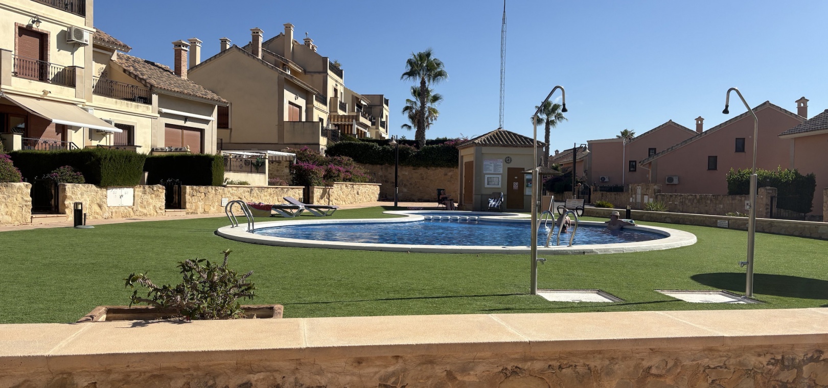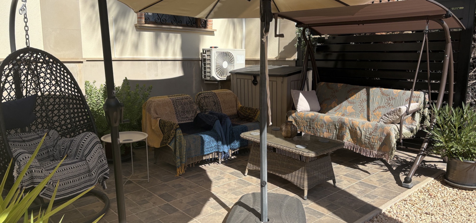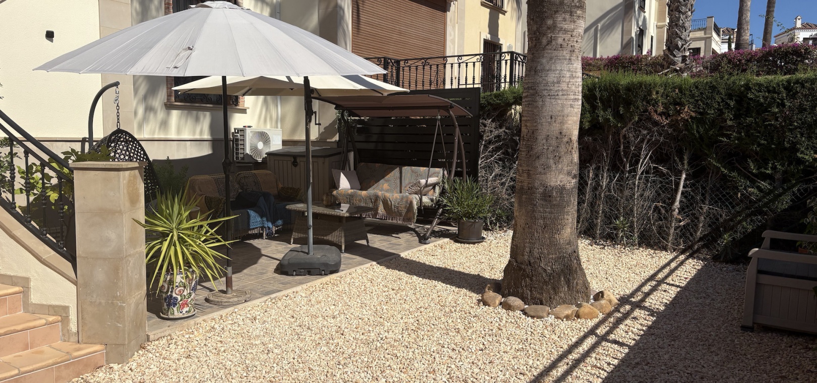 Denna extremt välpresenterade LOLA-bungalow i söderläge ligger i det exklusiva La Finca Golf-området. Denna fastighet erbjuder 65 kvadratmeter bekväm boyta, med 2 rymliga sovrum och 2 moderna badrum (ett en-suite). Huset är utformat med en öppen och ljus planlösning och ett välvt tak, vilket ger gott om naturligt ljus. Njut av bekvämligheten med en liten källare, vilket ger extra utrymme för förvaring eller en privat tillflyktsort. Bungalowen är utrustad med ett centralt luftkonditioneringssystem, vilket säkerställer en behaglig inomhustemperatur året runt. Omöblerad erbjuds du har flexibiliteten att skapa din ideala bostadsmiljö. Extrafunktioner inkluderar: elektriska jalusier i vardagsrummet, en gaskamin, luftkonditionering, takfläktar, utomhusförråd under trappan. Fastigheten ligger i ett vackert underhållet gated complex, vilket ger trygghet och sinnesro. De boende har också tillgång till en stor gemensam pool, perfekt för avkoppling och socialt umgänge. La Finca Golf är känt för sina frodiga gröna landskap, lugna lägen och välskötta omgivningar. Området erbjuder en lugn livsstil med golf, lokala butiker, kaféer och tjänster i närheten, vilket gör det idealiskt för både semesterfirare och året runt-boende. Denna tilltalande bungalow presenteras av Orange Casas, din pålitliga fastighetsmäklare i La Finca Golf. Kontakta oss idag för att boka en visning.