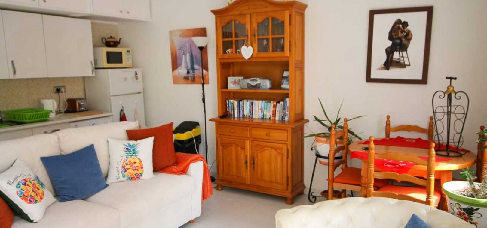 Beläget i ett säkert, gated community med gemensamma trädgårdar och pool Ljust vardagsrum/matsal med öppen planlösning i pentryt Sovrum med garderob och eget duschrum Läge på översta våningen i ett låghus (endast bottenvåningen och översta våningen) Säljs fullt möblerad med vitvaror – inflyttningsklar