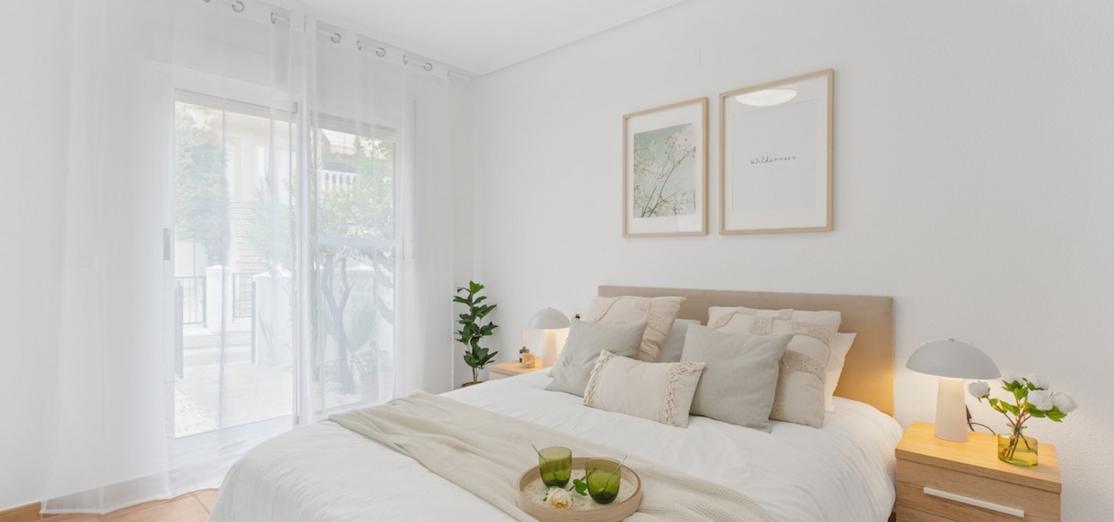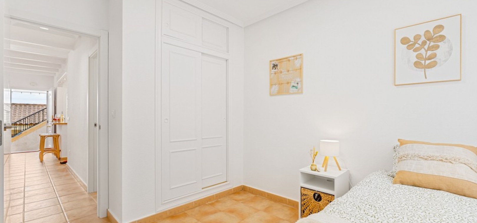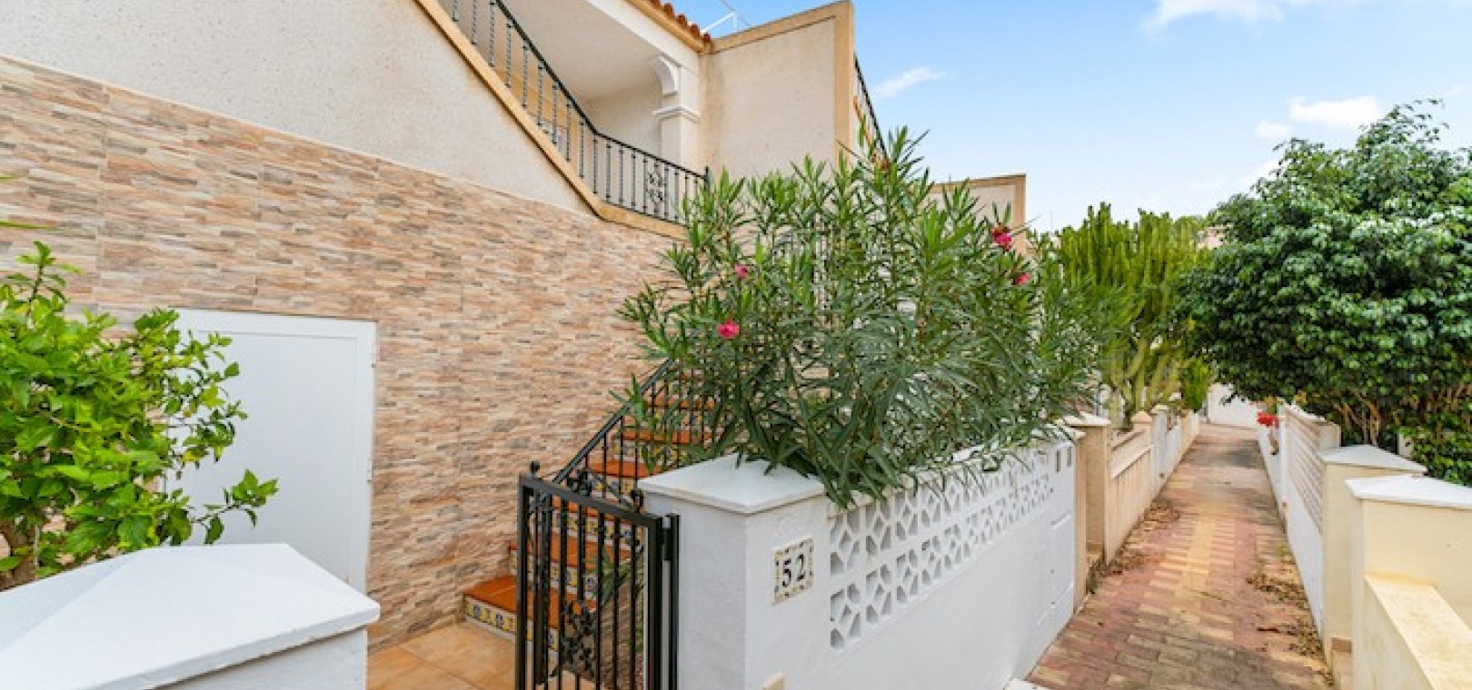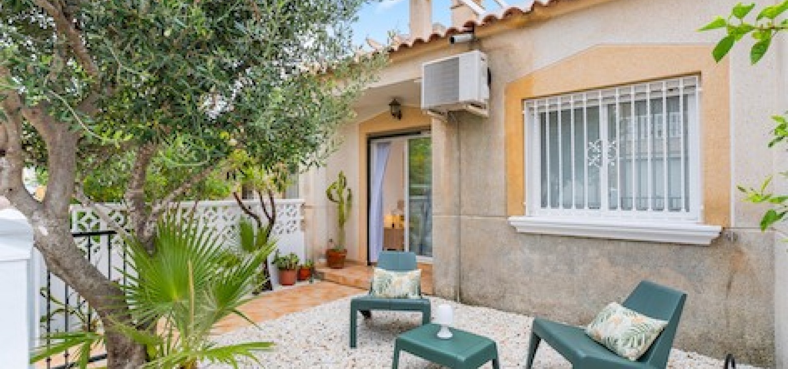 Fastigheten är extremt välpresenterad och har en trädgård på fram- och baksidan som ger gott om plats att sitta och njuta av vädret. Inuti har fastigheten två sovrum, ett badrum, vardagsrum/matsal och kök. Den har luftkonditionering och en öppen spis i vardagsrummet. Det finns också ett stort takterrass, nås via en utvändig trappa, som har konstgräs.