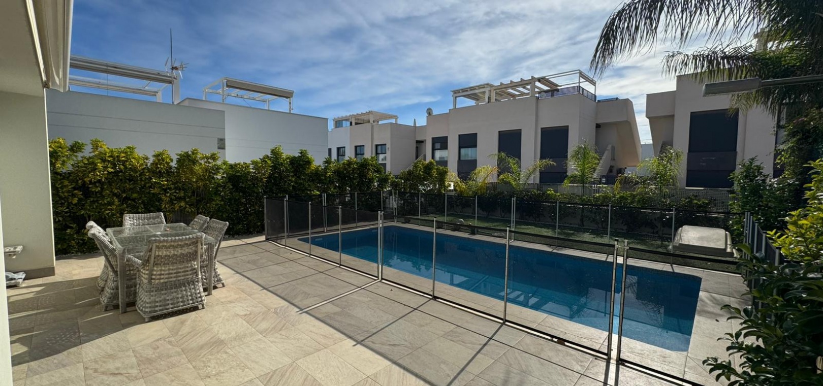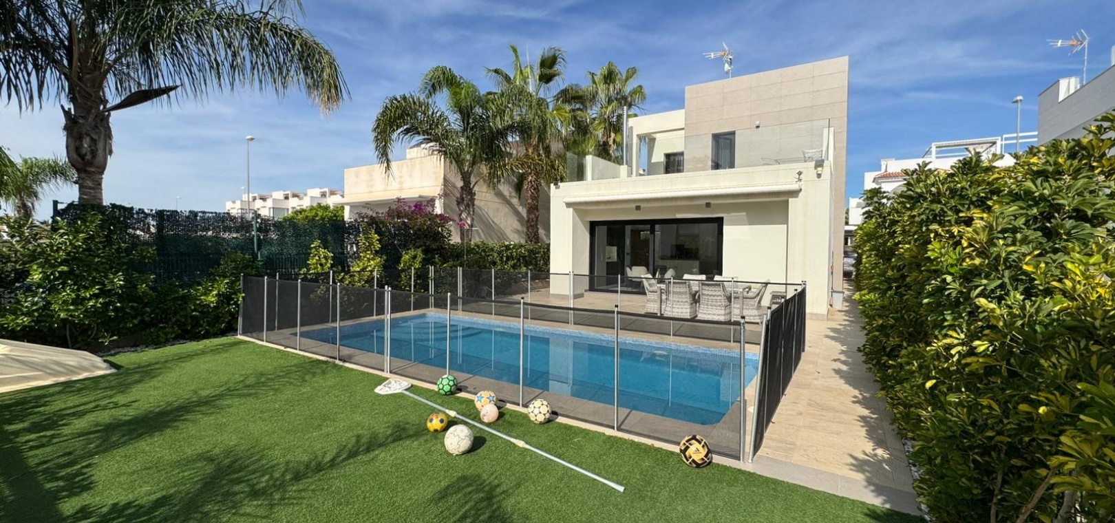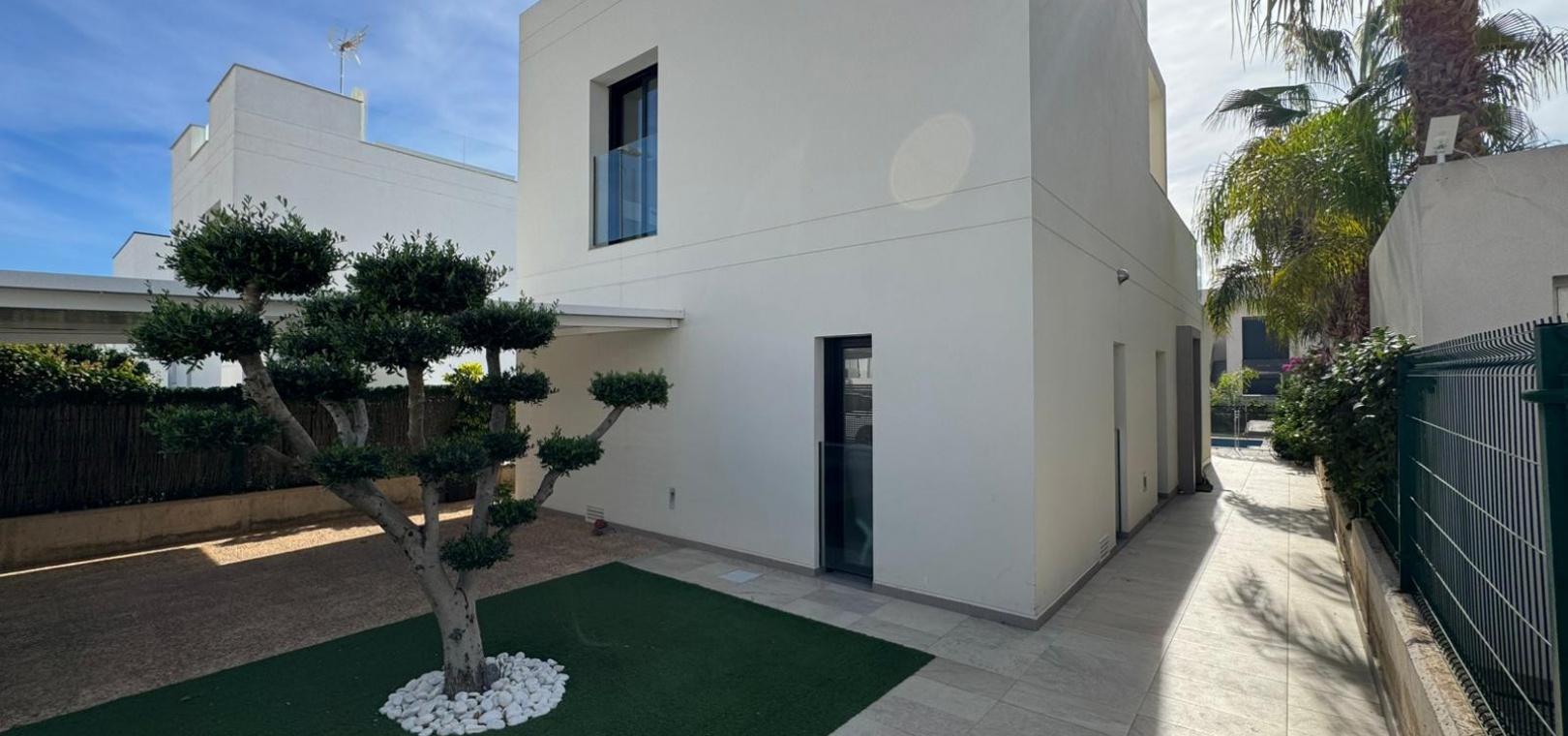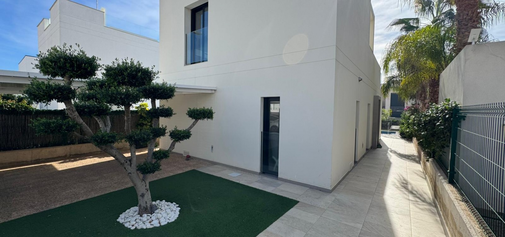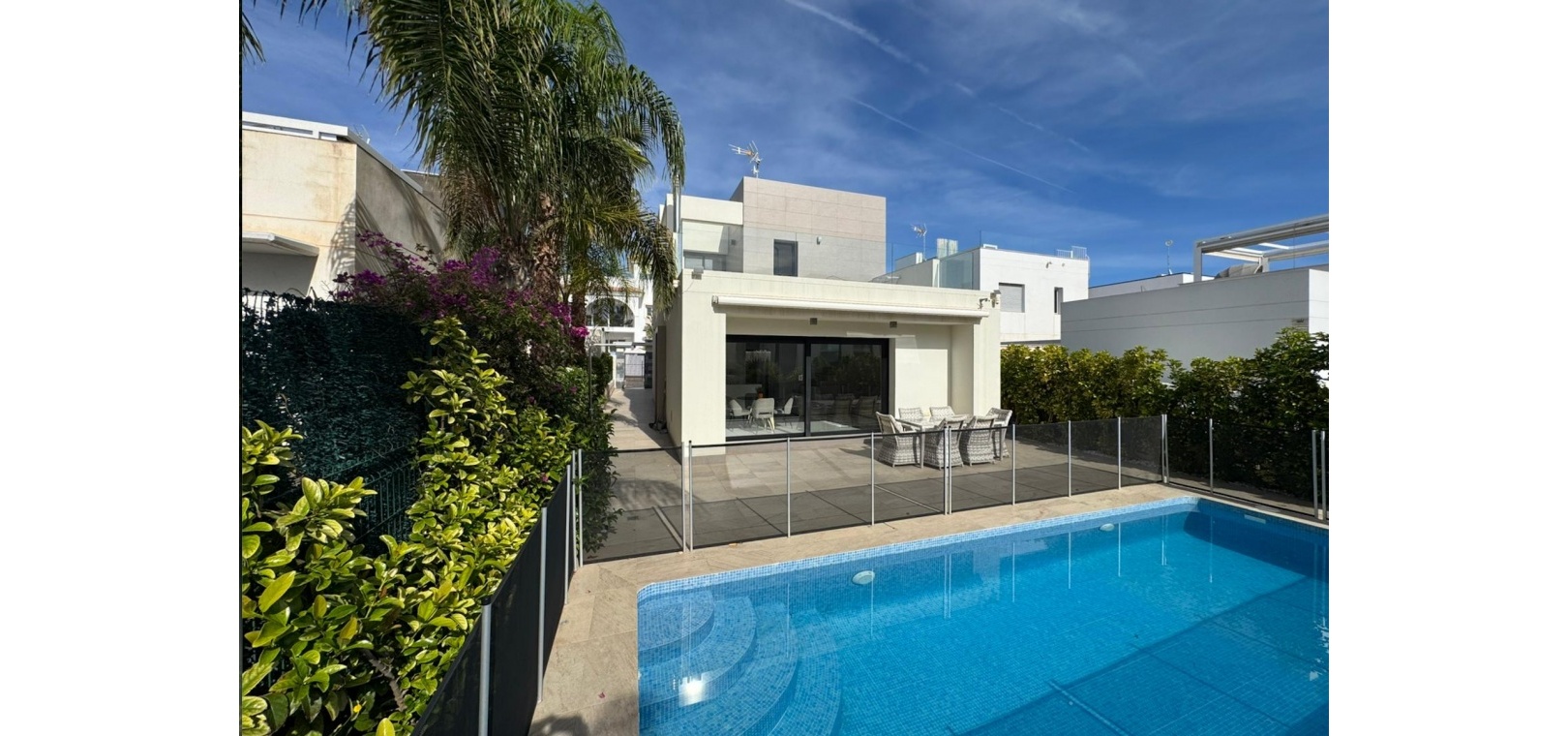Vi presenterar denna magnifika fristående villa i modern stil, belägen i ett lugnt och väl anslutet bostadsområde, perfekt för dem som söker komfort, avskildhet och livskvalitet. Fastigheten byggdes 2014 och kombinerar modern design med högkvalitativa material och en planlösning utformad för att erbjuda maximal komfort i varje rum. Med en byggd yta på 125 m² på en privat tomt på 300 m² är fastigheten fördelad på två våningar plus ett stort takterrass, perfekt för att njuta av solen och den fria utsikten året runt. På bottenvåningen finns ett rymligt vardagsrum/matsal med öppen planlösning anslutet till ett fullt utrustat modernt kök, samt ett sovrum med klädkammare, ett komplett badrum och en gästtoalett, alla med direkt tillgång till trädgården och poolområdet. På övervåningen finns ytterligare två sovrum av utmärkt storlek och ett komplett badrum, alla med rikligt med naturligt ljus och tillgång till en privat terrass som inbjuder dig att koppla av. Från denna våning leder en utvändig trappa till solariet, ett exklusivt utrymme perfekt för att sola eller helt enkelt njuta av lugnet och medelhavsklimatet. Fastigheten har golvvärme i hela huset, central luftkonditionering och säljs fullt möblerad, redo att flyttas in. Utomhus kombinerar den privata trädgården relaxområden med en spektakulär privat pool, vilket skapar den perfekta miljön för att njuta av stunder utomhus i fullständig avskildhet. Dessutom finns det en parkeringsplats på tomten, vilket garanterar bekvämlighet och säkerhet. Dess moderna arkitektoniska stil, tillsammans med högkvalitativa ytbehandlingar och rymliga interiörer, gör denna fastighet till ett idealiskt val för både permanentboende och fritidshus. Kort sagt, denna villa representerar essensen av modern medelhavskomfort: rymlighet, design, ljus och ett utmärkt läge i en lugn och väl ansluten miljö. Ett perfekt hem för dem som söker att njuta av solen, avskildheten och lyxen när den är som bäst.