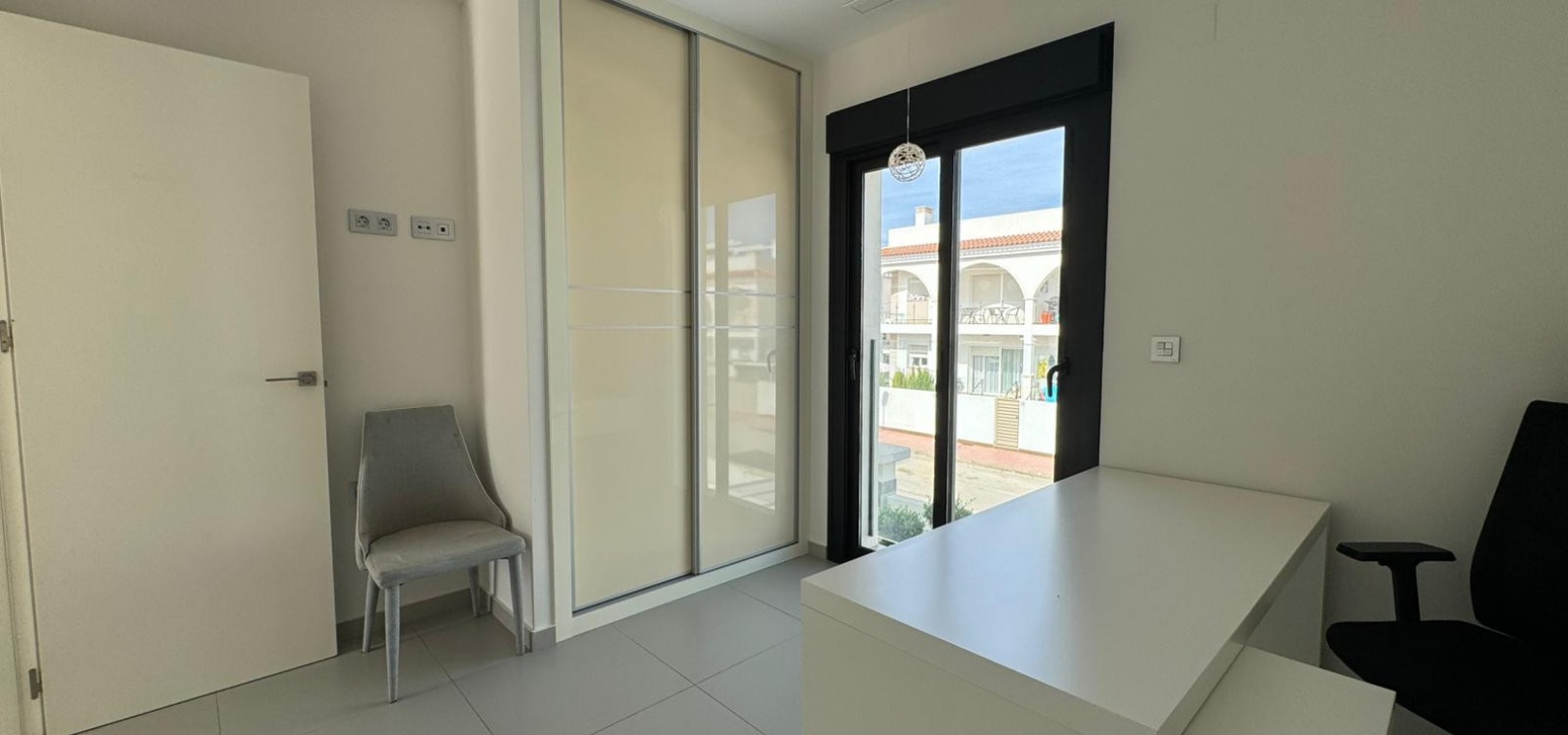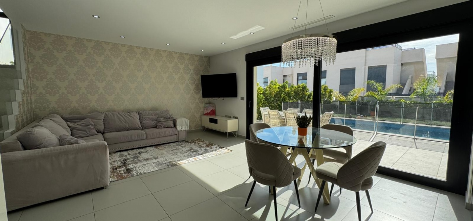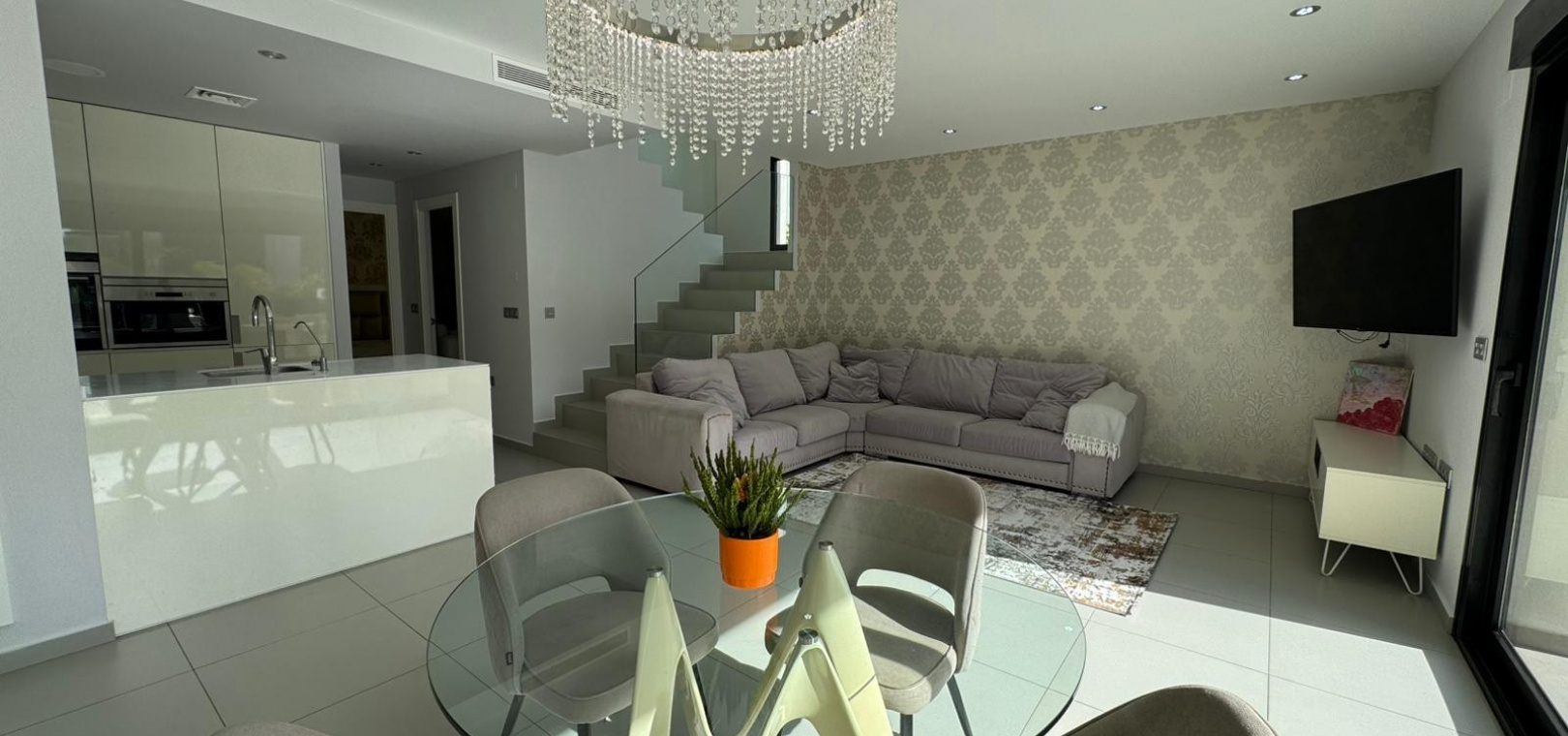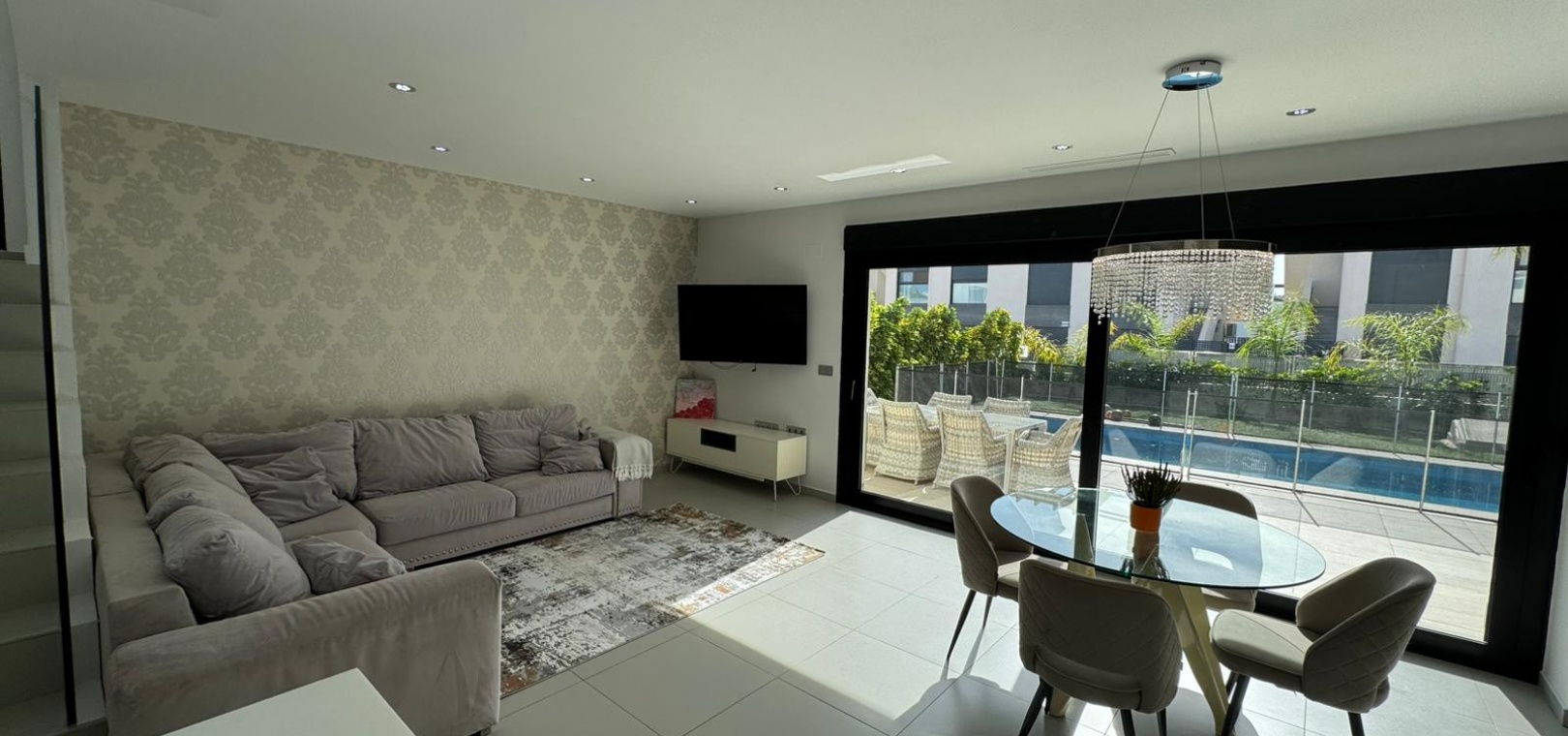 Vi presenterar denna magnifika fristående villa i modern stil, belägen i ett lugnt och väl anslutet bostadsområde, perfekt för dem som söker komfort, avskildhet och livskvalitet. Fastigheten byggdes 2014 och kombinerar modern design med högkvalitativa material och en planlösning utformad för att erbjuda maximal komfort i varje rum. Med en byggd yta på 125 m² på en privat tomt på 300 m² är fastigheten fördelad på två våningar plus ett stort takterrass, perfekt för att njuta av solen och den fria utsikten året runt. På bottenvåningen finns ett rymligt vardagsrum/matsal med öppen planlösning anslutet till ett fullt utrustat modernt kök, samt ett sovrum med klädkammare, ett komplett badrum och en gästtoalett, alla med direkt tillgång till trädgården och poolområdet. På övervåningen finns ytterligare två sovrum av utmärkt storlek och ett komplett badrum, alla med rikligt med naturligt ljus och tillgång till en privat terrass som inbjuder dig att koppla av. Från denna våning leder en utvändig trappa till solariet, ett exklusivt utrymme perfekt för att sola eller helt enkelt njuta av lugnet och medelhavsklimatet. Fastigheten har golvvärme i hela huset, central luftkonditionering och säljs fullt möblerad, redo att flyttas in. Utomhus kombinerar den privata trädgården relaxområden med en spektakulär privat pool, vilket skapar den perfekta miljön för att njuta av stunder utomhus i fullständig avskildhet. Dessutom finns det en parkeringsplats på tomten, vilket garanterar bekvämlighet och säkerhet. Dess moderna arkitektoniska stil, tillsammans med högkvalitativa ytbehandlingar och rymliga interiörer, gör denna fastighet till ett idealiskt val för både permanentboende och fritidshus. Kort sagt, denna villa representerar essensen av modern medelhavskomfort: rymlighet, design, ljus och ett utmärkt läge i en lugn och väl ansluten miljö. Ett perfekt hem för dem som söker att njuta av solen, avskildheten och lyxen när den är som bäst.