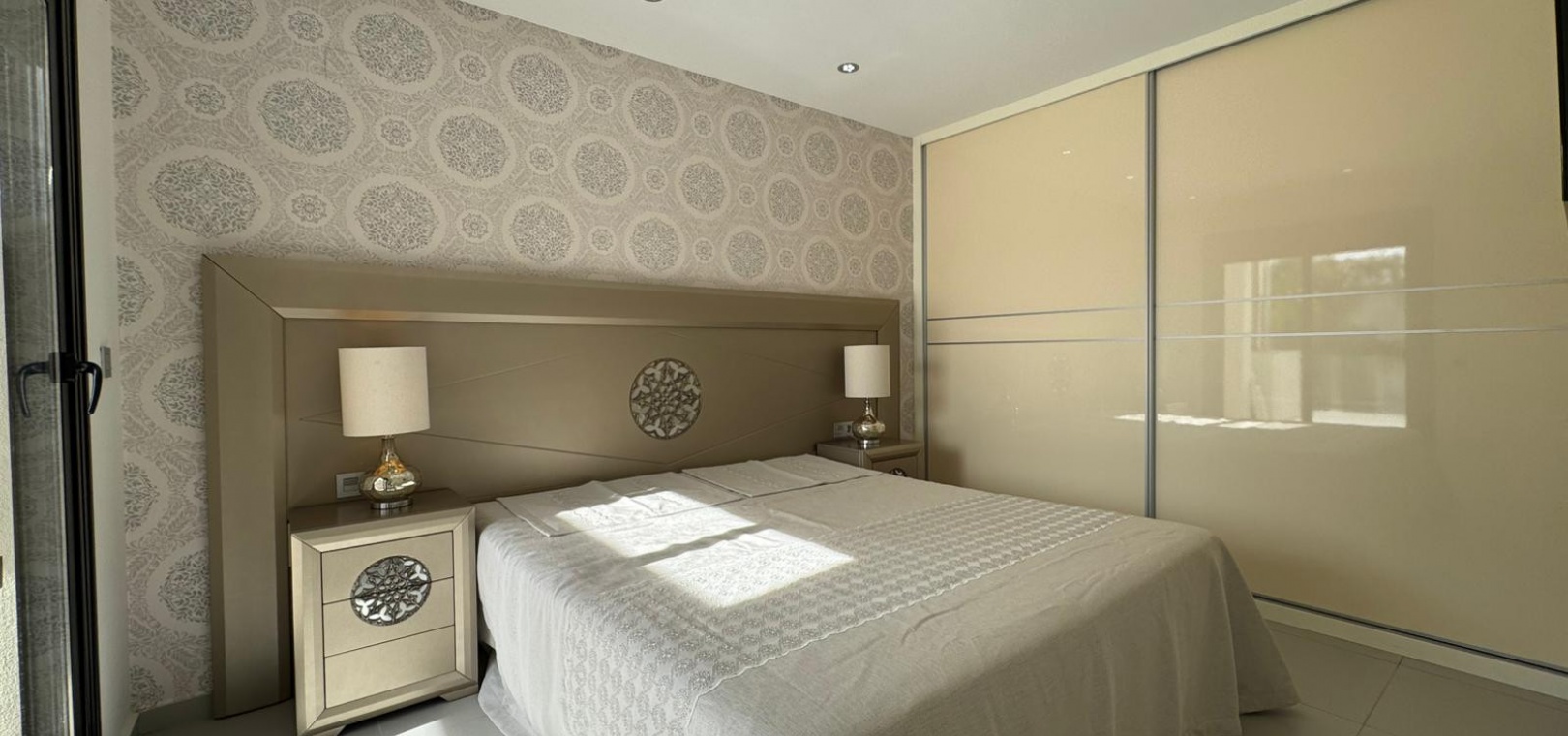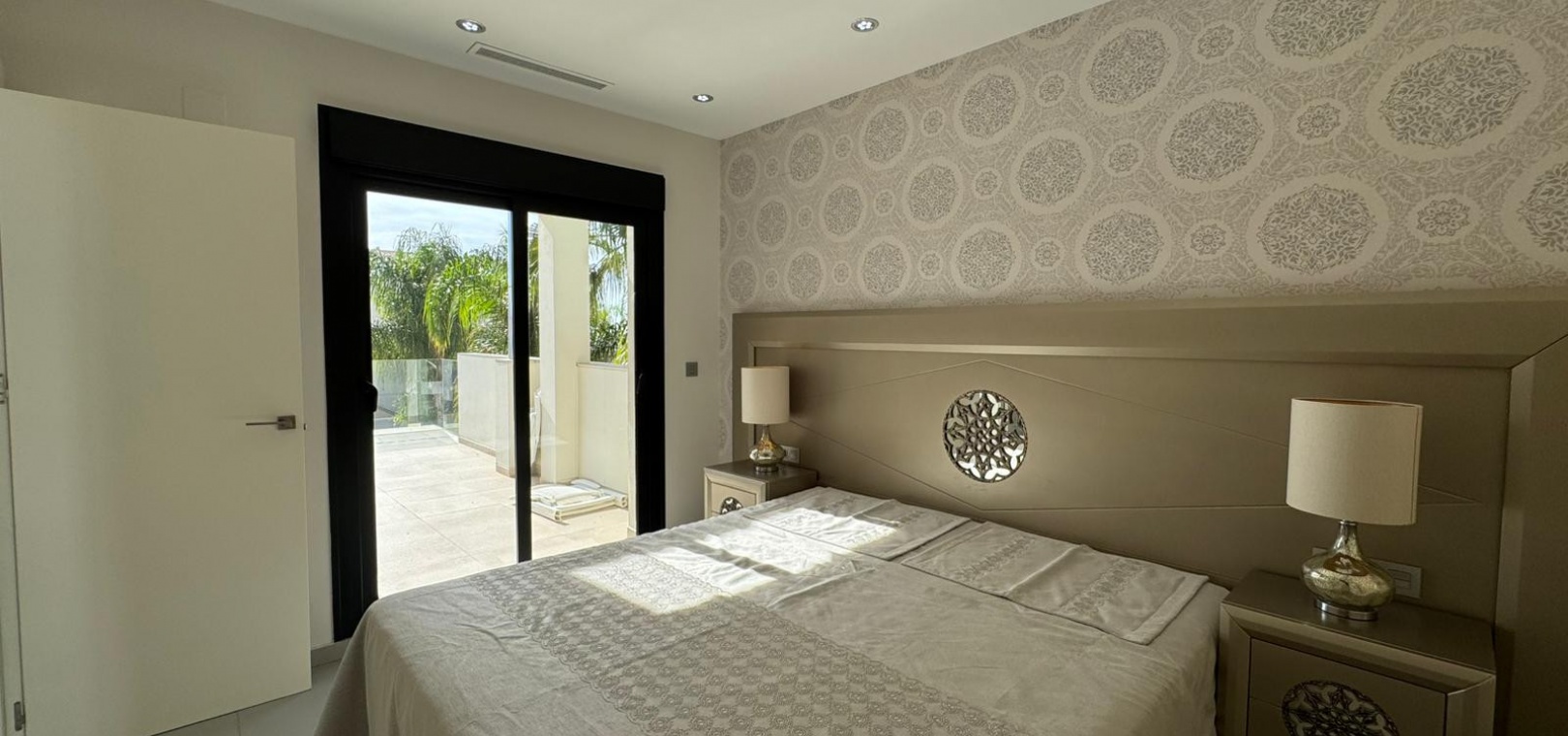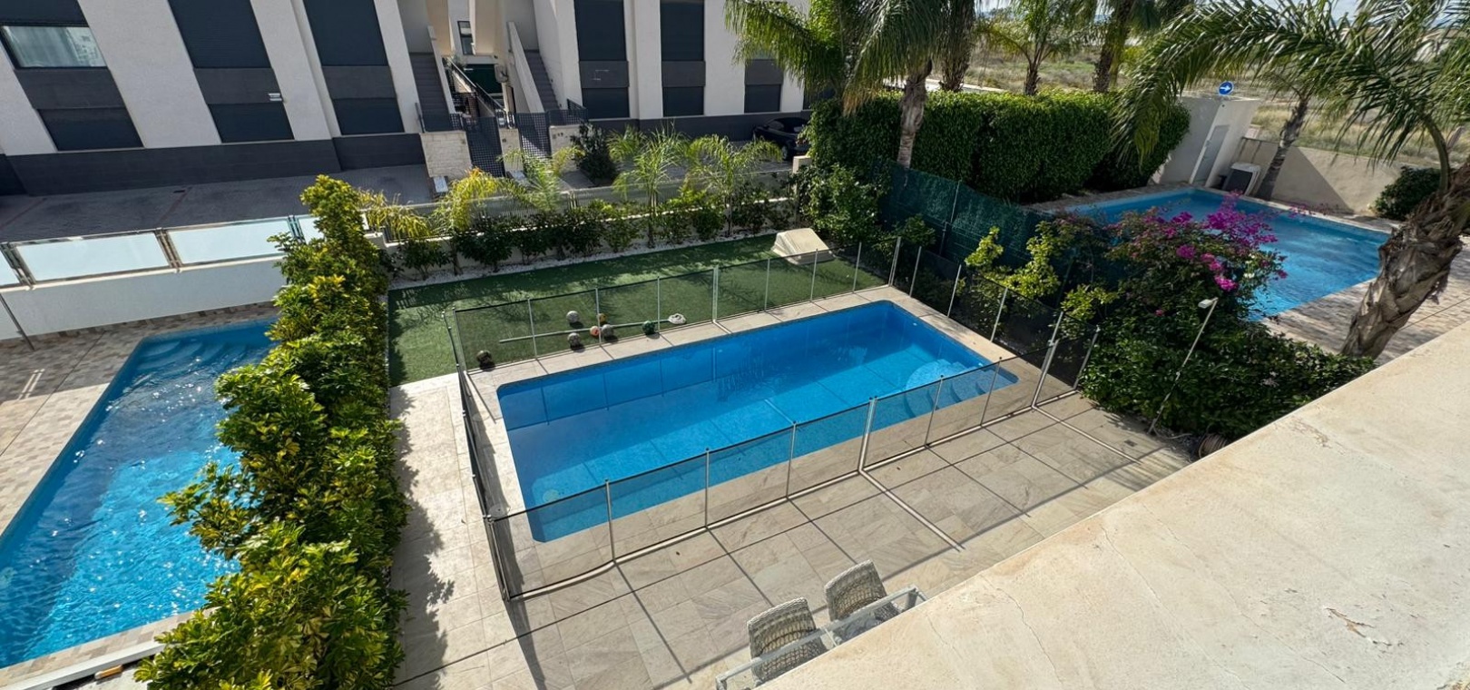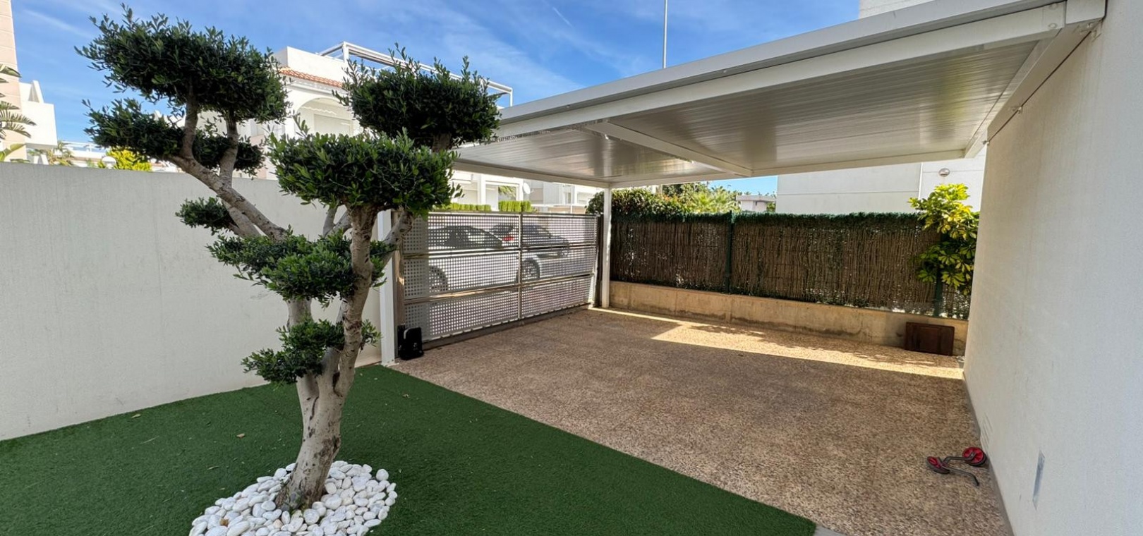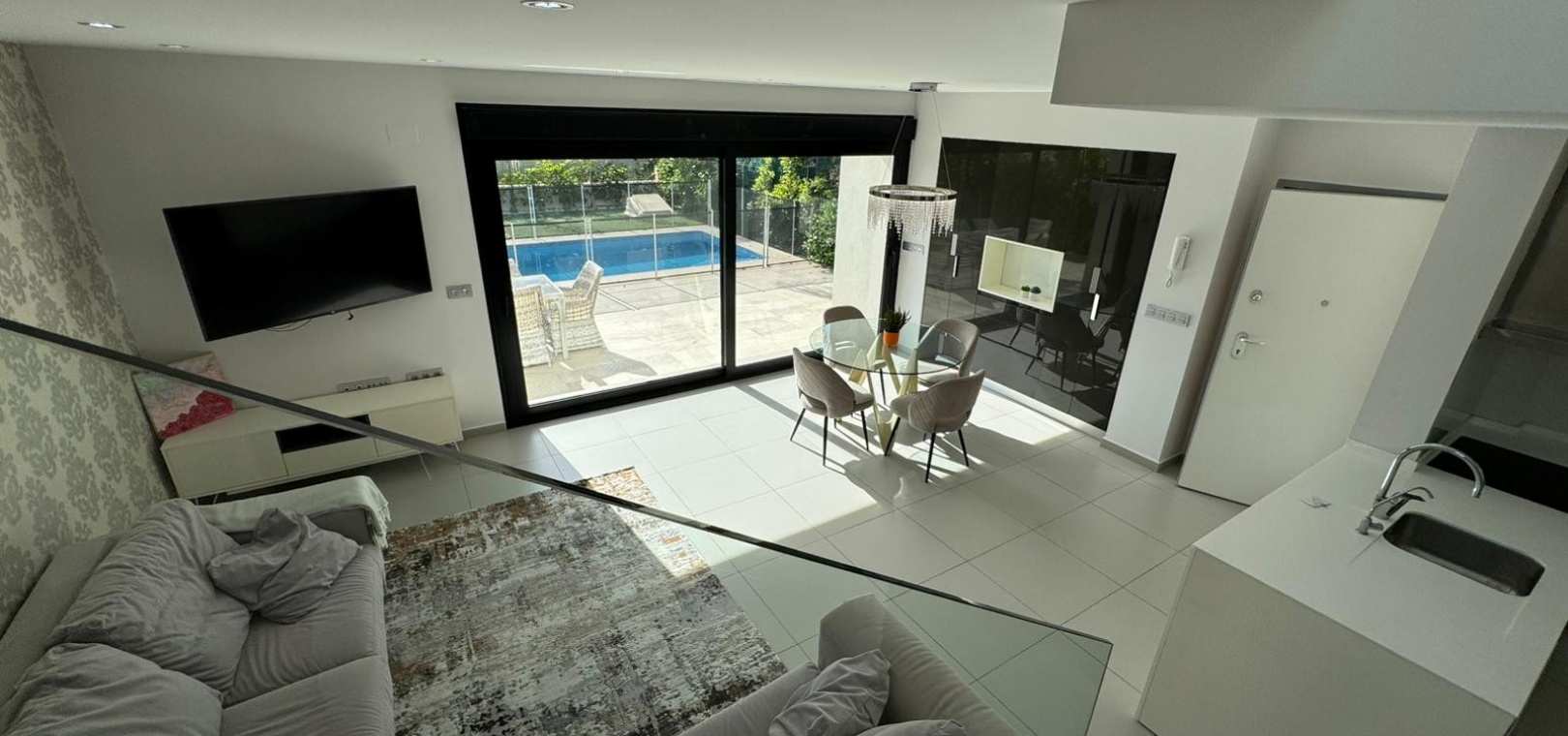 Vi presenterar denna magnifika fristående villa i modern stil, belägen i ett lugnt och väl anslutet bostadsområde, perfekt för dem som söker komfort, avskildhet och livskvalitet. Fastigheten byggdes 2014 och kombinerar modern design med högkvalitativa material och en planlösning utformad för att erbjuda maximal komfort i varje rum. Med en byggd yta på 125 m² på en privat tomt på 300 m² är fastigheten fördelad på två våningar plus ett stort takterrass, perfekt för att njuta av solen och den fria utsikten året runt. På bottenvåningen finns ett rymligt vardagsrum/matsal med öppen planlösning anslutet till ett fullt utrustat modernt kök, samt ett sovrum med klädkammare, ett komplett badrum och en gästtoalett, alla med direkt tillgång till trädgården och poolområdet. På övervåningen finns ytterligare två sovrum av utmärkt storlek och ett komplett badrum, alla med rikligt med naturligt ljus och tillgång till en privat terrass som inbjuder dig att koppla av. Från denna våning leder en utvändig trappa till solariet, ett exklusivt utrymme perfekt för att sola eller helt enkelt njuta av lugnet och medelhavsklimatet. Fastigheten har golvvärme i hela huset, central luftkonditionering och säljs fullt möblerad, redo att flyttas in. Utomhus kombinerar den privata trädgården relaxområden med en spektakulär privat pool, vilket skapar den perfekta miljön för att njuta av stunder utomhus i fullständig avskildhet. Dessutom finns det en parkeringsplats på tomten, vilket garanterar bekvämlighet och säkerhet. Dess moderna arkitektoniska stil, tillsammans med högkvalitativa ytbehandlingar och rymliga interiörer, gör denna fastighet till ett idealiskt val för både permanentboende och fritidshus. Kort sagt, denna villa representerar essensen av modern medelhavskomfort: rymlighet, design, ljus och ett utmärkt läge i en lugn och väl ansluten miljö. Ett perfekt hem för dem som söker att njuta av solen, avskildheten och lyxen när den är som bäst.