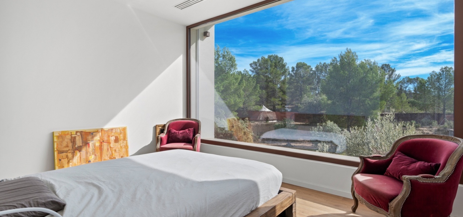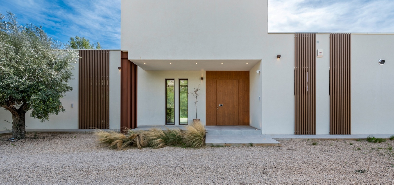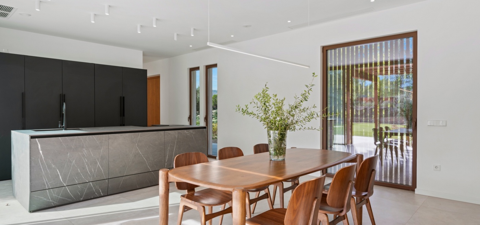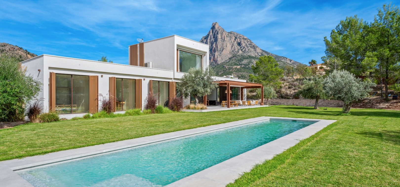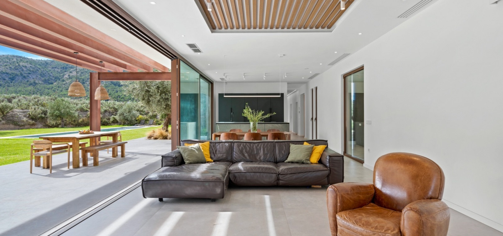 Det finns platser du inte hittar på fastighetswebbplatser. Du drömmer om dem. Du känner dem. Du andas in dem innan du ens anländer. Detta passivhus i Finestrat är en av dessa platser. Det är inte bara modern arkitektur – det är ett sätt att leva: hållbart, framåttänkande, fridfullt. 230 m² byggt enligt högsta biopassiva och energieffektiva standarder, som fångar varje solstråle, varje bris, varje droppe regn… Allt flyter i harmoni med 10 000 m² natur, olivträd och fruktodlingar runt omkring. Här börjar inte utomhuslivet vid ytterdörren – det börjar långt innan dess. Det huvudsakliga utomhusområdet har en stor trädgård, designerpool och en vacker terrass där frisk luft möter långa middagar med de människor du älskar. Inuti saktar livet ner. Ett rymligt vardagsrum och matplats inbjuder till långa samtal, skratt eller helt enkelt nöjet att titta på naturen genom de stora fönstren. Bredvid den dolda TV:n och den öppna spisen som väntar på vintern avslöjar skjutdörrar ett utrymme som är redo att bli din läshörna, hemmakontor, relaxavdelning eller kreativa reträtt. I hemmets hjärta hittar du köket. Noggrant utformat för att dela måltider, fira med familj och vänner och skapa oförglömliga stunder. Modernt, funktionellt, utrustat med Liebherr-apparater – den typen av plats som får dig att vilja stanna lite längre. Härifrån når du hallen som leder till husets mest privata område: huvudsviten. Ett rum där lugn och tystnad råder. Ett stort fönster för att räkna stjärnorna på natten och välkomna soluppgången på morgonen. En rymlig klädkammare och eget badrum med ett designerbadkar för att skölja bort dagen… eller en lång dusch medan du blickar ut över den majestätiska Puig Campana. I motsatta flygeln finns ytterligare tre sovrum, med inbyggda garderober och direkt tillgång till trädgården och poolen. Ett komplett gästbadrum, ett huvudbadrum och en tvättstuga. Varje detalj noggrant genomtänkt. Inget lämnas åt slumpen. Detta hem skriker inte lyx – det viskar det. För här handlar livet inte om att imponera på någon. Det handlar om att känna. Om att känna doften av den fuktiga jorden mellan olivträden medan man smuttar på sin första kaffe och kommer ihåg att frid inte kommer av att dricka mer ... Frid är att veta var man verkligen vill bo.