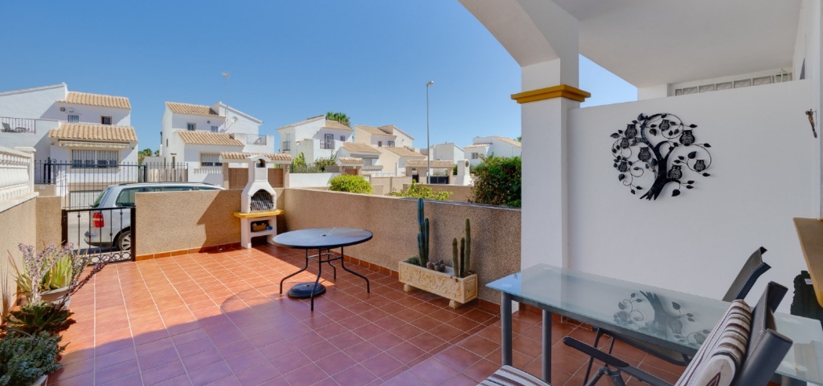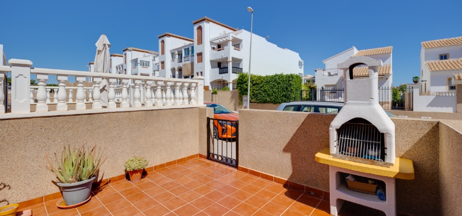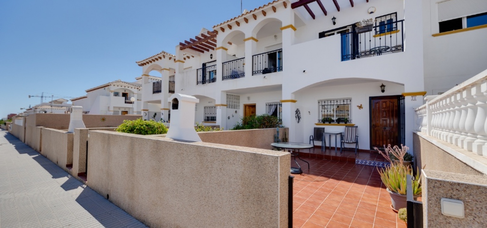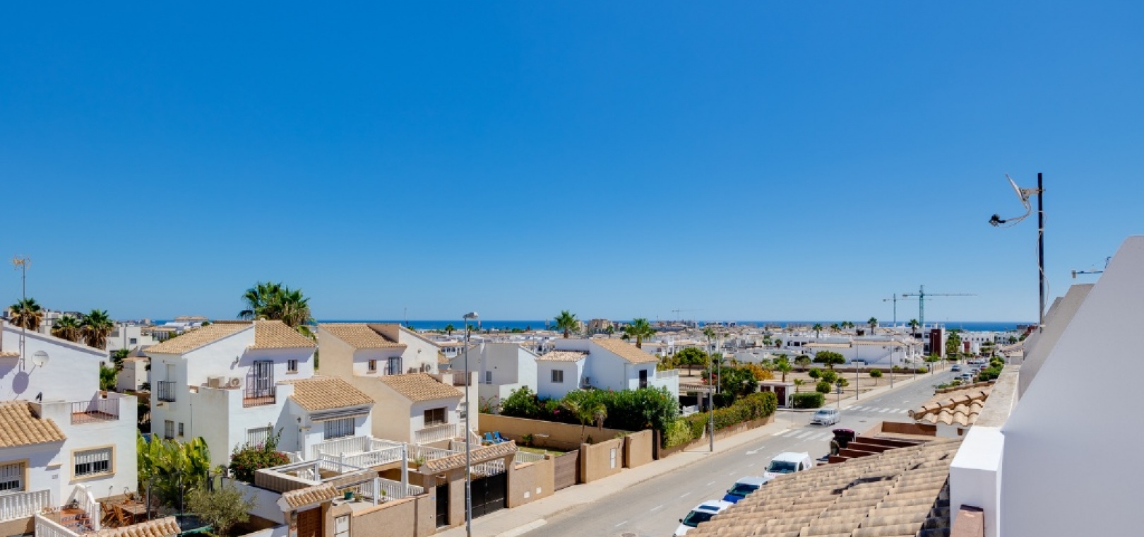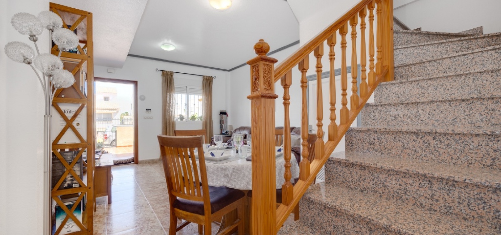 Fastighet till salu i det gated community Cinuelica R14 med uteplats, terrasser och solarium, med hisnande havsutsikt i Punta Prima inom gångavstånd till stranden och lokala bekvämligheter. Radhuset har 2 sovrum, ett badrum och en gästtoalett, separat kök med tvättstuga, vardagsrum med matplats, två terrasser och även privat takterrass. Det finns ett mycket trevligt gemensamt poolområde. Huset säljs delvis möblerat och med underjordisk parkering. Punta Prima är en typisk spansk turistort vid havet, belägen på södra Costa Blanca och mindre än 30 minuter från två internationella flygplatser i Murcias "Corvera" och Alicante. Stränderna, som är några av de renaste i området och har tilldelats Blå Flagg-status, kompletteras av ett underbart utbud av butiker, kaféer, stormarknader, barer och restauranger. Punta Prima har ett medelhavsklimat med 320 soldagar om året.