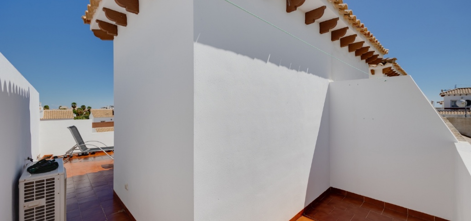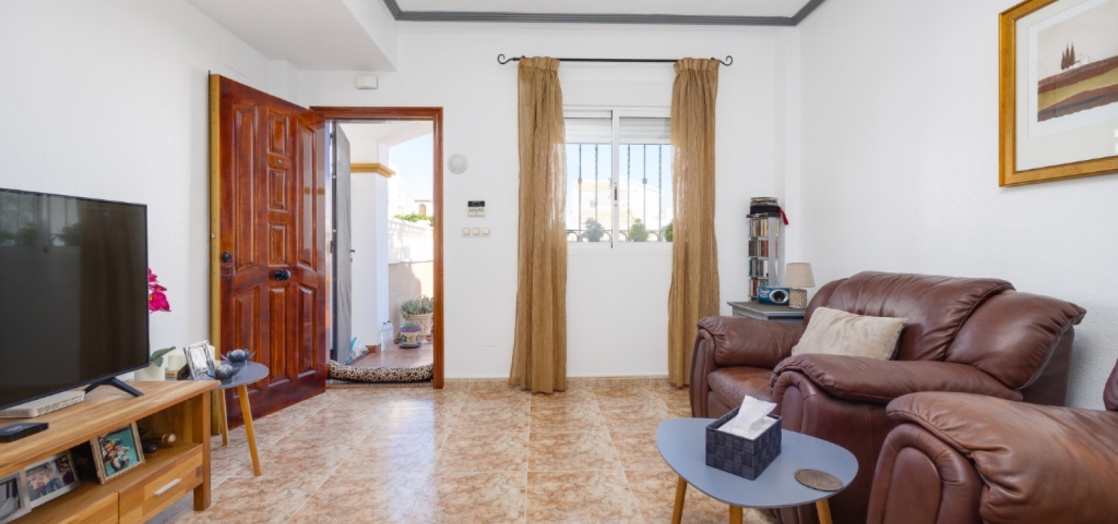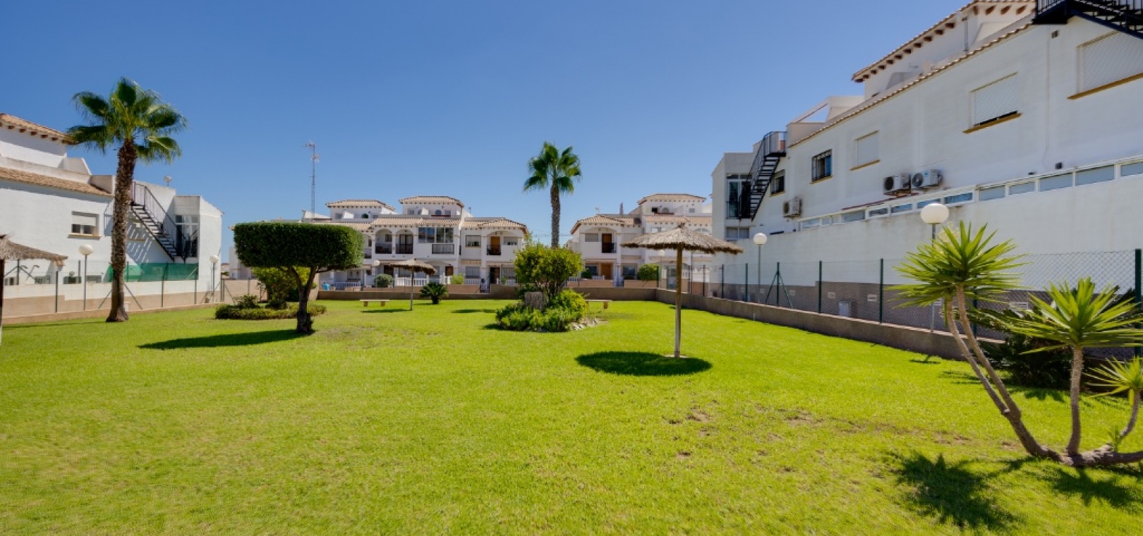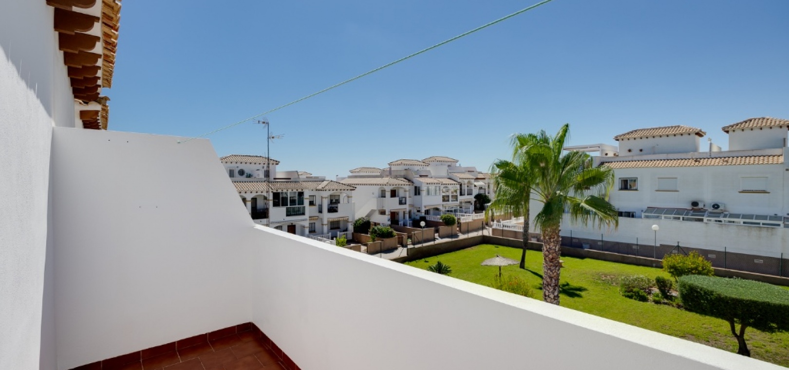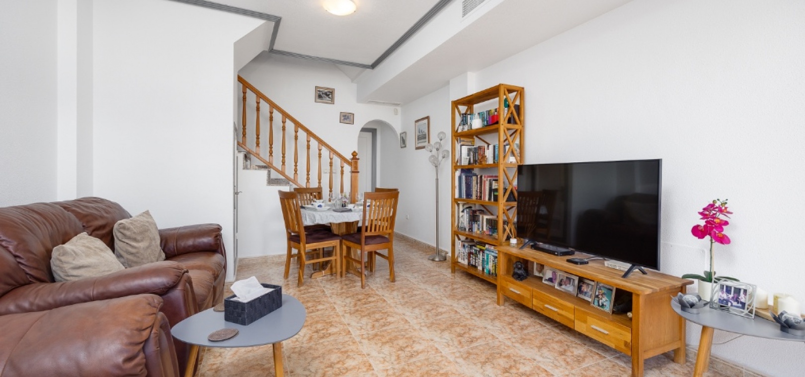 Fastighet till salu i det gated community Cinuelica R14 med uteplats, terrasser och solarium, med hisnande havsutsikt i Punta Prima inom gångavstånd till stranden och lokala bekvämligheter. Radhuset har 2 sovrum, ett badrum och en gästtoalett, separat kök med tvättstuga, vardagsrum med matplats, två terrasser och även privat takterrass. Det finns ett mycket trevligt gemensamt poolområde. Huset säljs delvis möblerat och med underjordisk parkering. Punta Prima är en typisk spansk turistort vid havet, belägen på södra Costa Blanca och mindre än 30 minuter från två internationella flygplatser i Murcias "Corvera" och Alicante. Stränderna, som är några av de renaste i området och har tilldelats Blå Flagg-status, kompletteras av ett underbart utbud av butiker, kaféer, stormarknader, barer och restauranger. Punta Prima har ett medelhavsklimat med 320 soldagar om året.