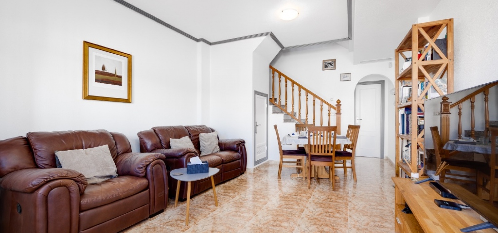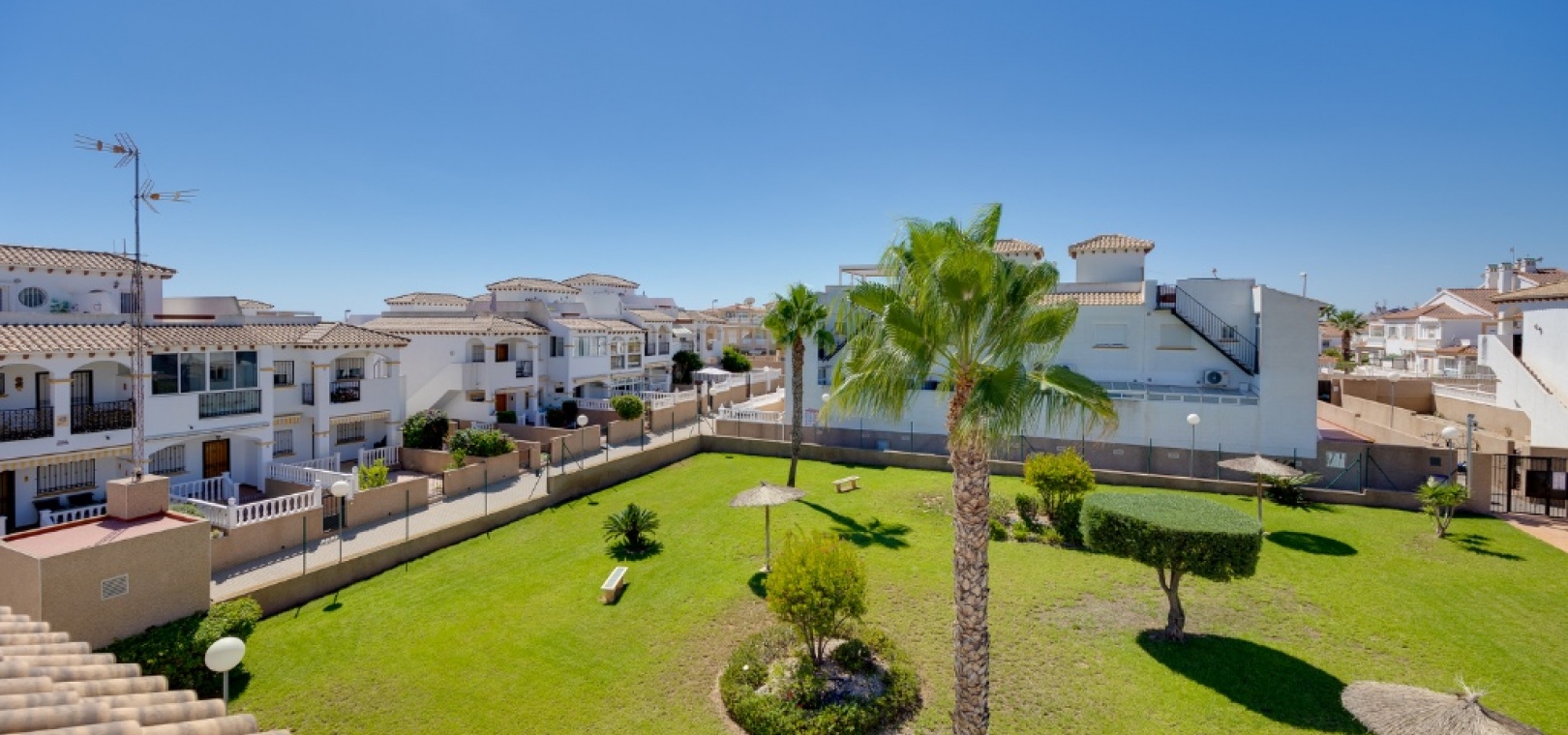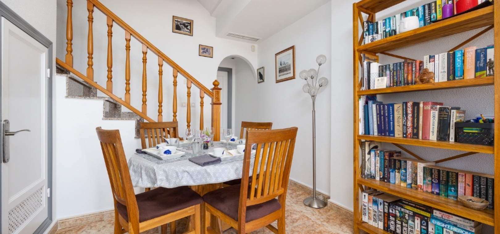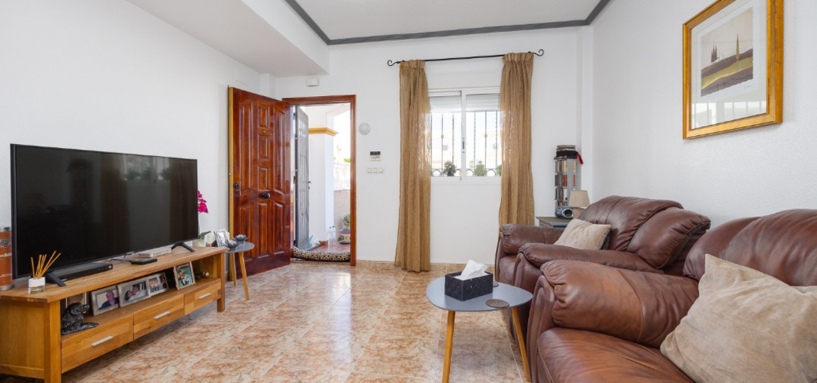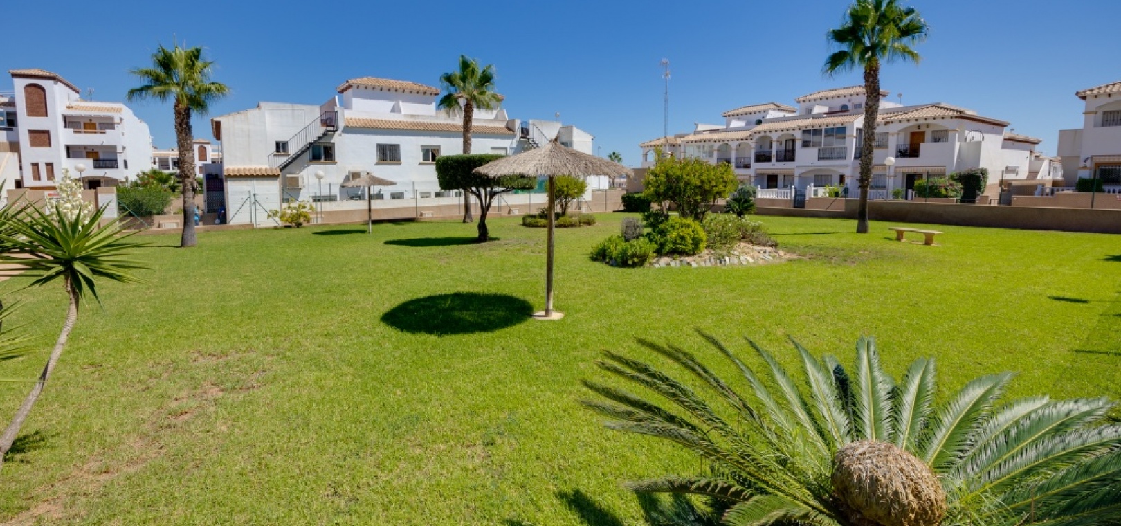 Fastighet till salu i det gated community Cinuelica R14 med uteplats, terrasser och solarium, med hisnande havsutsikt i Punta Prima inom gångavstånd till stranden och lokala bekvämligheter. Radhuset har 2 sovrum, ett badrum och en gästtoalett, separat kök med tvättstuga, vardagsrum med matplats, två terrasser och även privat takterrass. Det finns ett mycket trevligt gemensamt poolområde. Huset säljs delvis möblerat och med underjordisk parkering. Punta Prima är en typisk spansk turistort vid havet, belägen på södra Costa Blanca och mindre än 30 minuter från två internationella flygplatser i Murcias "Corvera" och Alicante. Stränderna, som är några av de renaste i området och har tilldelats Blå Flagg-status, kompletteras av ett underbart utbud av butiker, kaféer, stormarknader, barer och restauranger. Punta Prima har ett medelhavsklimat med 320 soldagar om året.