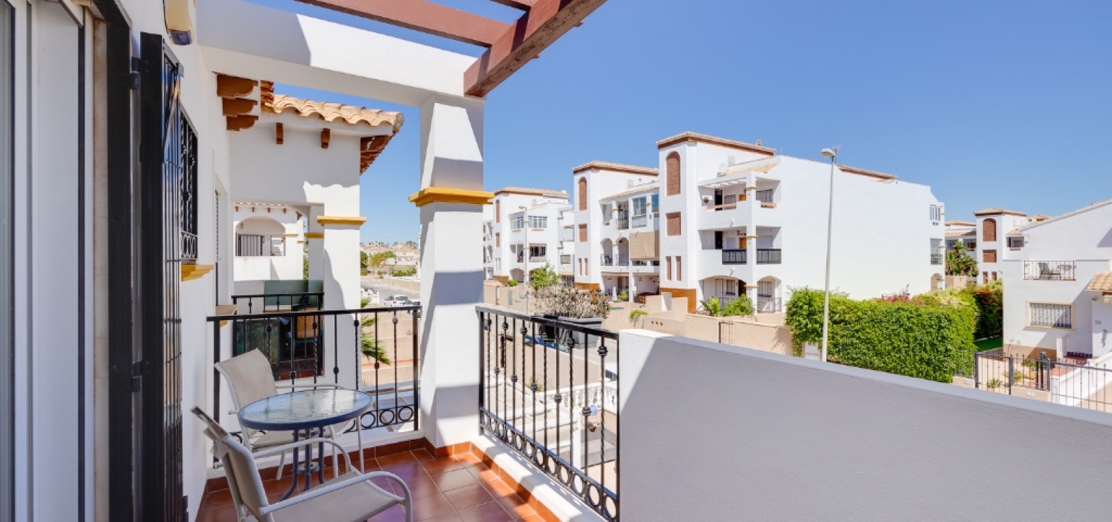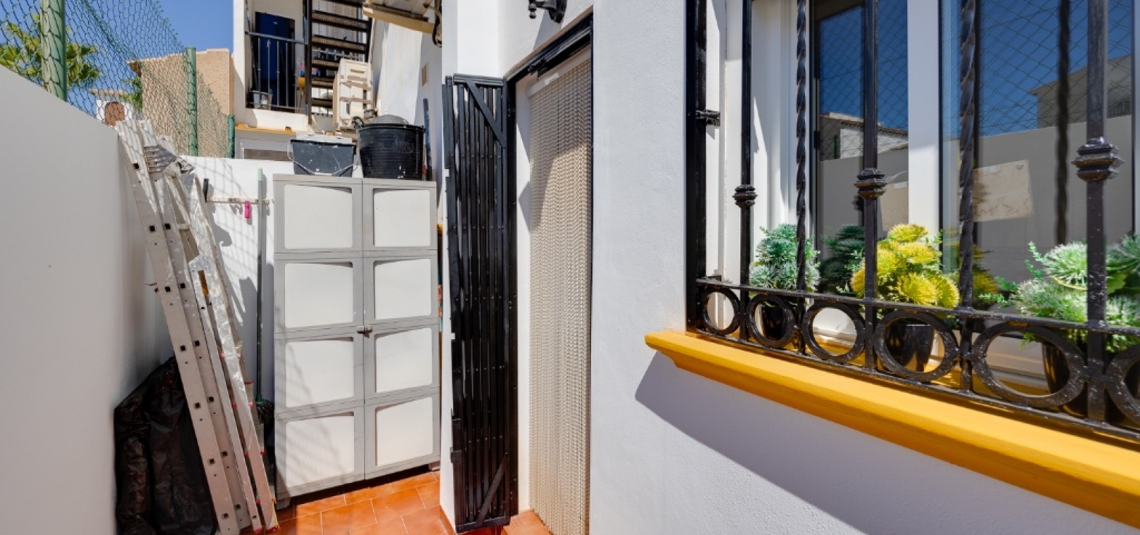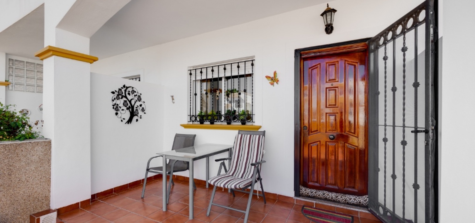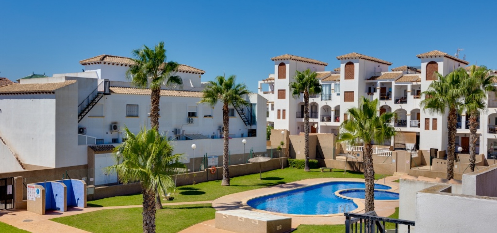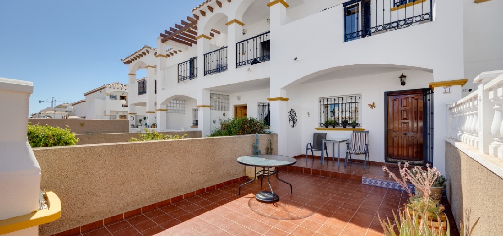 Fastighet till salu i det gated community Cinuelica R14 med uteplats, terrasser och solarium, med hisnande havsutsikt i Punta Prima inom gångavstånd till stranden och lokala bekvämligheter. Radhuset har 2 sovrum, ett badrum och en gästtoalett, separat kök med tvättstuga, vardagsrum med matplats, två terrasser och även privat takterrass. Det finns ett mycket trevligt gemensamt poolområde. Huset säljs delvis möblerat och med underjordisk parkering. Punta Prima är en typisk spansk turistort vid havet, belägen på södra Costa Blanca och mindre än 30 minuter från två internationella flygplatser i Murcias "Corvera" och Alicante. Stränderna, som är några av de renaste i området och har tilldelats Blå Flagg-status, kompletteras av ett underbart utbud av butiker, kaféer, stormarknader, barer och restauranger. Punta Prima har ett medelhavsklimat med 320 soldagar om året.
