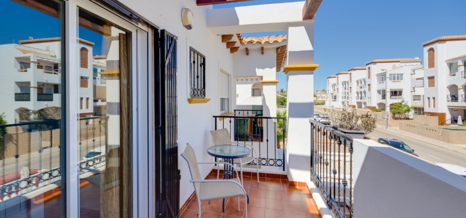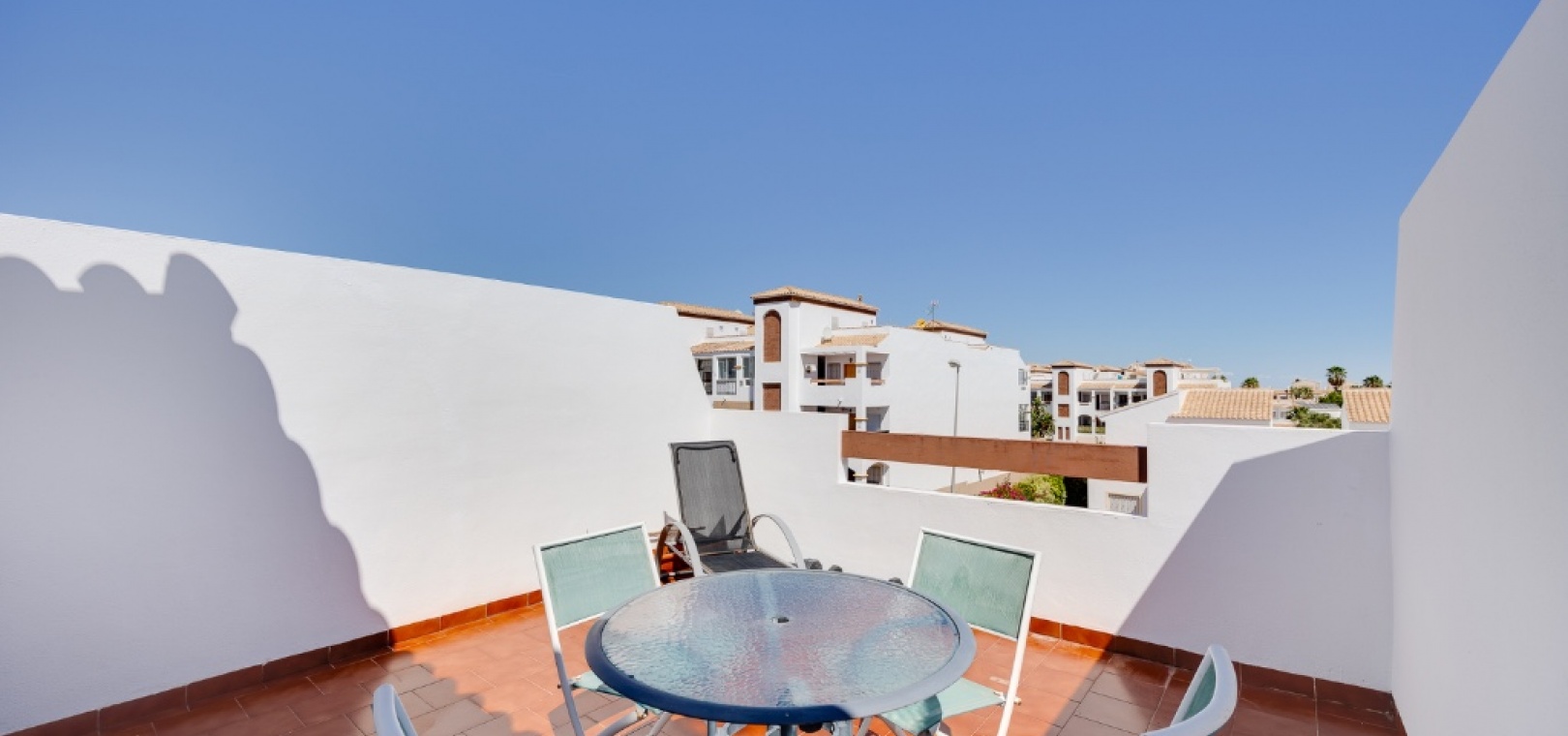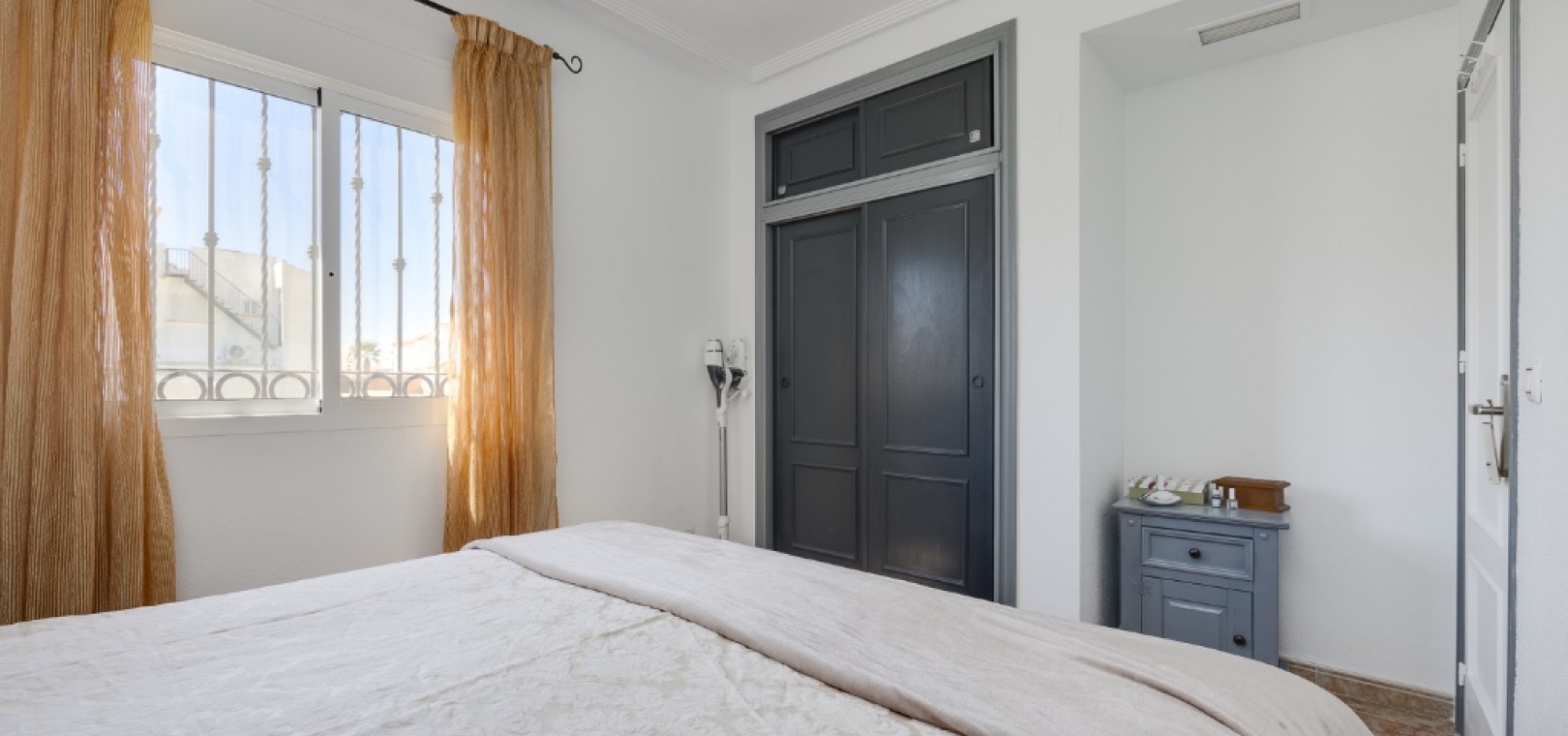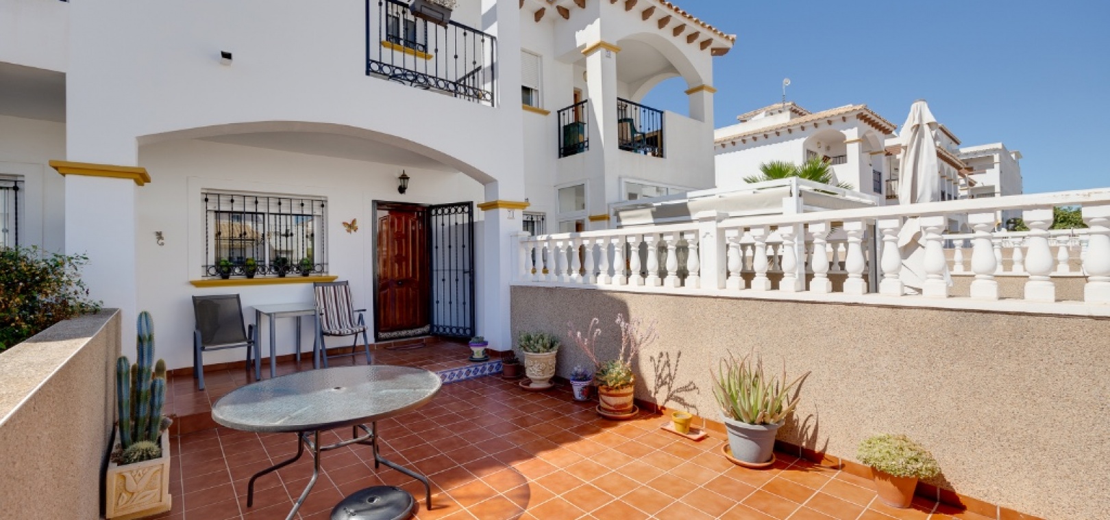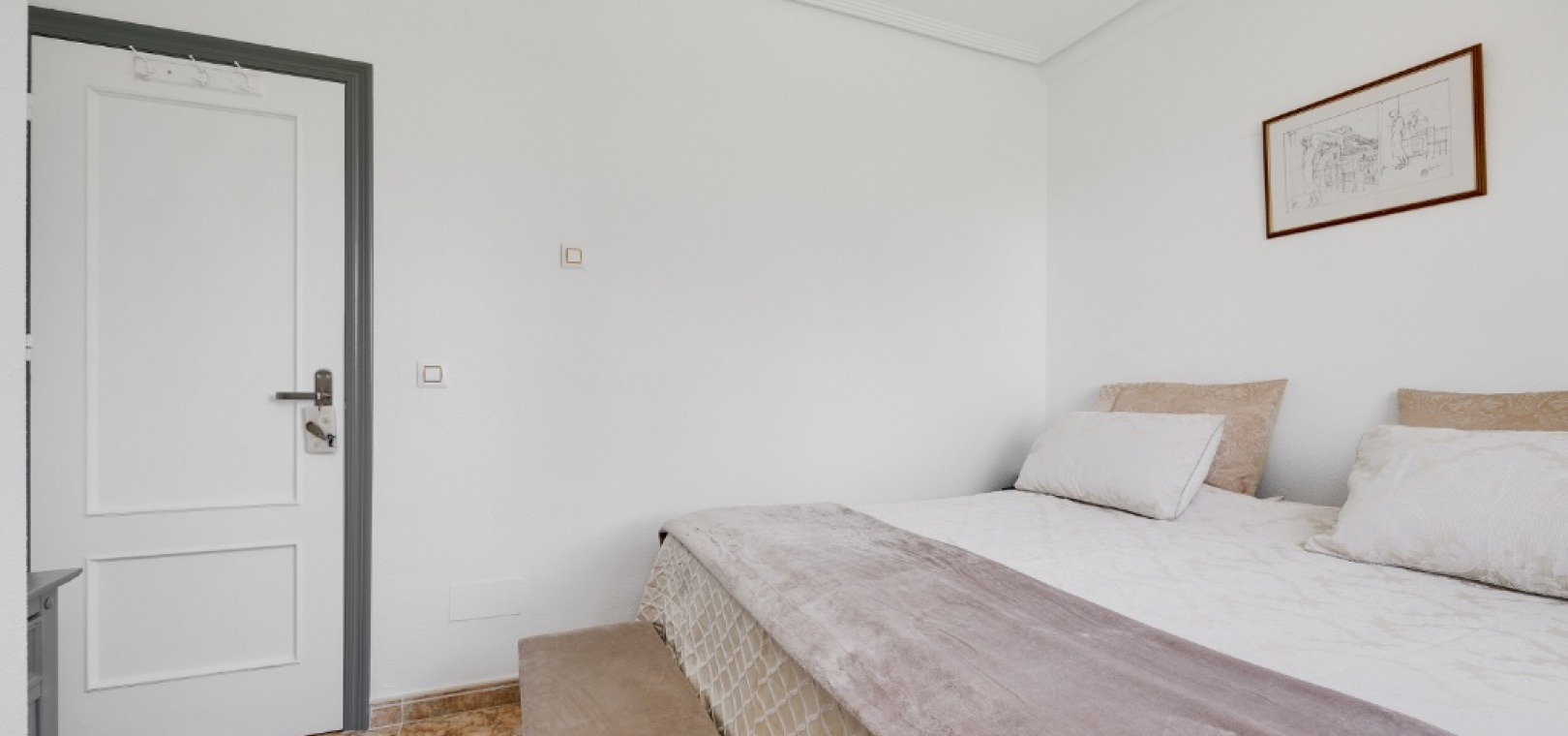 Fastighet till salu i det gated community Cinuelica R14 med uteplats, terrasser och solarium, med hisnande havsutsikt i Punta Prima inom gångavstånd till stranden och lokala bekvämligheter. Radhuset har 2 sovrum, ett badrum och en gästtoalett, separat kök med tvättstuga, vardagsrum med matplats, två terrasser och även privat takterrass. Det finns ett mycket trevligt gemensamt poolområde. Huset säljs delvis möblerat och med underjordisk parkering. Punta Prima är en typisk spansk turistort vid havet, belägen på södra Costa Blanca och mindre än 30 minuter från två internationella flygplatser i Murcias "Corvera" och Alicante. Stränderna, som är några av de renaste i området och har tilldelats Blå Flagg-status, kompletteras av ett underbart utbud av butiker, kaféer, stormarknader, barer och restauranger. Punta Prima har ett medelhavsklimat med 320 soldagar om året.