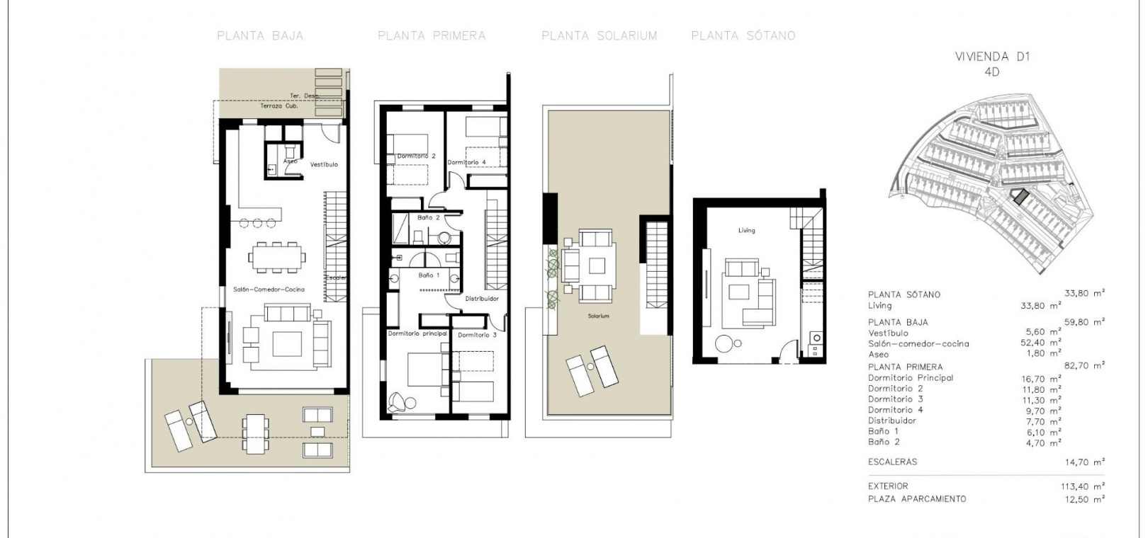 Projektet består av 68 högkvalitativa radhus och hörnparhus med 3 eller 4 sovrum. Fastigheterna har noggrant utformats för att erbjuda balanserade planlösningar, öppna vardagsrum och generösa utomhusutrymmen som terrasser, privata trädgårdar eller solarium. Vissa bostäder har en källarvåning med privat parkering, förråd eller vardagsrum, medan andra erbjuder bekväm parkering på markplan. Alla bostäder har söderläge och många har fantastisk utsikt över Medelhavet.