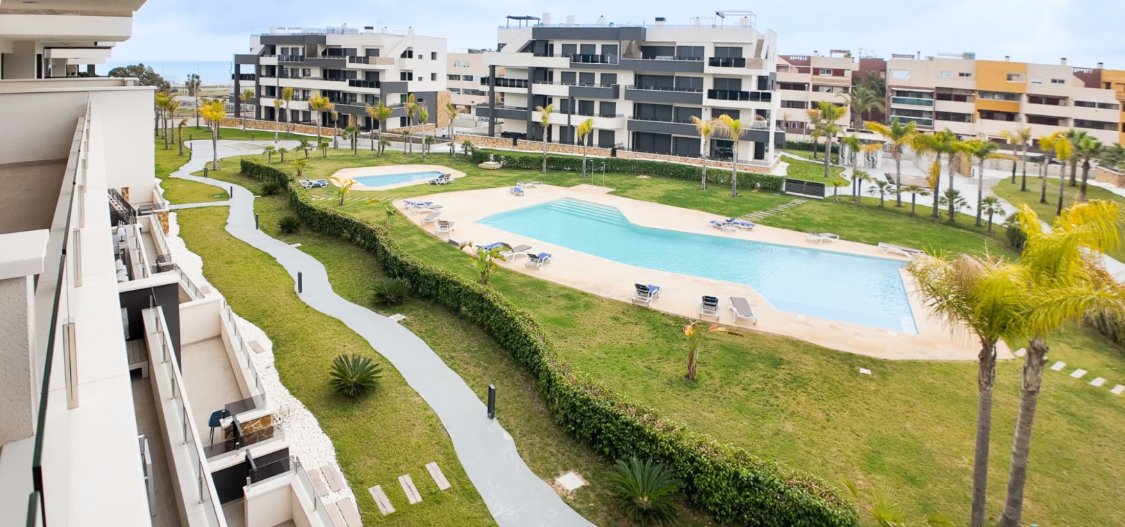 En lägenhet med 2 sovrum och 2 badrum i söderläge med utsikt över den gemensamma poolen, belägen i Res. Sunrise Deluxe, Playa Flamenca, Costa Blanca.