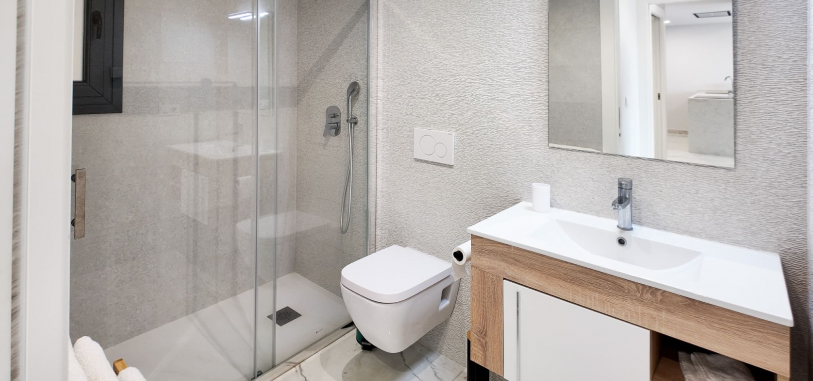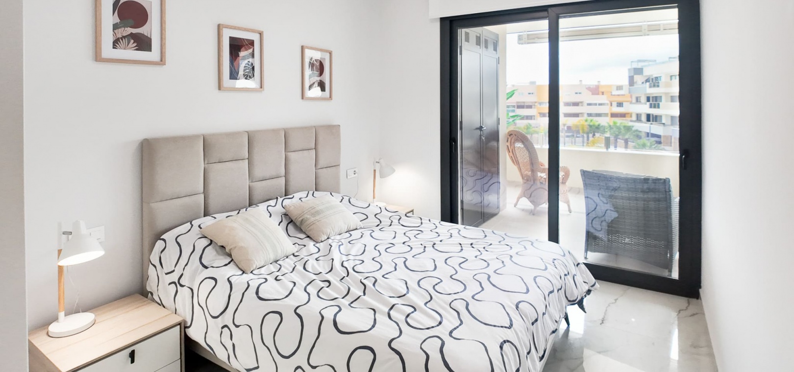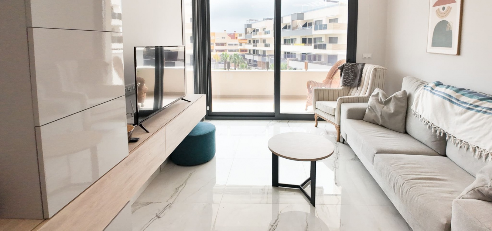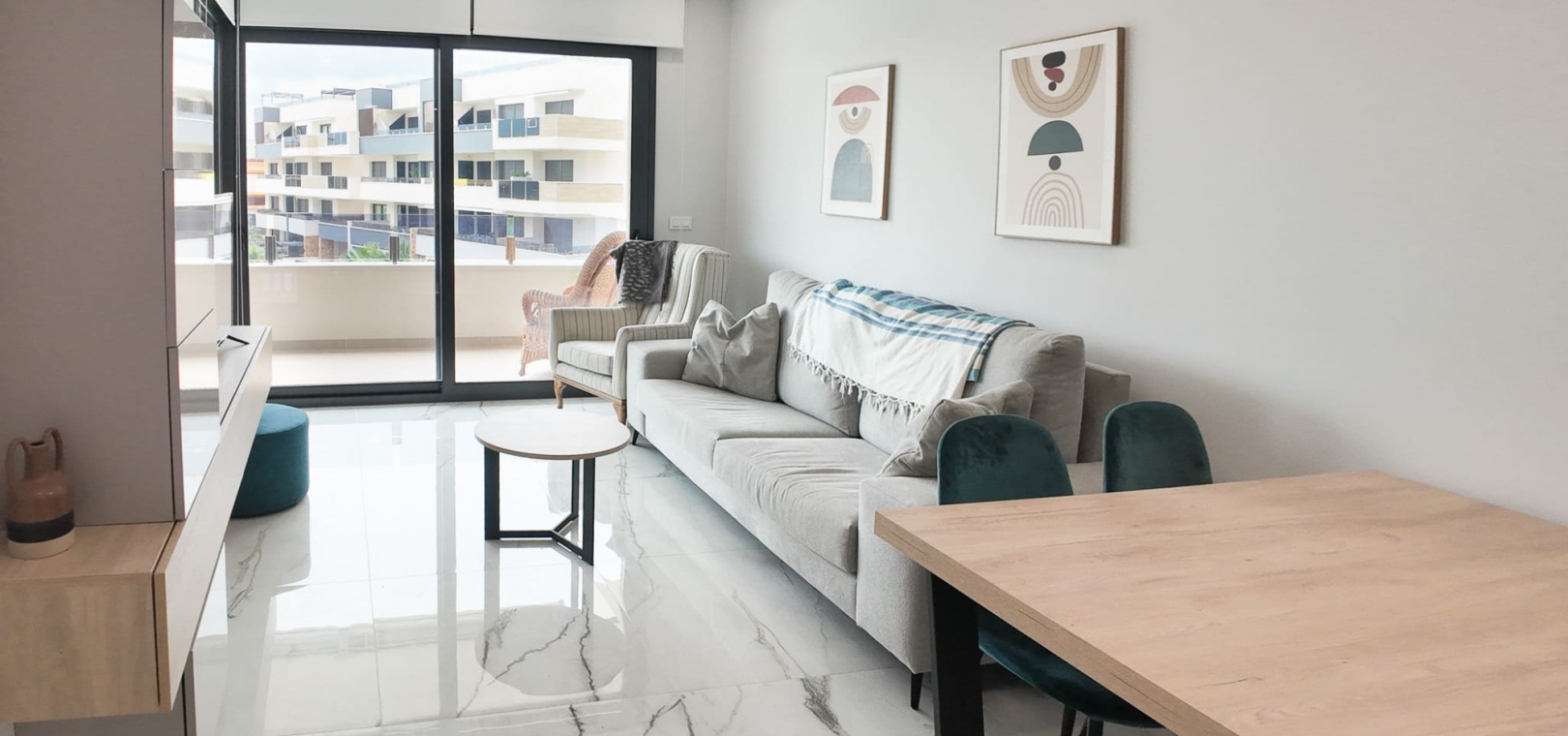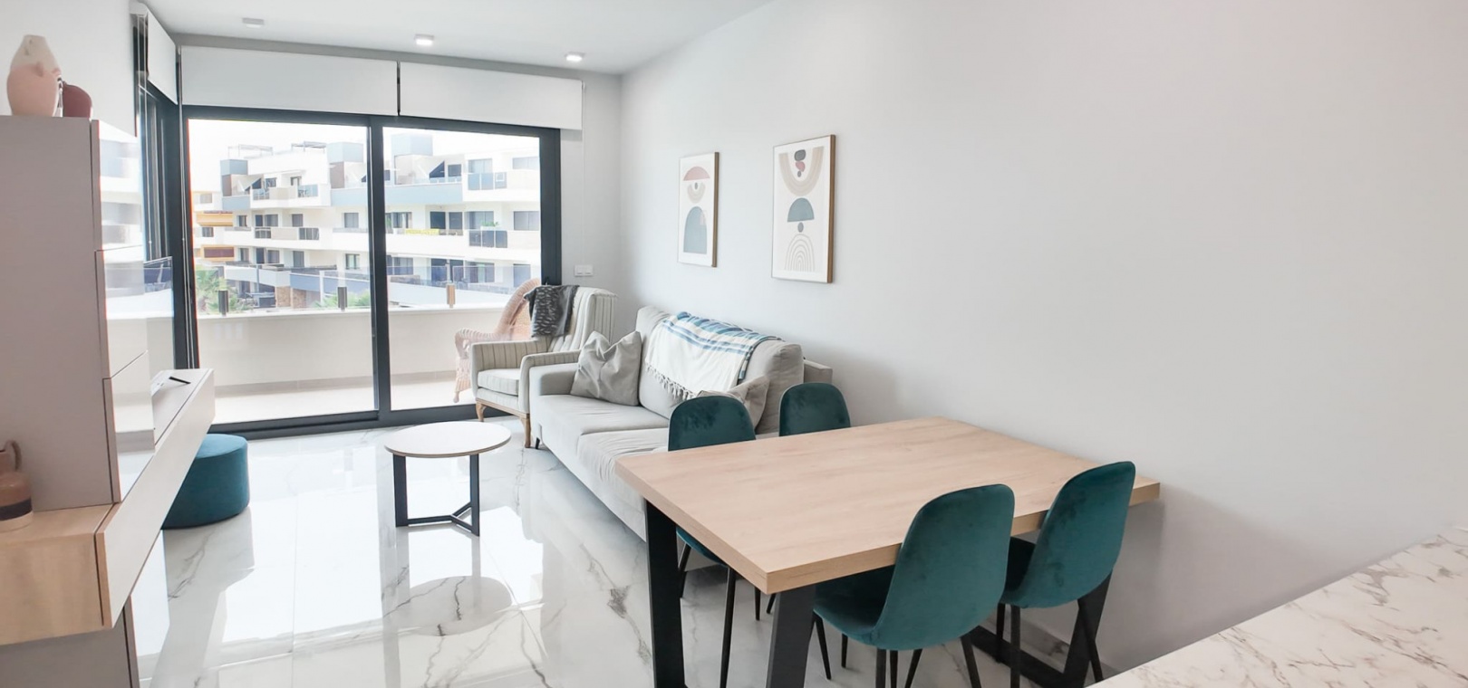 Vardagsrum/matsal, öppet kök med fullt utrustat kök, 2 dubbelrum, det största sovrummet har eget duschrum, 1 gästduschrum, balkong med utsikt över den gemensamma poolen och ner mot havet, gemensam jacuzzi, bastu, gym, lekplats, underjordisk parkeringsplats och förråd, ultramodern design, byggmaterial av högsta klass och mycket mer.