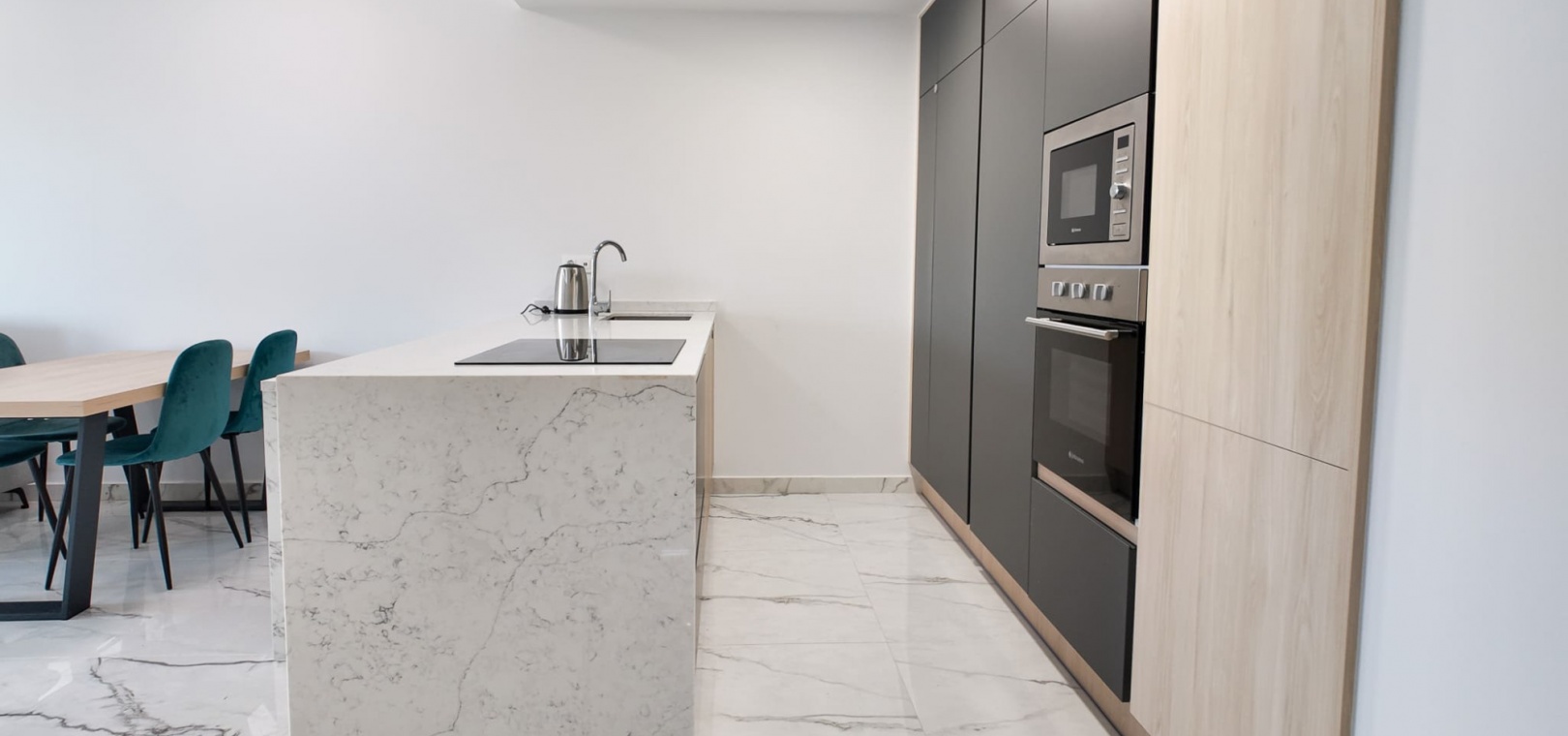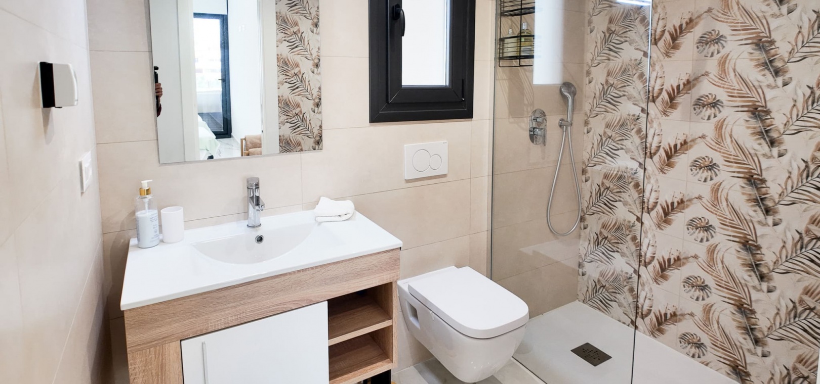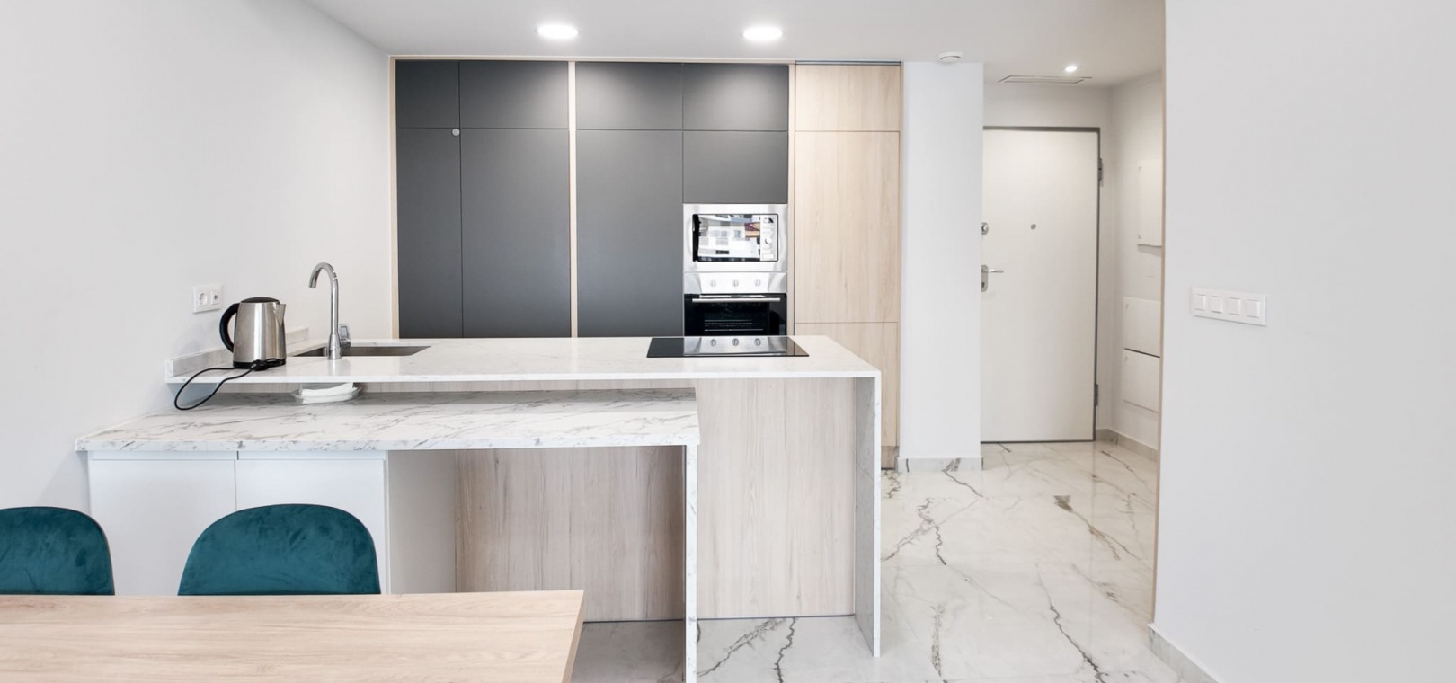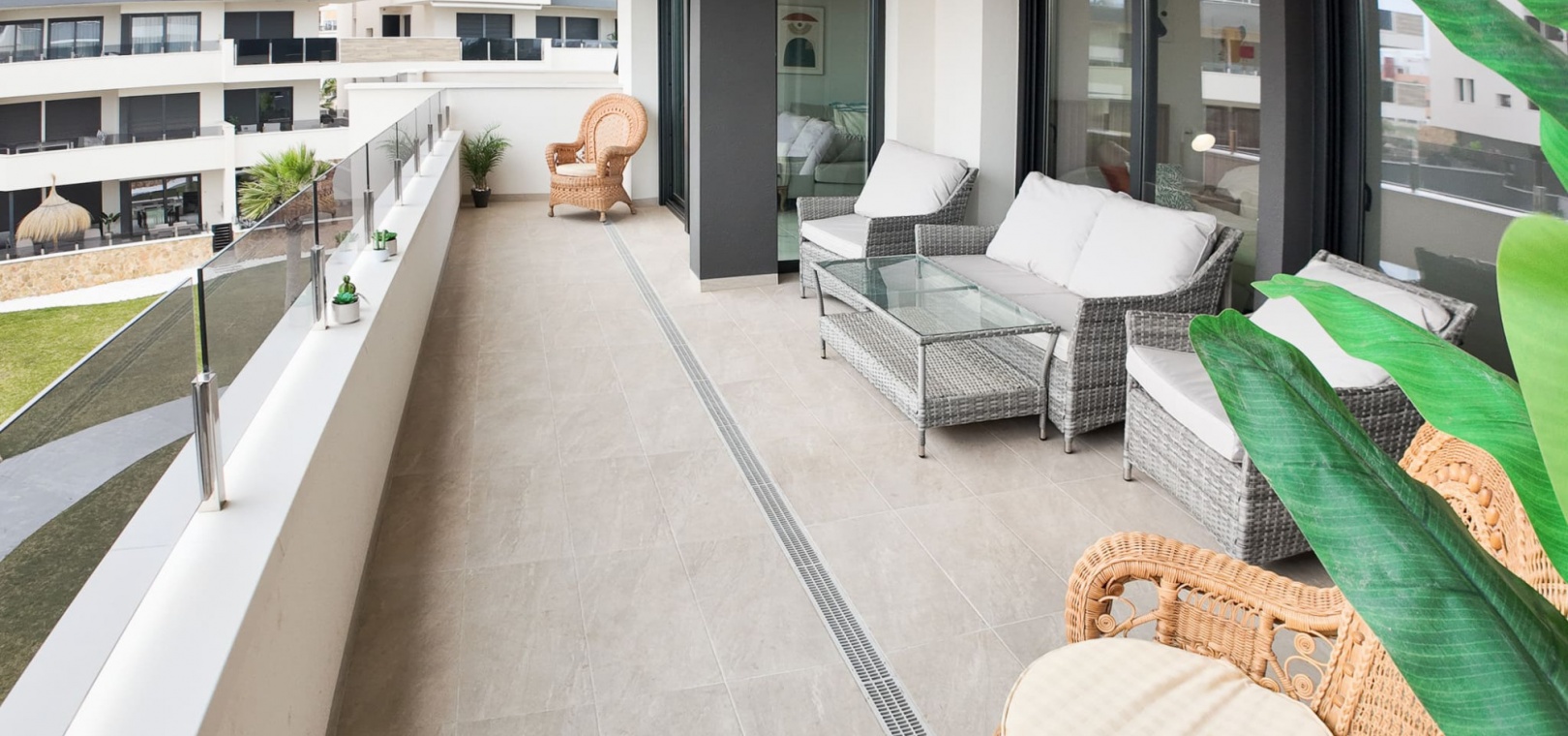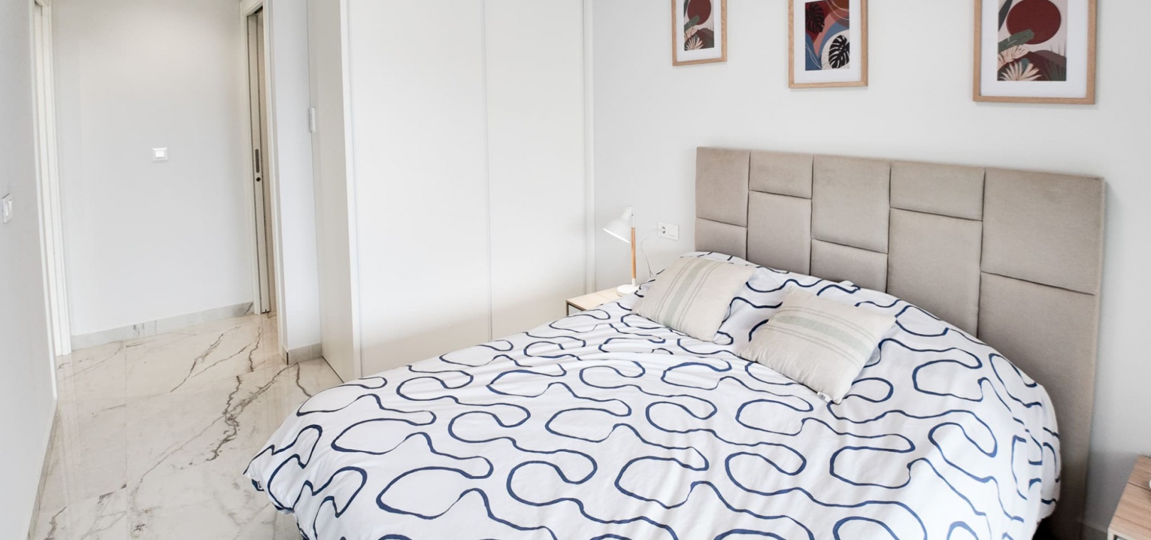 Vardagsrum/matsal, öppet kök med fullt utrustat kök, 2 dubbelrum, det största sovrummet har eget duschrum, 1 gästduschrum, balkong med utsikt över den gemensamma poolen och ner mot havet, gemensam jacuzzi, bastu, gym, lekplats, underjordisk parkeringsplats och förråd, ultramodern design, byggmaterial av högsta klass och mycket mer.