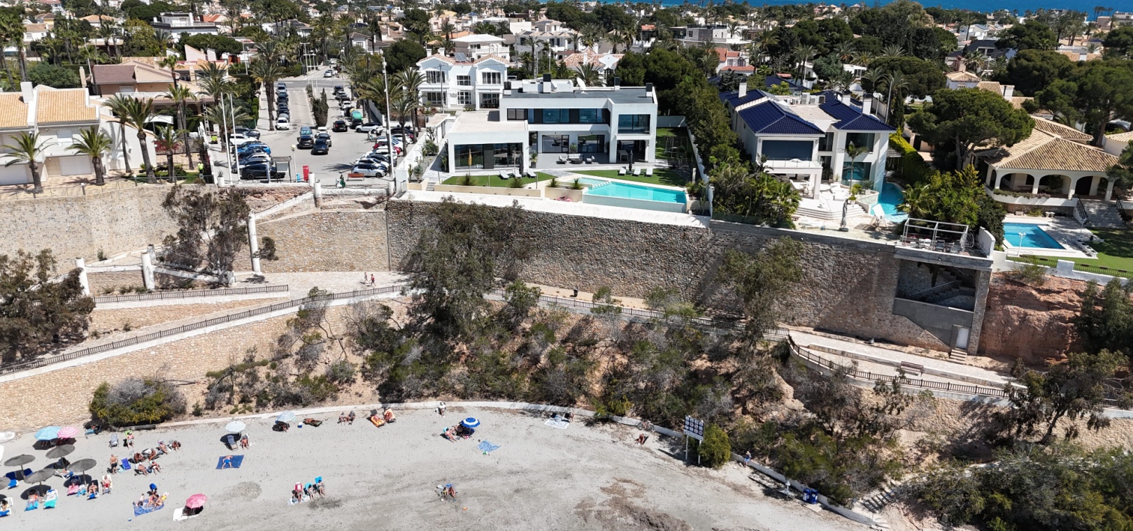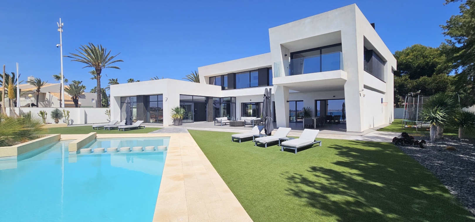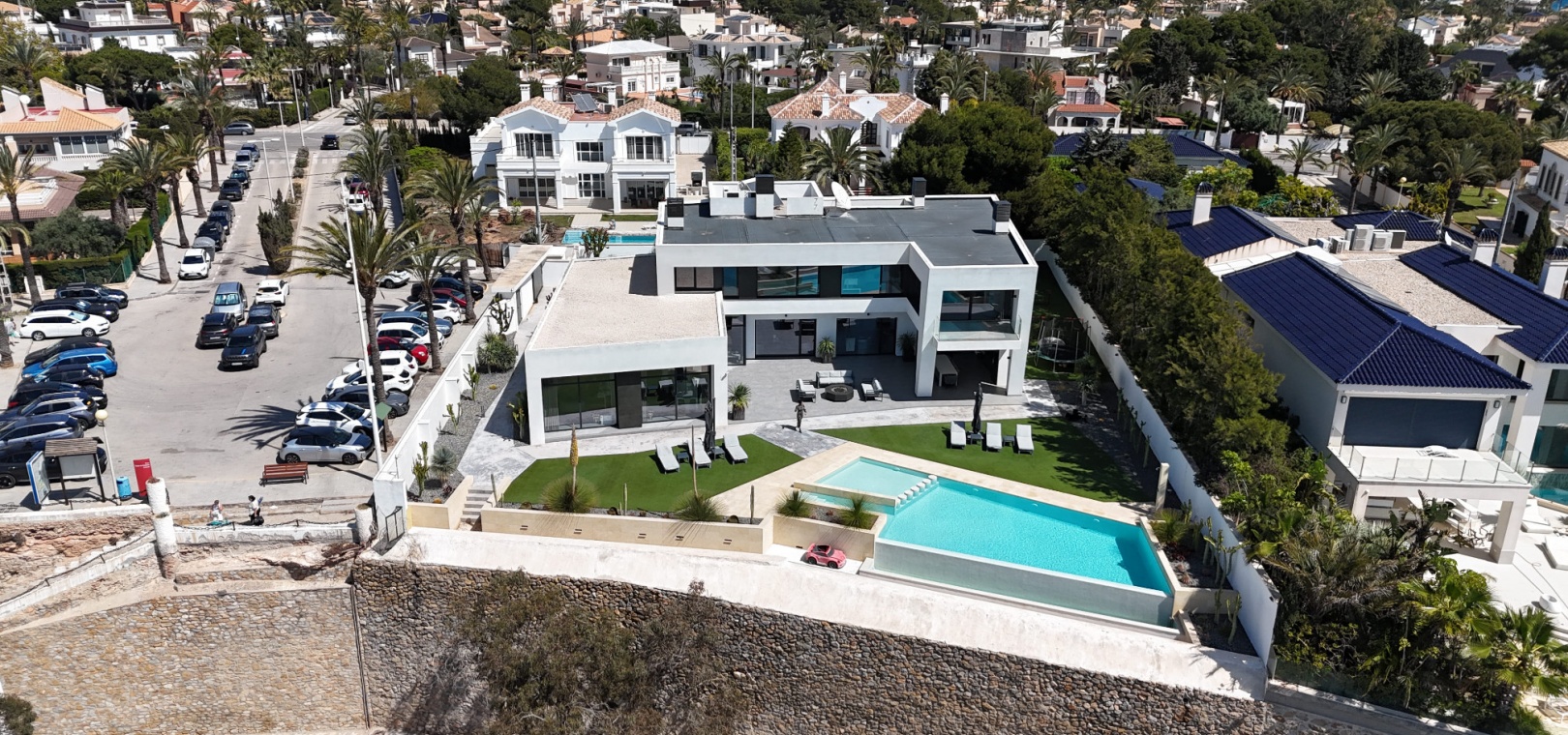 En fantastisk fristående villa med 4 sovrum och 6 badrum på en tomt på 1649m2 med privat pool belägen på första linjen från havet i Cabo Roig, Costa Blanca.