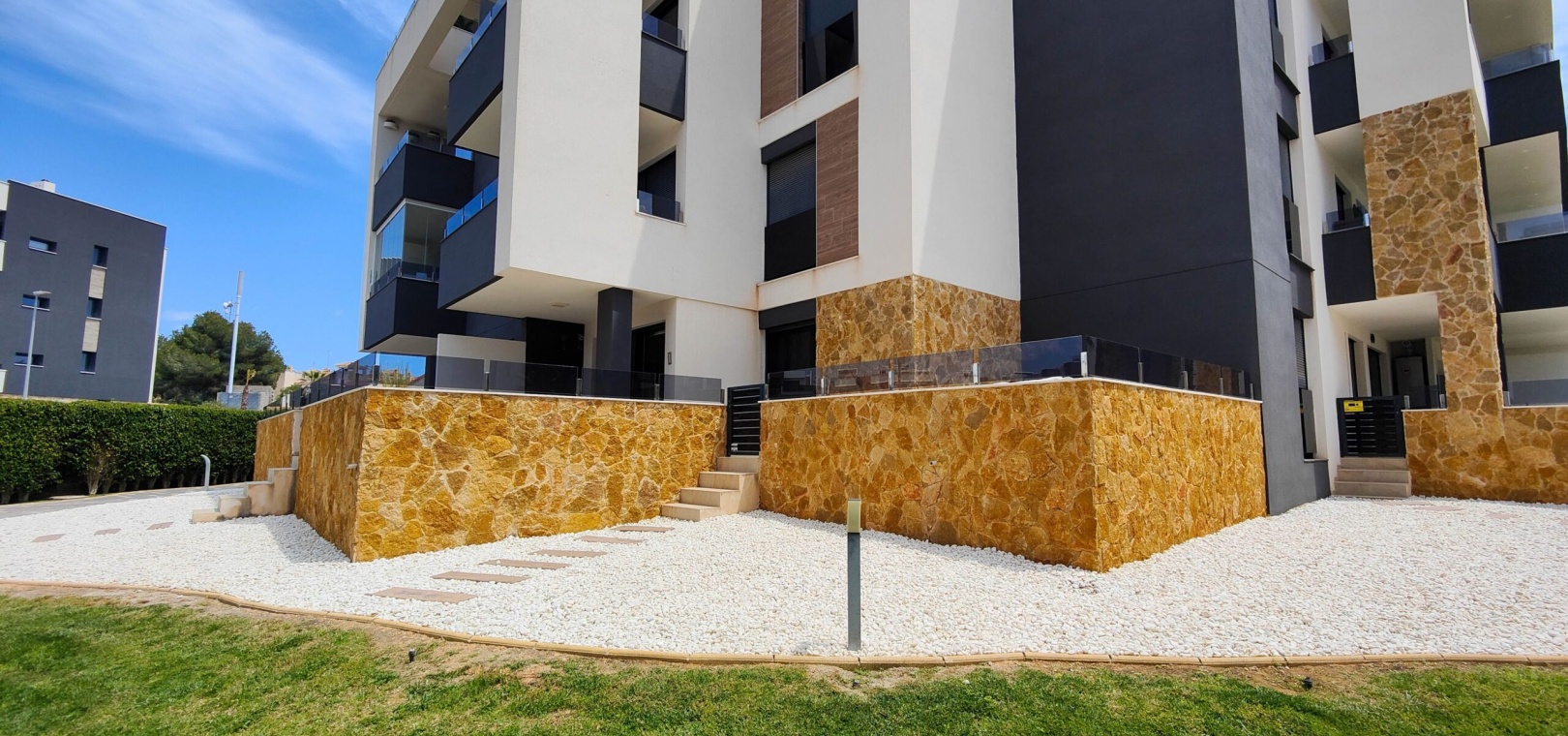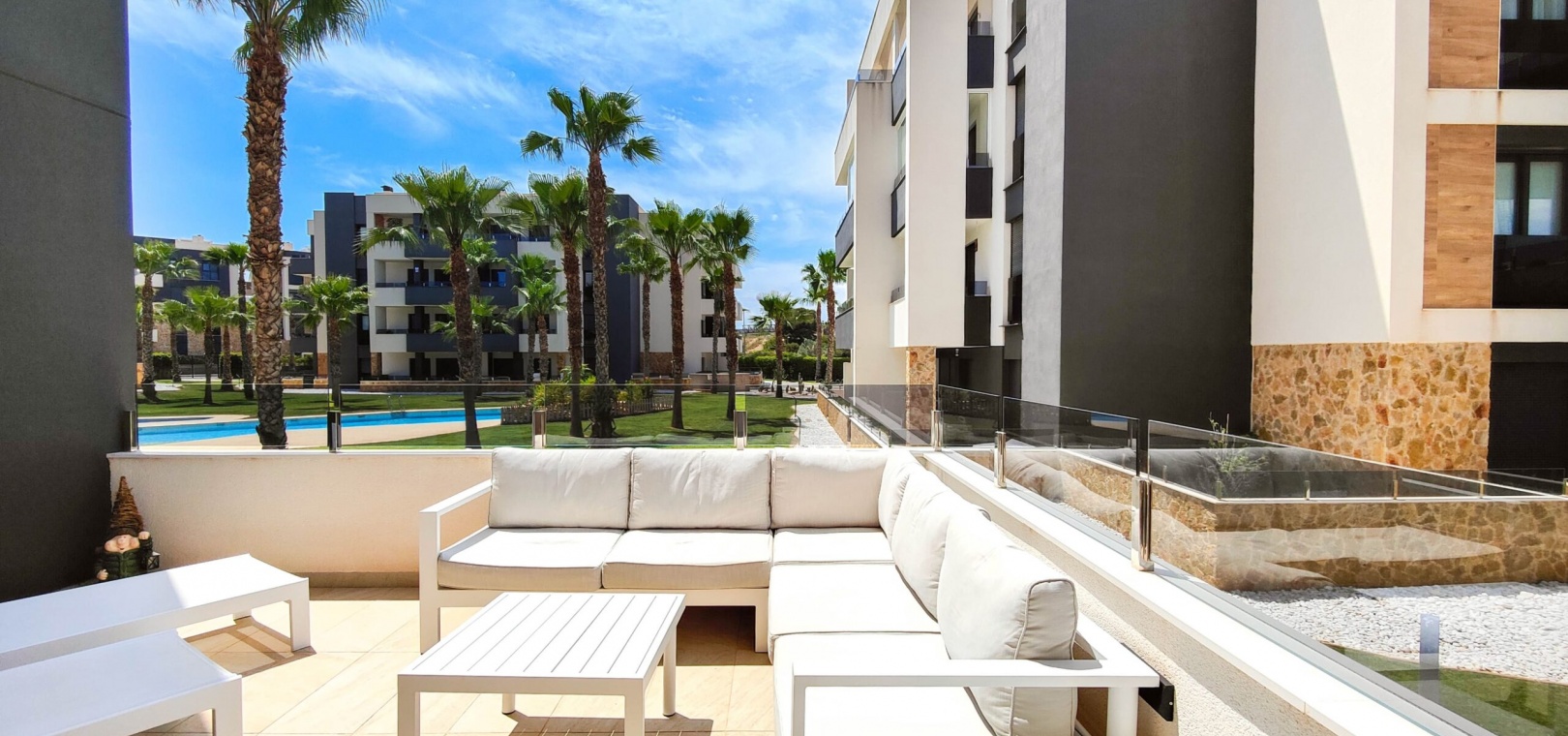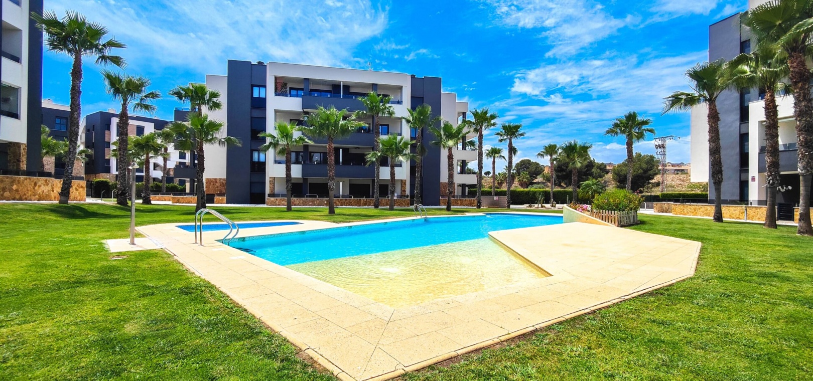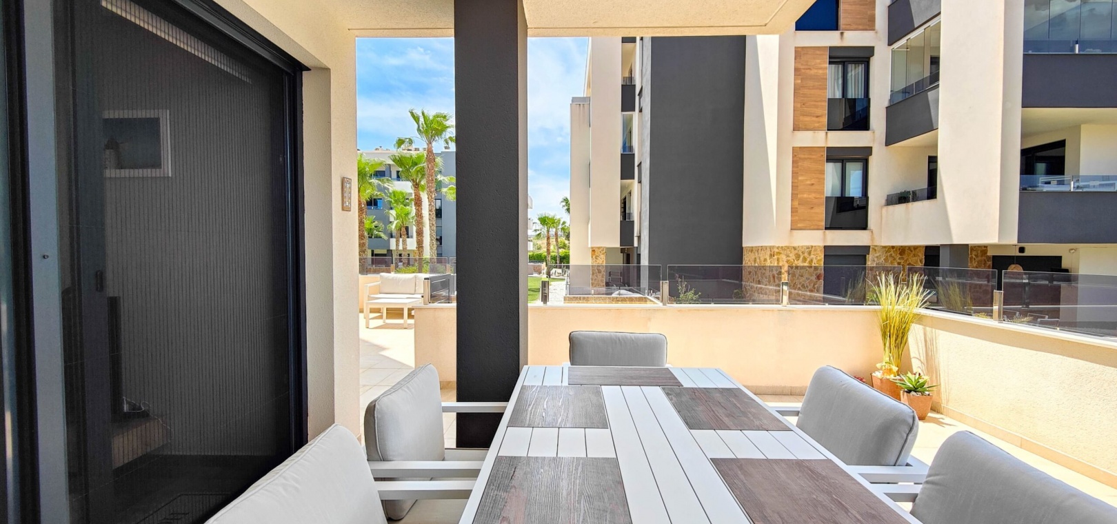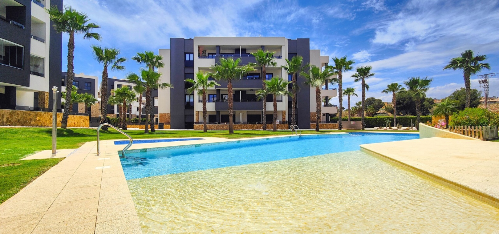 Fantastisk hörnlägenhet på bottenvåningen till salu i Res. Amanecer / Sunrise VI - Orihuela Costa. Upptäck denna eleganta och moderna lägenhet belägen på bottenvåningen i ett prestigefyllt bostadskomplex i Los Altos, La Florida. Fastigheten har en hörnterrass i sydvästläge med direkt utsikt över de vackert anlagda gemensamma trädgårdarna och poolen. Denna ljusa och rymliga lägenhet har 2 sovrum och 2 badrum, ett modernt vardagsrum med öppen planlösning och ett fullt utrustat modernt kök med frukostbar. Köket har högklassiga vitvaror som ugn, mikrovågsugn, kyl-frys, diskmaskin, tvättmaskin och en keramikhäll med fläkt. För extra komfort har badrummen golvvärme. Ytterligare funktioner inkluderar PVC-fönster med elektriska jalusier (fjärrstyrda), central luftkonditionering och fastigheten säljs fullt möblerad – inflyttningsklar. En underjordisk parkeringsplats och ett privat förråd ingår i priset. Beläget i ett säkert, gated community, erbjuder anläggningen exceptionella faciliteter inklusive en stor gemensam pool, en barnpool, palmkantade trädgårdar med chill-out-zoner, en boulebana och ett komplett gym med bastu och jacuzzi. Idealiskt beläget bara några steg från en Aldi-stormarknad och en kort bilresa från det berömda köpcentret Zenia Boulevard och de vackra stränderna i Orihuela Costa.