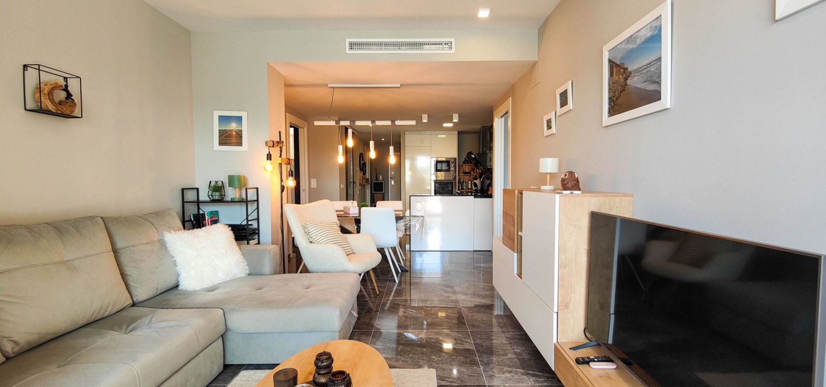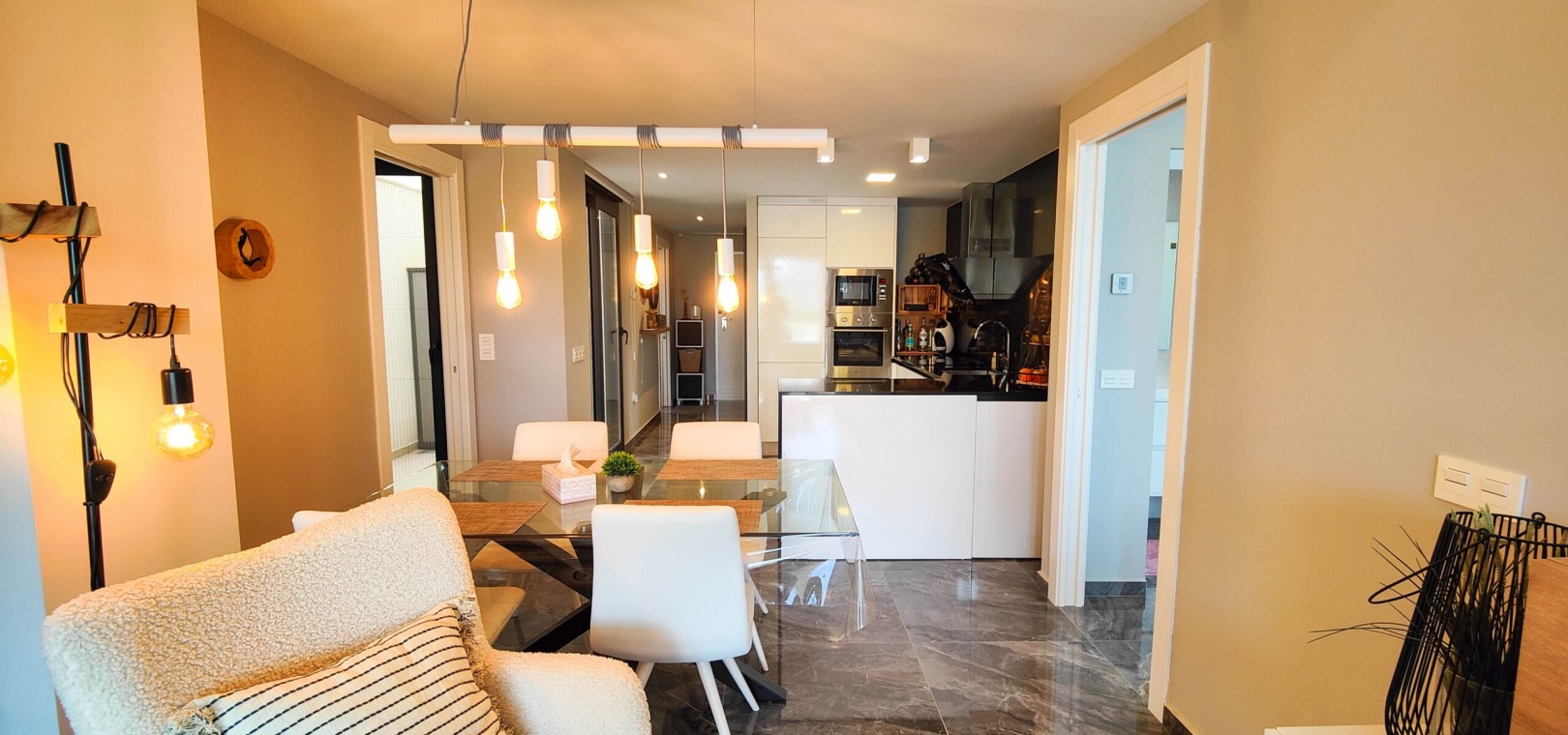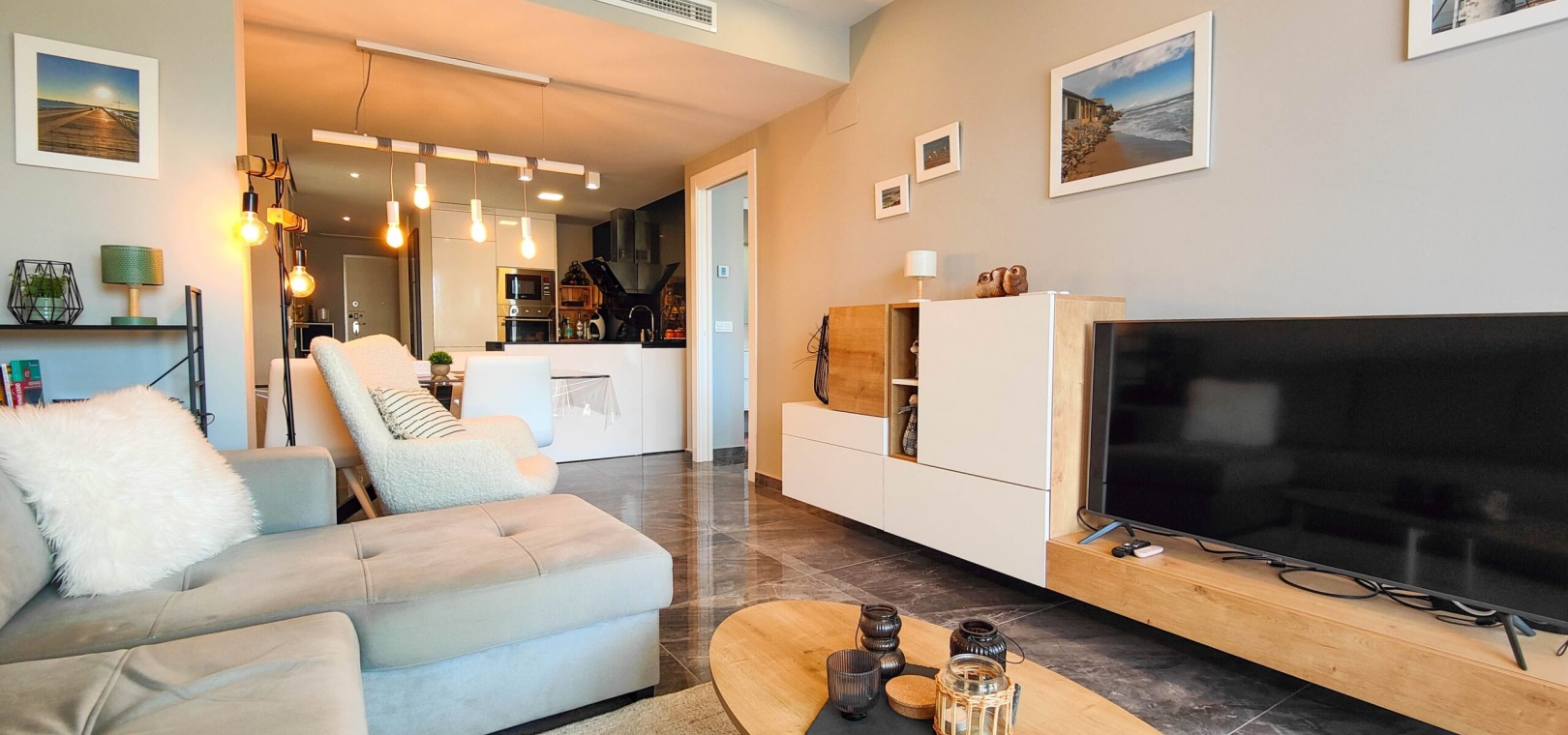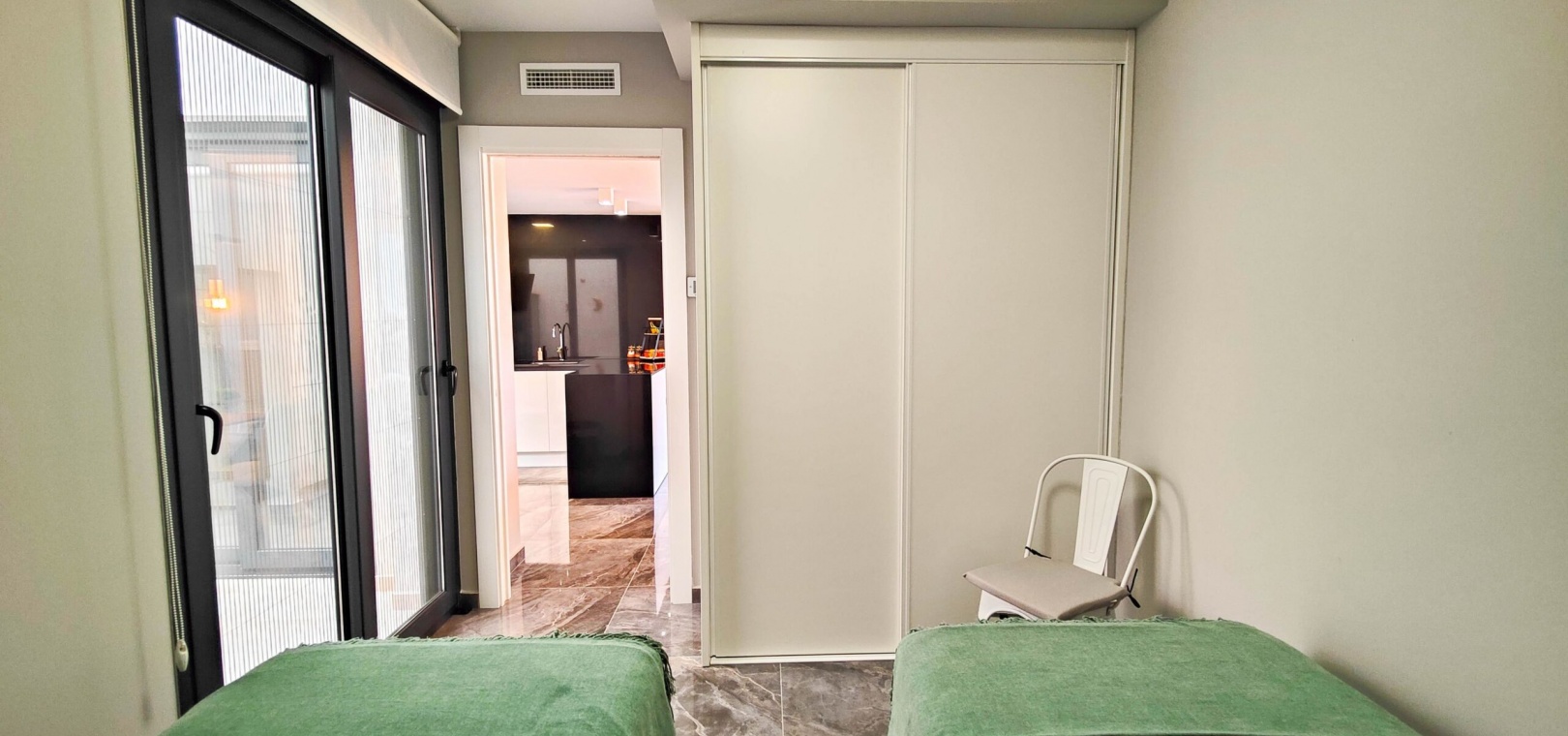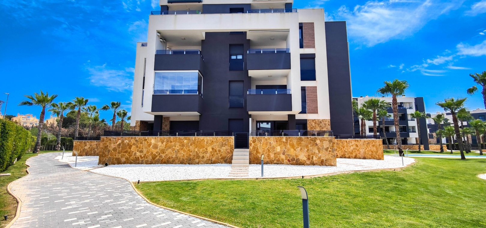 Fantastisk hörnlägenhet på bottenvåningen till salu i Res. Amanecer / Sunrise VI - Orihuela Costa. Upptäck denna eleganta och moderna lägenhet belägen på bottenvåningen i ett prestigefyllt bostadskomplex i Los Altos, La Florida. Fastigheten har en hörnterrass i sydvästläge med direkt utsikt över de vackert anlagda gemensamma trädgårdarna och poolen. Denna ljusa och rymliga lägenhet har 2 sovrum och 2 badrum, ett modernt vardagsrum med öppen planlösning och ett fullt utrustat modernt kök med frukostbar. Köket har högklassiga vitvaror som ugn, mikrovågsugn, kyl-frys, diskmaskin, tvättmaskin och en keramikhäll med fläkt. För extra komfort har badrummen golvvärme. Ytterligare funktioner inkluderar PVC-fönster med elektriska jalusier (fjärrstyrda), central luftkonditionering och fastigheten säljs fullt möblerad – inflyttningsklar. En underjordisk parkeringsplats och ett privat förråd ingår i priset. Beläget i ett säkert, gated community, erbjuder anläggningen exceptionella faciliteter inklusive en stor gemensam pool, en barnpool, palmkantade trädgårdar med chill-out-zoner, en boulebana och ett komplett gym med bastu och jacuzzi. Idealiskt beläget bara några steg från en Aldi-stormarknad och en kort bilresa från det berömda köpcentret Zenia Boulevard och de vackra stränderna i Orihuela Costa.
