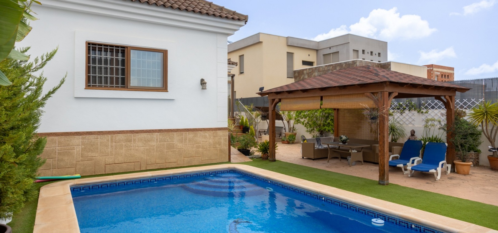 Byggd yta: 417 m² Tomtstorlek: 532 m² 4 ljusa och luftiga sovrum 3 moderna badrum Stort vardagsrum/matrum med öppen spis och direkt tillgång till veranda och terrass Fullt utrustat separat kök med moderna apparater Privat pool omgiven av medelhavsträdgårdar Generösa terrasser och skuggiga utomhusområden för njutning året runt Rymlig källare med möjlighet till spelrum, gym, vinkällare eller separat vardagsrum Privat garage med extra förvaring
