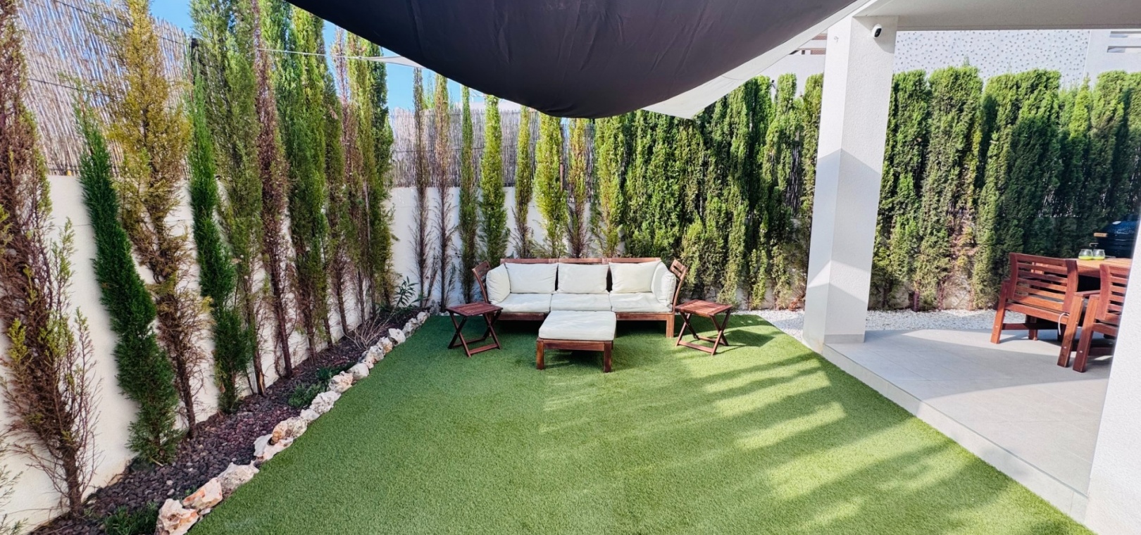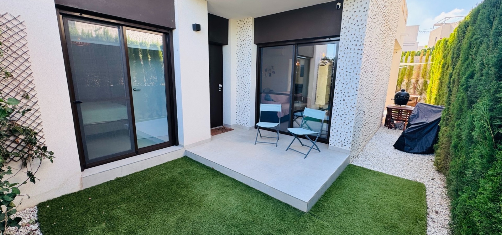 På baksidan hittar du en täckt terrass med grillplats , perfekt för uteservering och umgänge. Trädgården erbjuder gott om plats för solstolar och skuggiga områden för avkoppling.