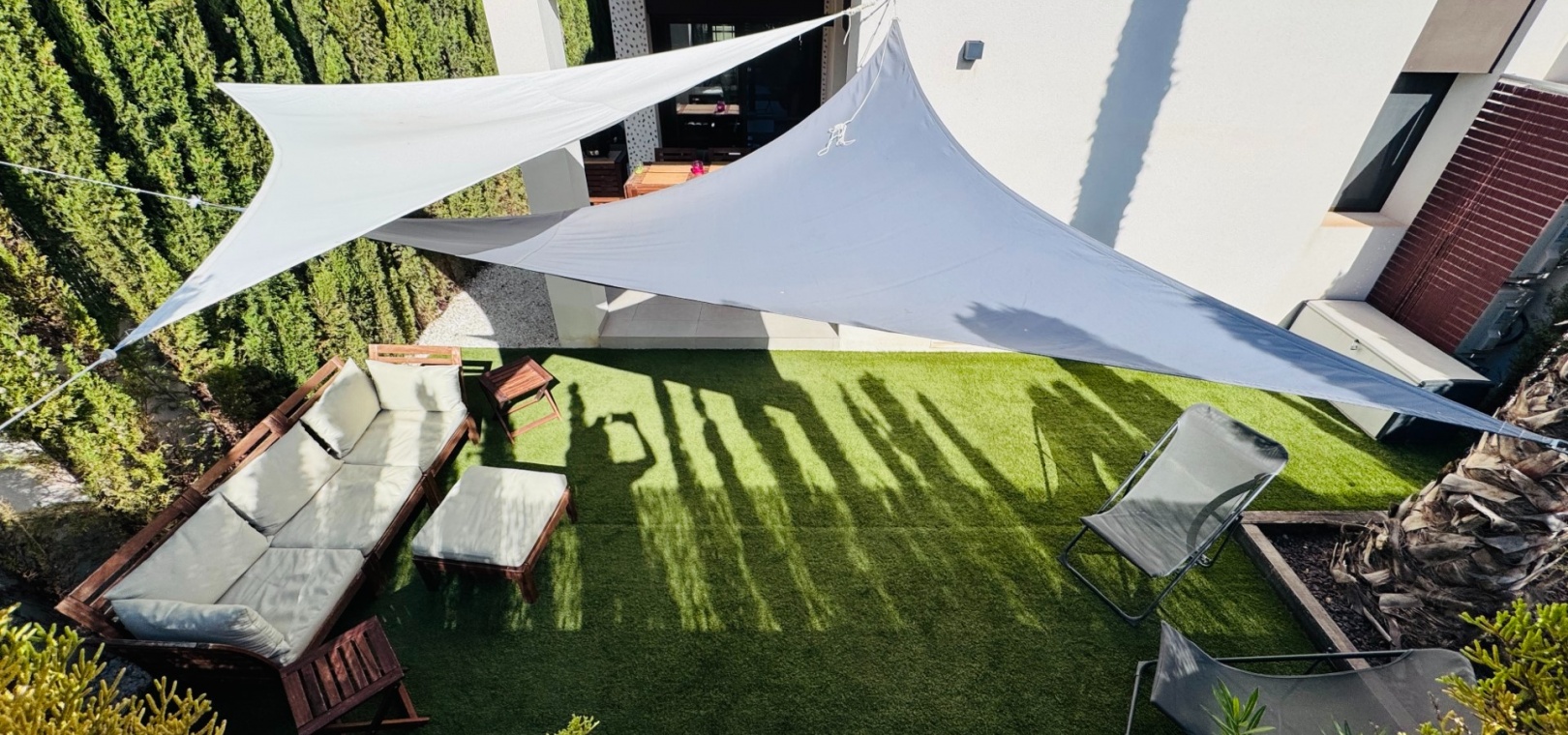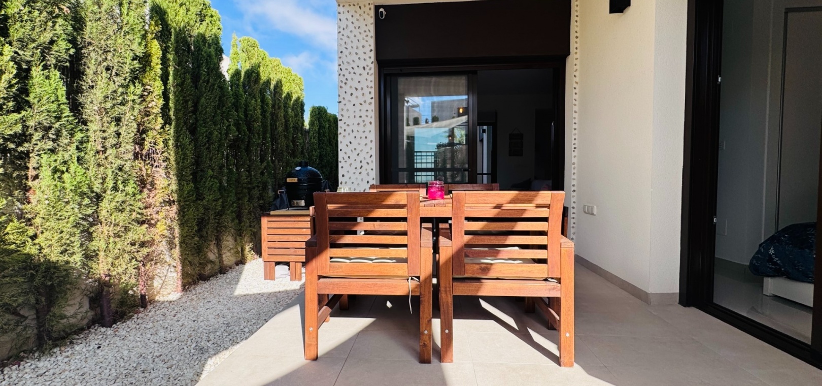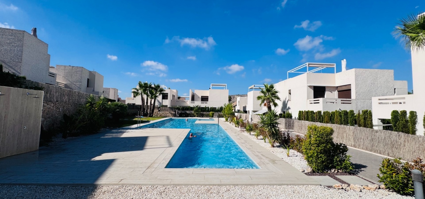 De boende har tillgång till en vacker gemensam pool och anlagda trädgårdar , som ligger precis bakom lägenheten.
