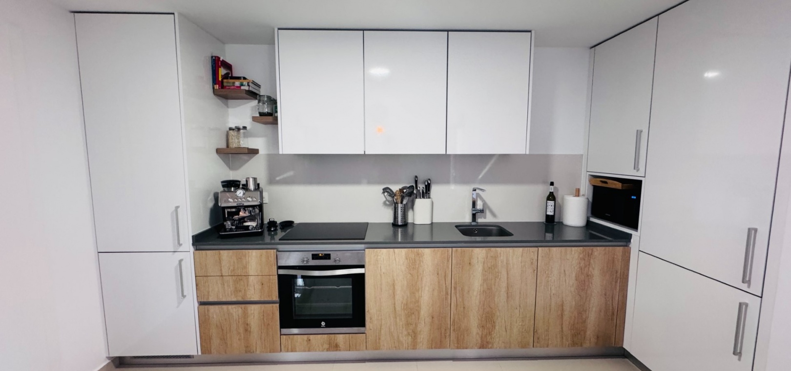 Inuti har den ljusa öppna vardagsrums- och matplatsen altandörrar som leder till både fram- och bakgården. Det moderna köket är fullt utrustat med vägg- och bänkskåp, integrerad ugn, spishäll, köksfläkt, diskmaskin, tvättmaskin och kyl/frys. Vattenkokaren finns i ett praktiskt förvaringsskåp.