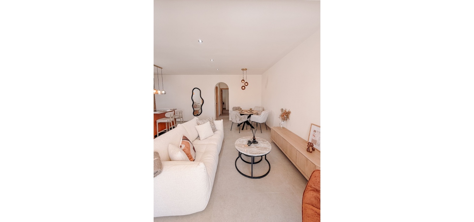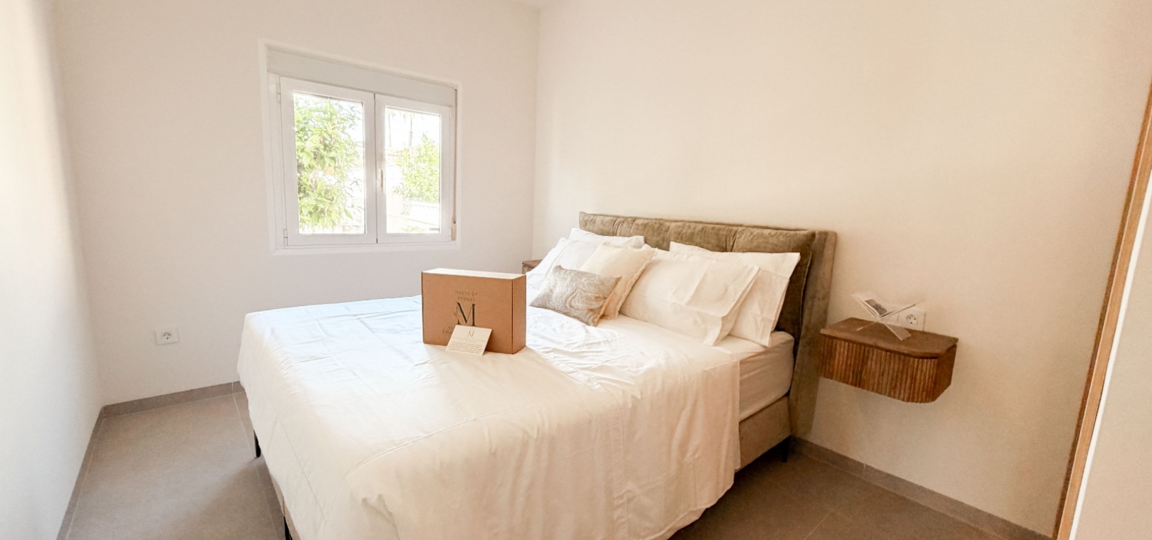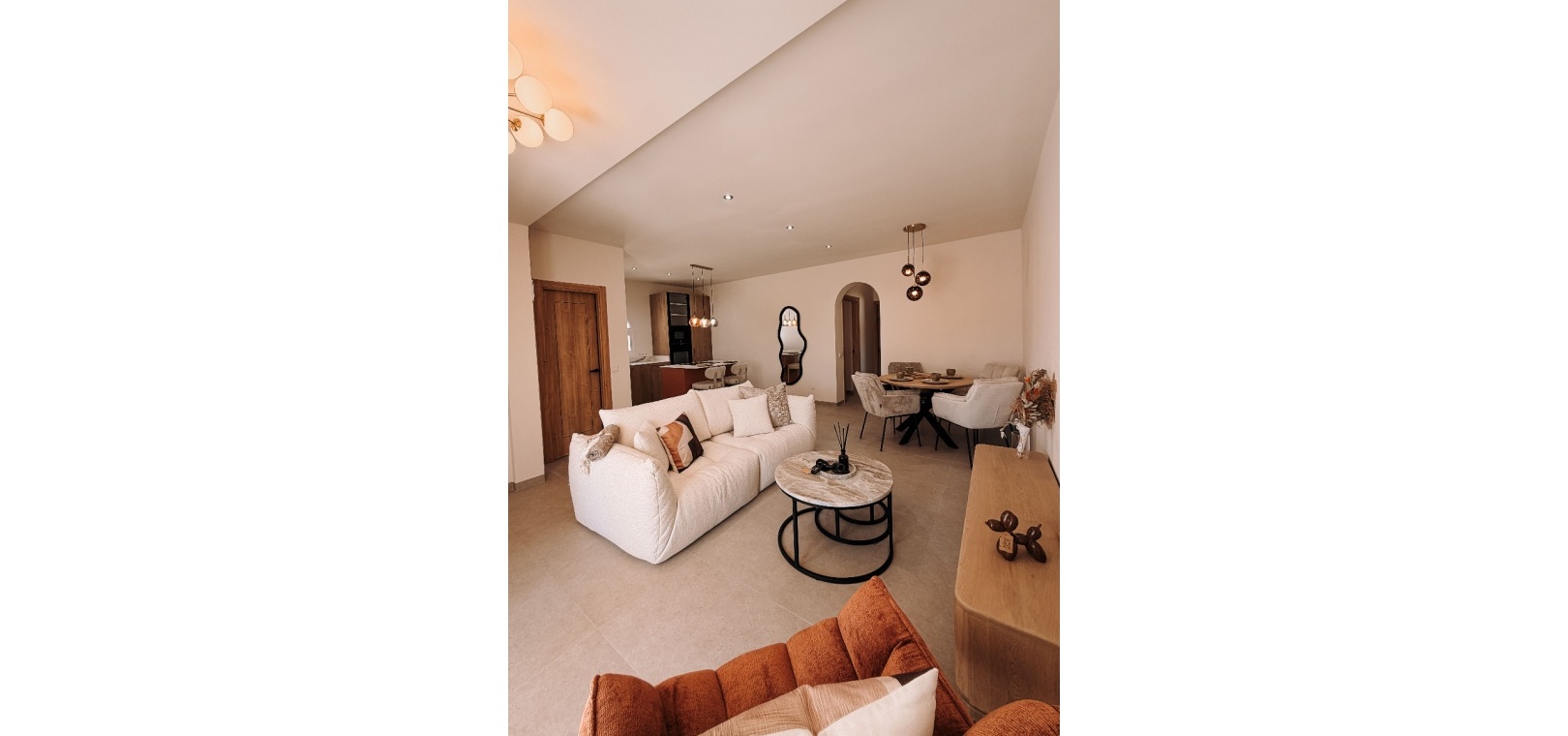 Ett ljust och öppet vardagsrum utformat för komfort, sammanhållning och enkel underhållning. Två lugna dubbelrum och två vackert inredda badrum. Enkelt flöde mellan inomhus- och utomhusutrymmen – perfekt för medelhavslivsstil. Genomtänkta inredningar av Bella , vars varma toner och moderna inslag skapar en sammanhängande och inbjudande atmosfär rakt igenom. Ett garage som erbjuder mångsidighet – enkelt omvandlas till ett rymligt tredje sovrum eller gästsvit.
