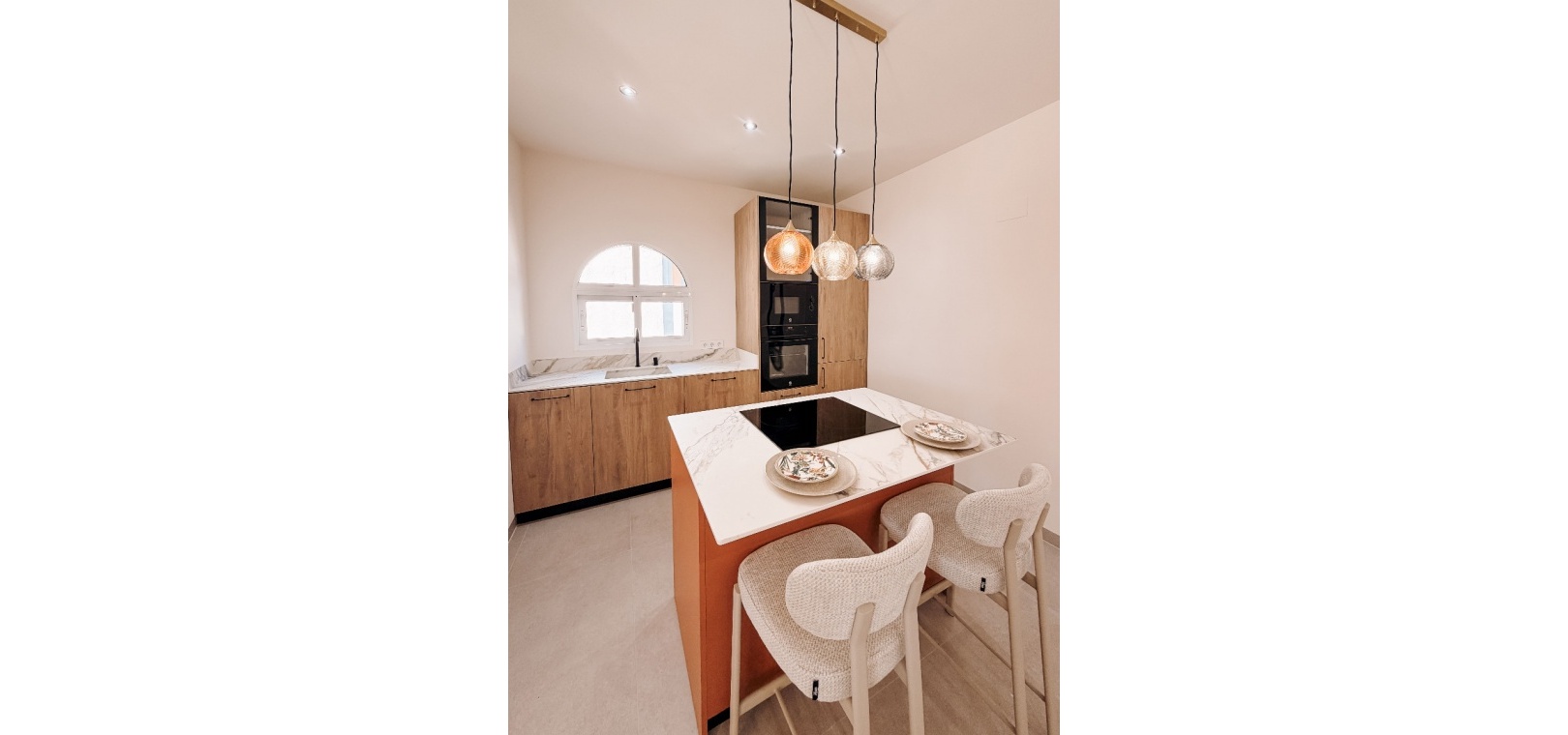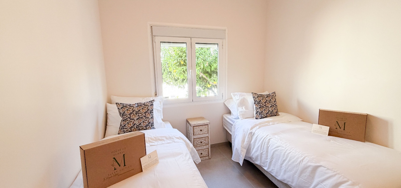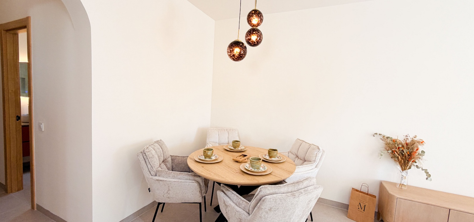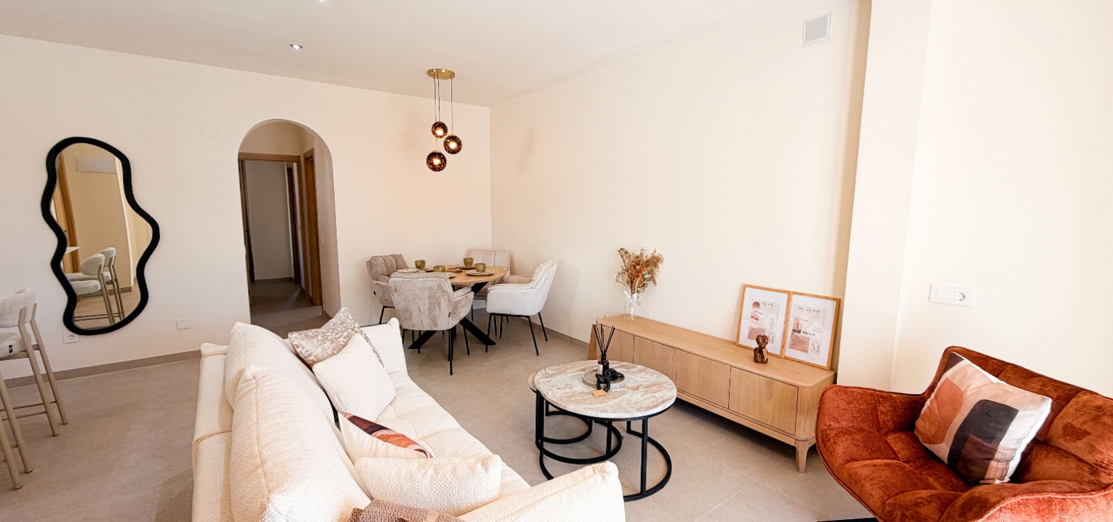 Ett ljust och öppet vardagsrum utformat för komfort, sammanhållning och enkel underhållning. Två lugna dubbelrum och två vackert inredda badrum. Enkelt flöde mellan inomhus- och utomhusutrymmen – perfekt för medelhavslivsstil. Genomtänkta inredningar av Bella , vars varma toner och moderna inslag skapar en sammanhängande och inbjudande atmosfär rakt igenom. Ett garage som erbjuder mångsidighet – enkelt omvandlas till ett rymligt tredje sovrum eller gästsvit.