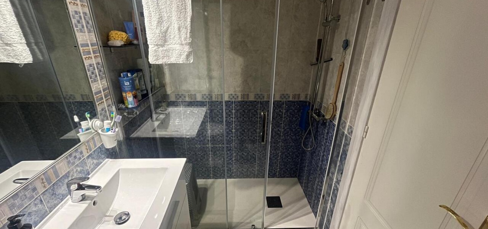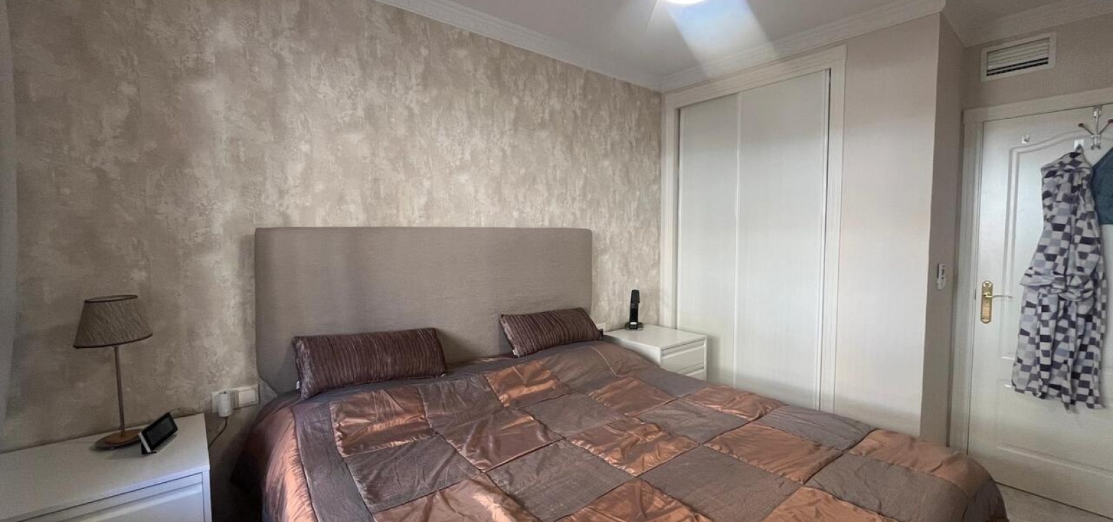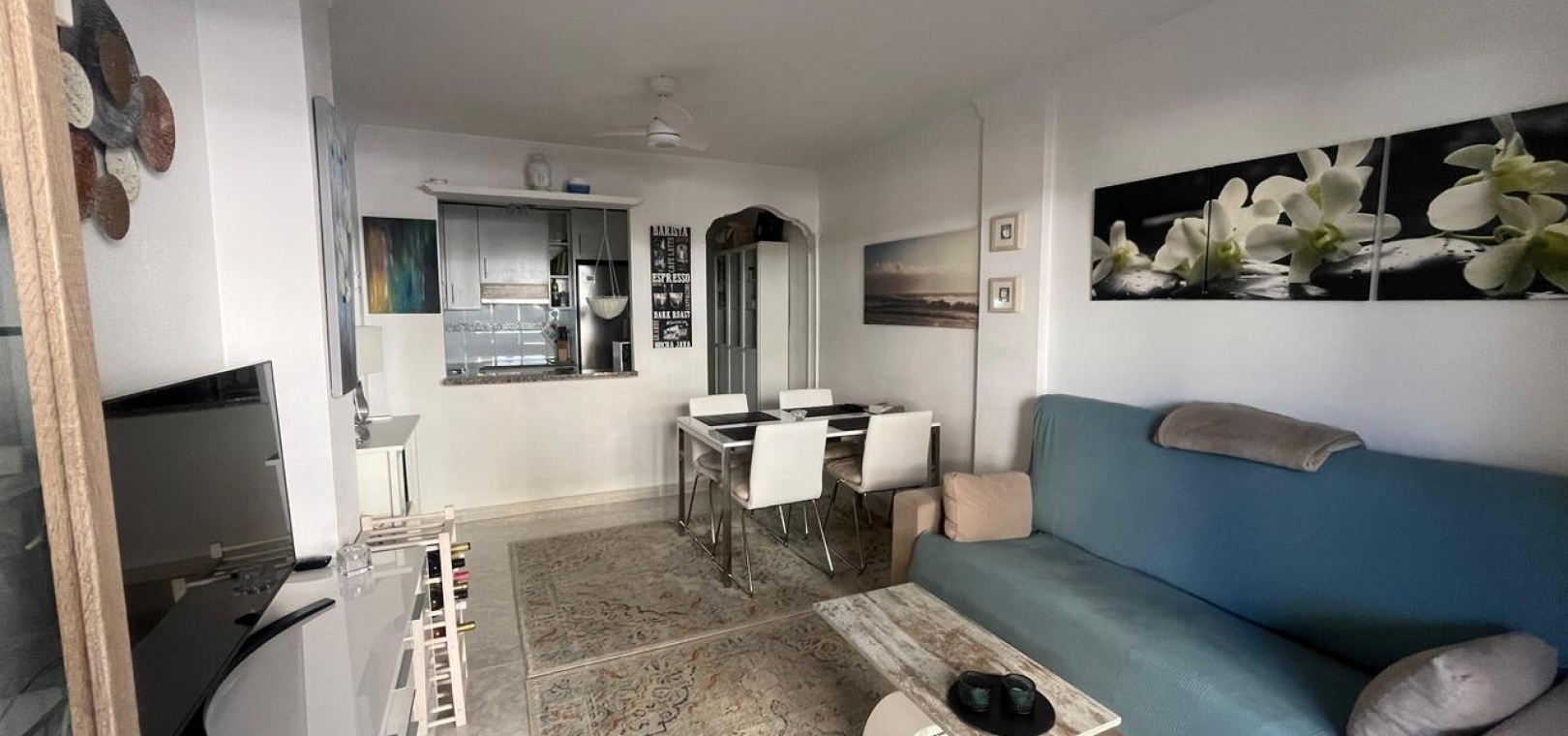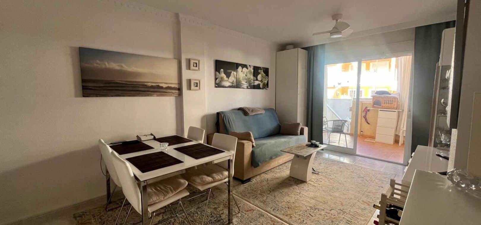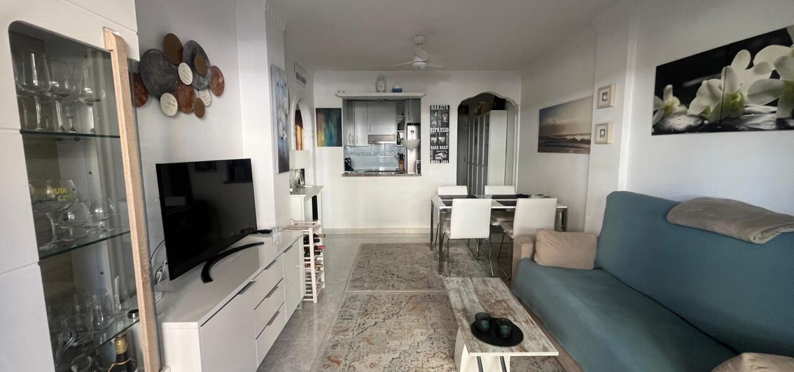 Inuti har lägenheten en ljus och modern interiör med ett öppet vardagsrum och matplats, ett fullt utrustat modernt kök och två välproportionerade sovrum. Fastigheten har två terrasser : en öppen terrass perfekt för att njuta av solen, och en inglasad terrass med glasgardiner , vilket erbjuder ett mångsidigt extra bostadsutrymme som kan avnjutas året runt. Panelerna kan öppnas helt under de varmare månaderna eller stängas för extra komfort under de kallare årstiderna.