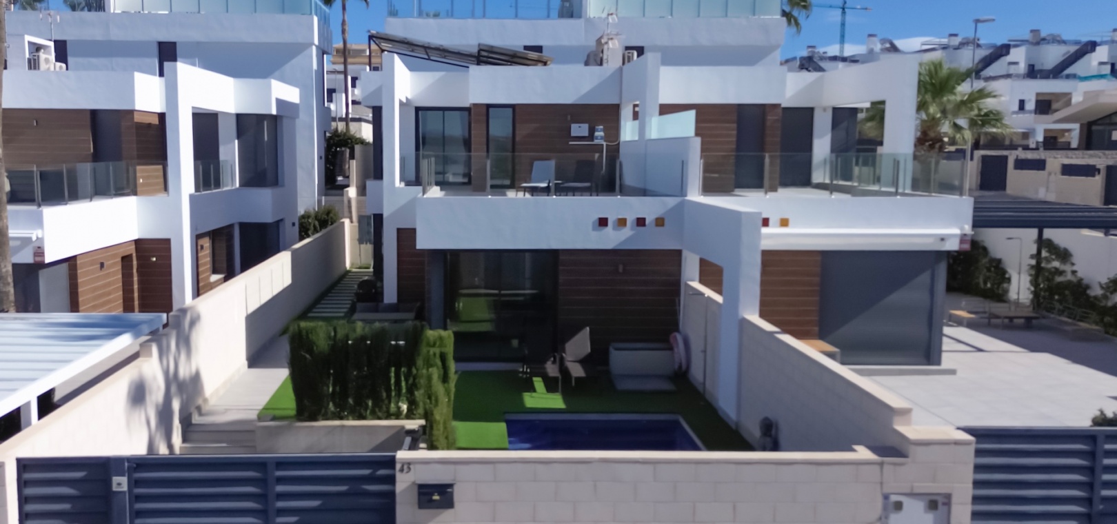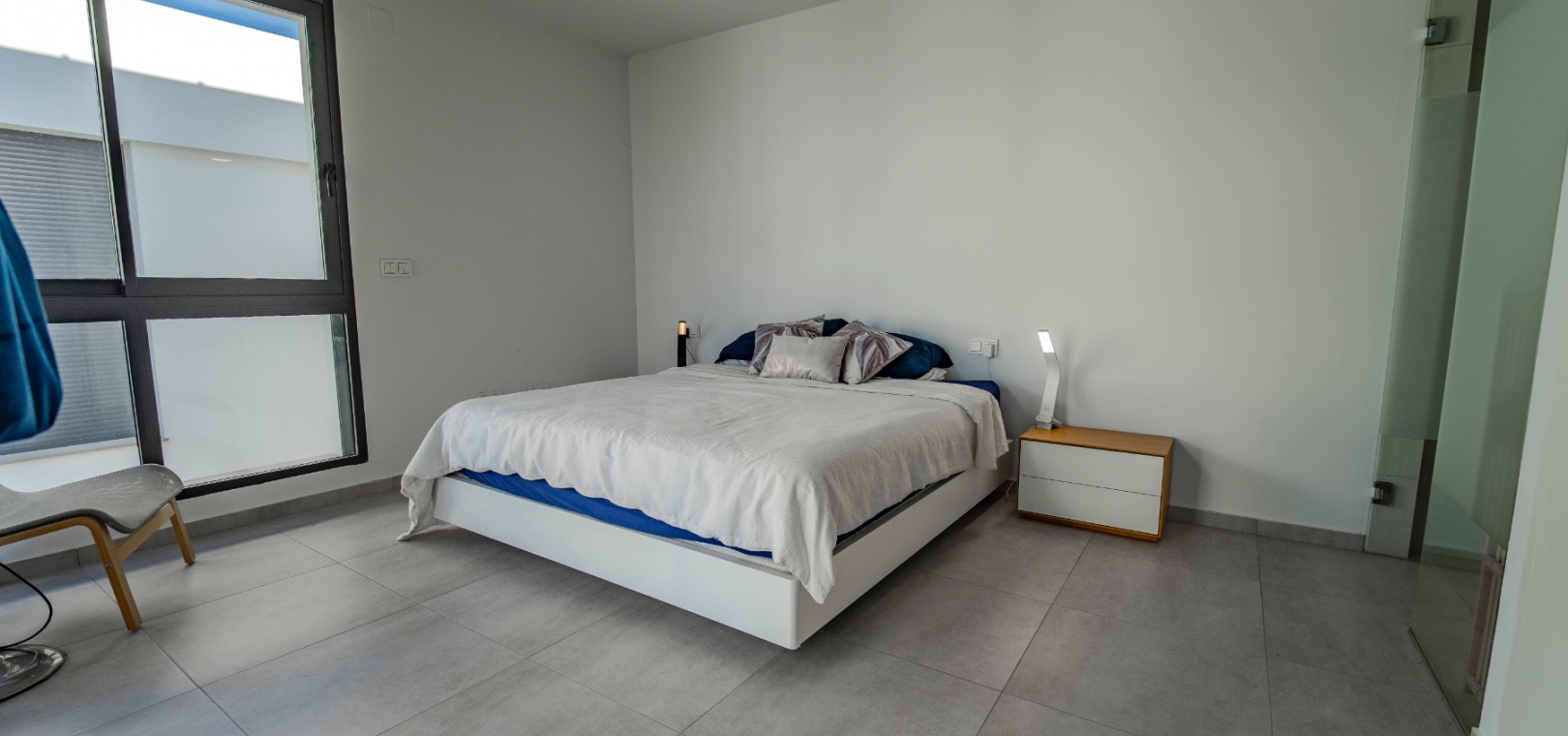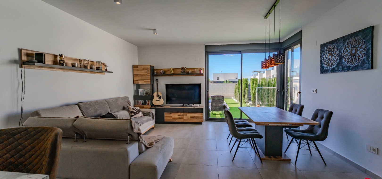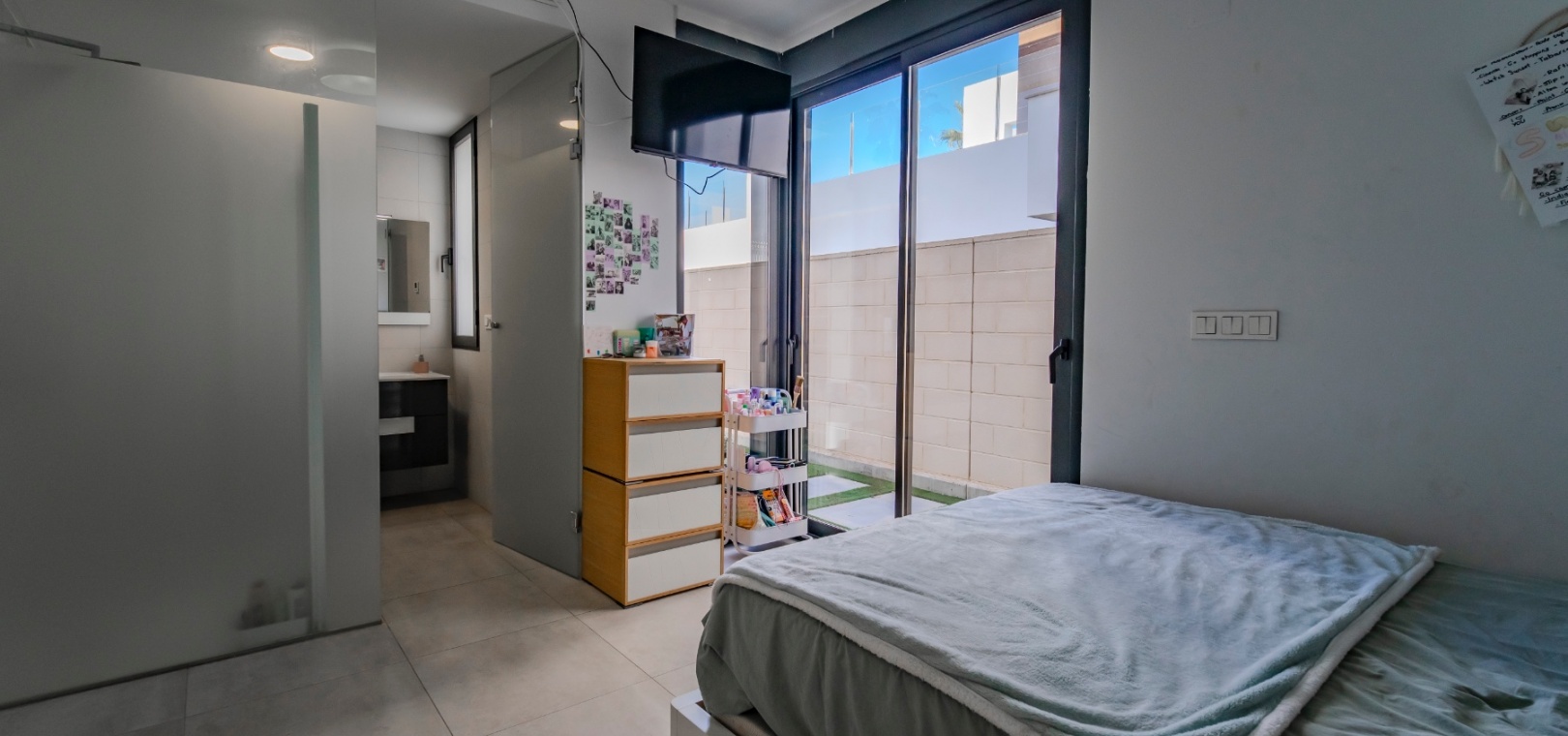 3 sovrum | 3 badrum Öppen planlösning mellan vardagsrum, matsal och kök Högblankt modernt kök med integrerade vitvaror Golvvärme i alla badrum Kanaliserad luftkonditionering på bottenvåningen + enhet på övervåningen Master-svit med omklädningsrum, eget badrum och tillgång till solarium Privat pool, utomhusdusch och anlagd trädgård Parkering utanför vägen med elektrisk grind Solpaneler med batterilagringssystem IBI/Suma: 465 € per år
