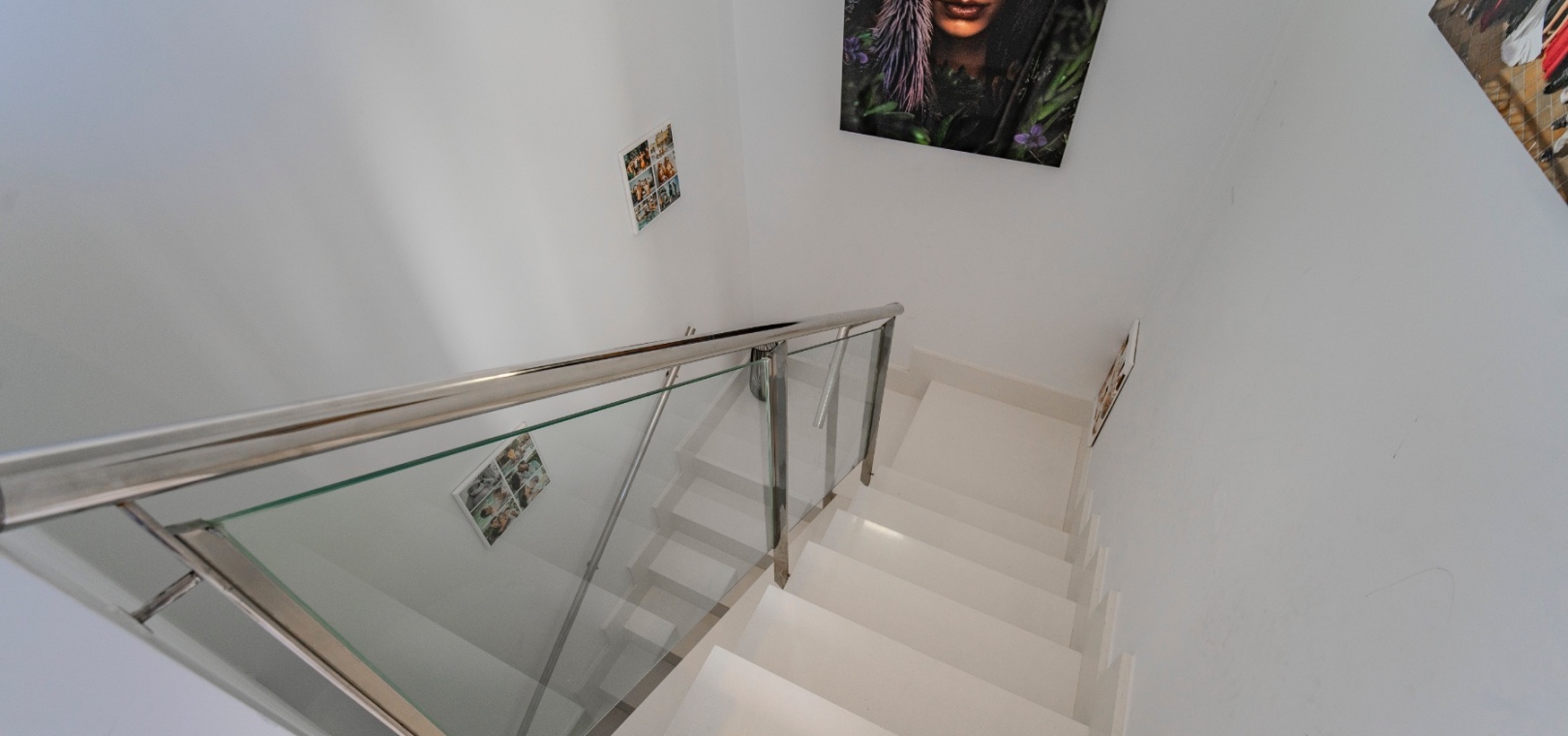 Bottenvåningen har två rymliga dubbelrum, båda med inbyggda garderober. Ett sovrum har direkt tillgång till trädgården och ett eget badrum, medan det andra är bekvämt beläget bredvid ett elegant familjebadrum med duschkabin. Ytterligare förvaring under trappan ger praktisk vardagsbekvämlighet.