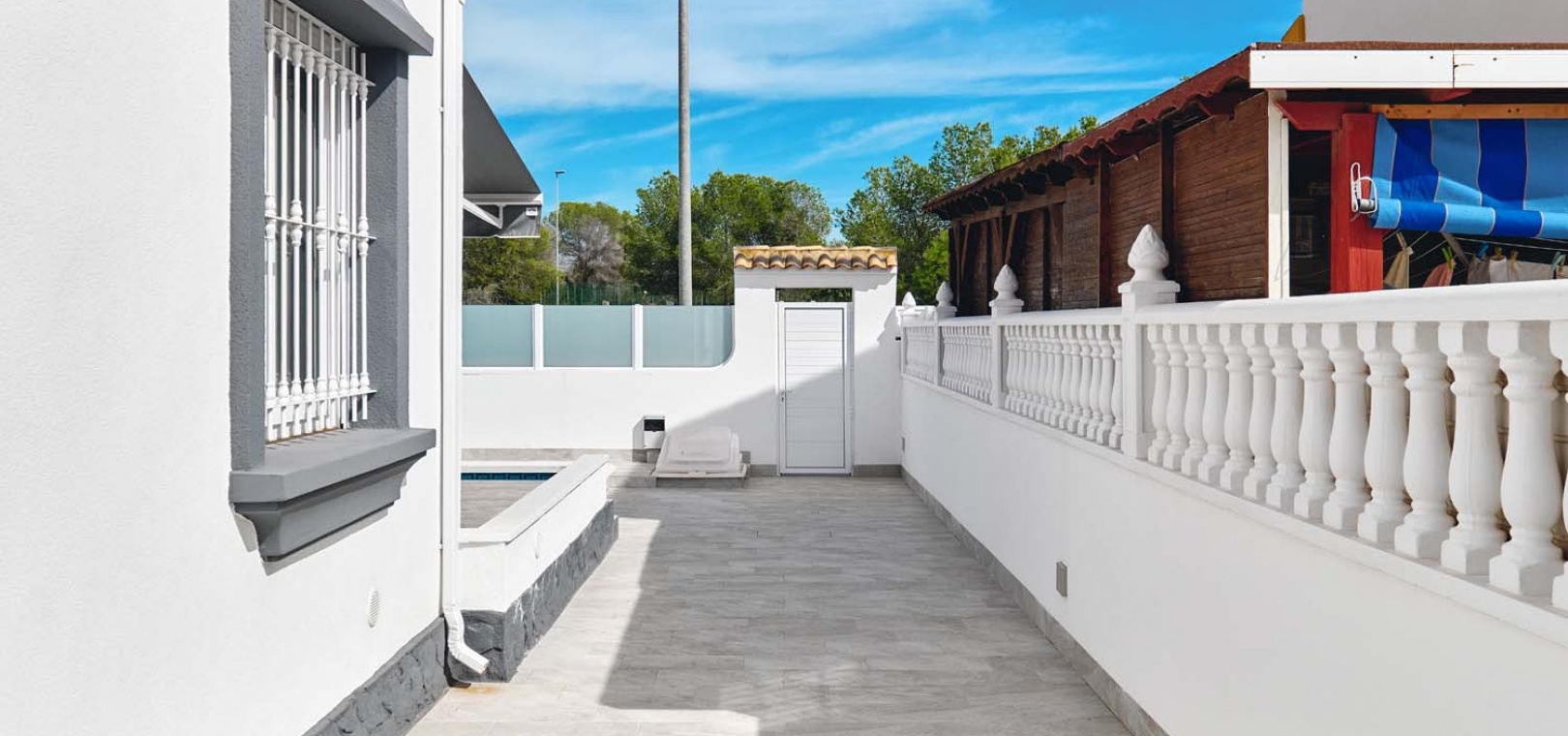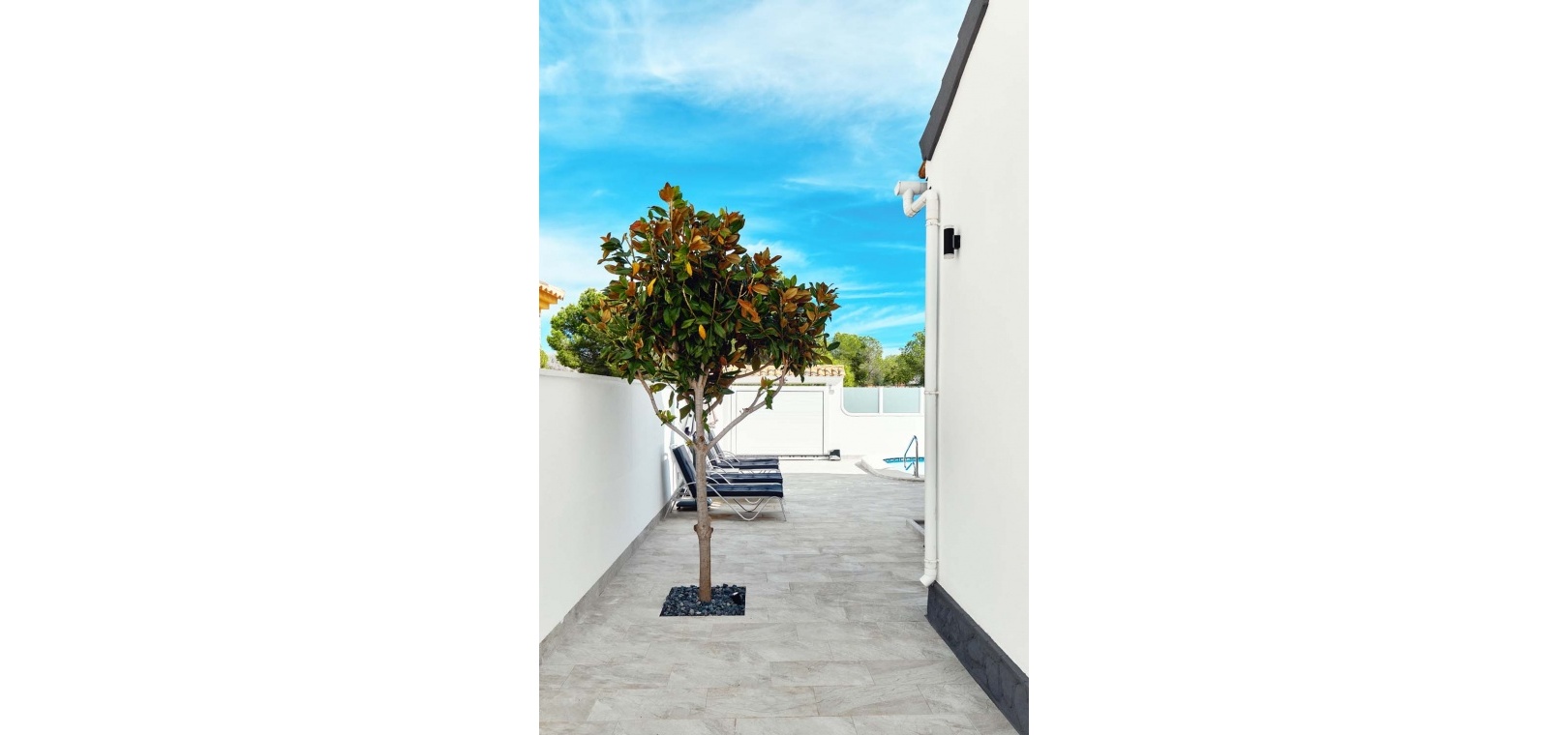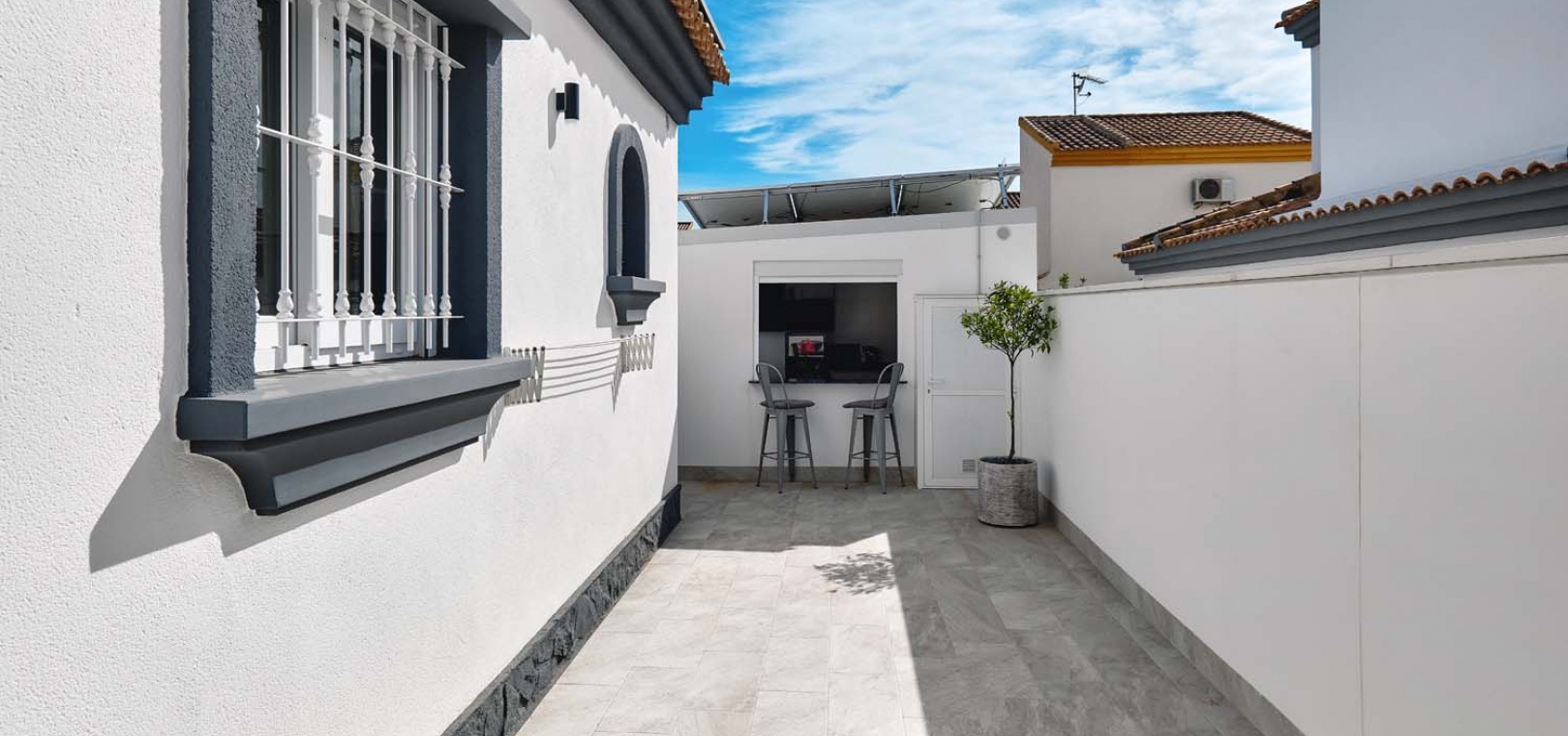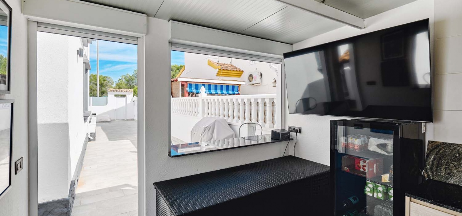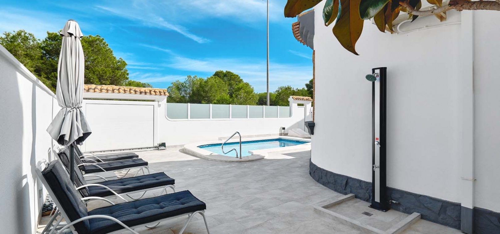 Utomhus erbjuder tomten allt som behövs för att njuta av medelhavslivsstilen: en privat pool, parkering utanför gatan via en elektrisk grind, en solcellsdusch och ett fantastiskt fullt utrustat utekök och bar – perfekt för att underhålla familj och vänner. Uteköket har omsorgsfullt utformats med gott om förvaring, diskho, spishäll och stängningspaneler för att säkra det när det inte används.