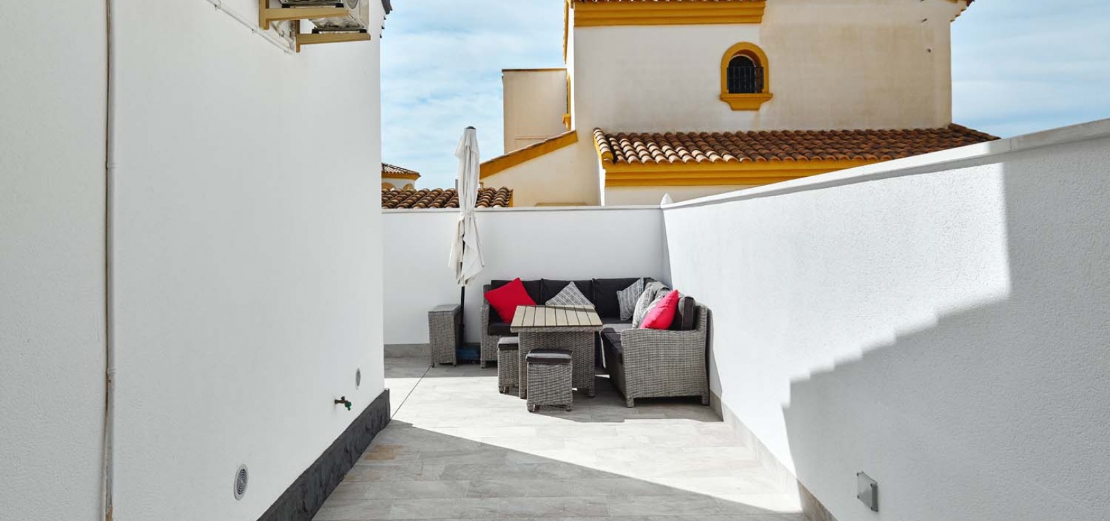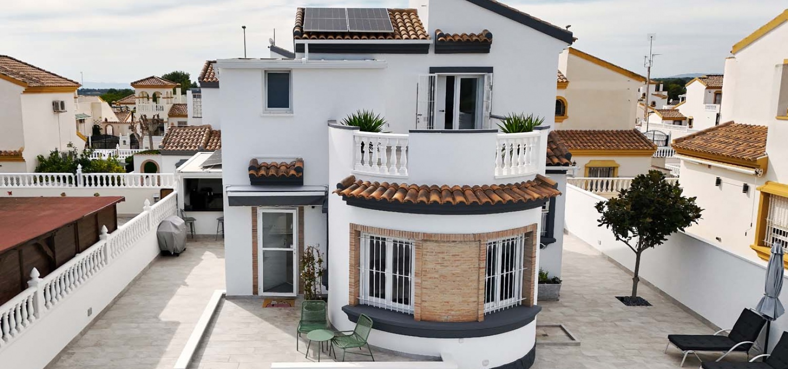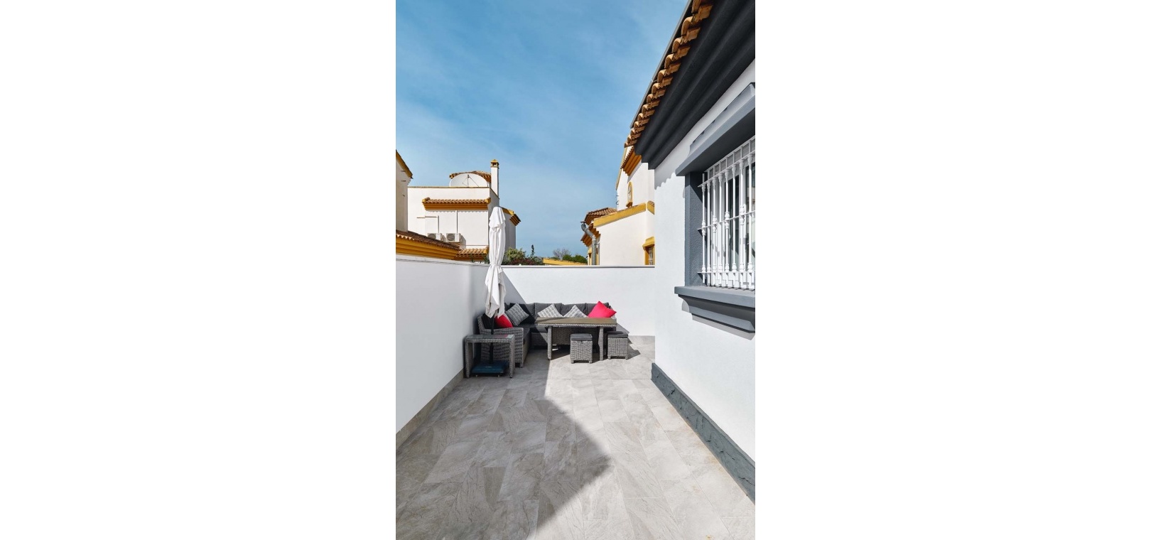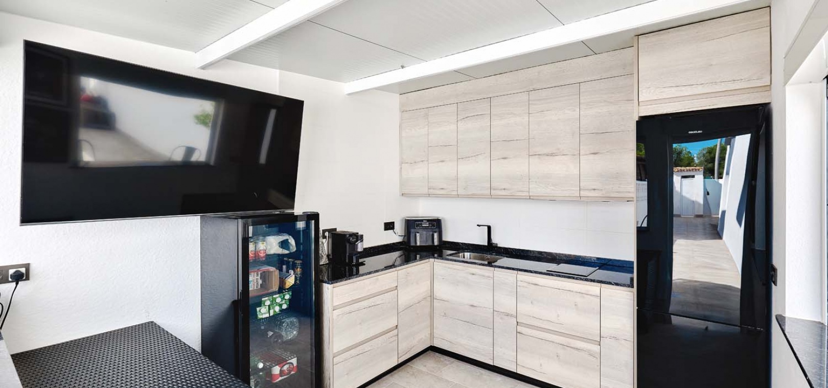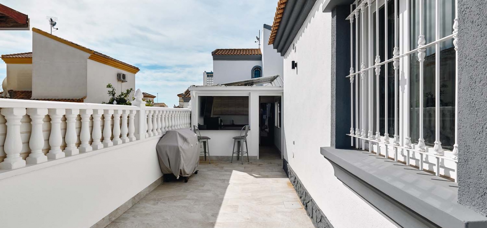 Utomhus erbjuder tomten allt som behövs för att njuta av medelhavslivsstilen: en privat pool, parkering utanför gatan via en elektrisk grind, en solcellsdusch och ett fantastiskt fullt utrustat utekök och bar – perfekt för att underhålla familj och vänner. Uteköket har omsorgsfullt utformats med gott om förvaring, diskho, spishäll och stängningspaneler för att säkra det när det inte används.