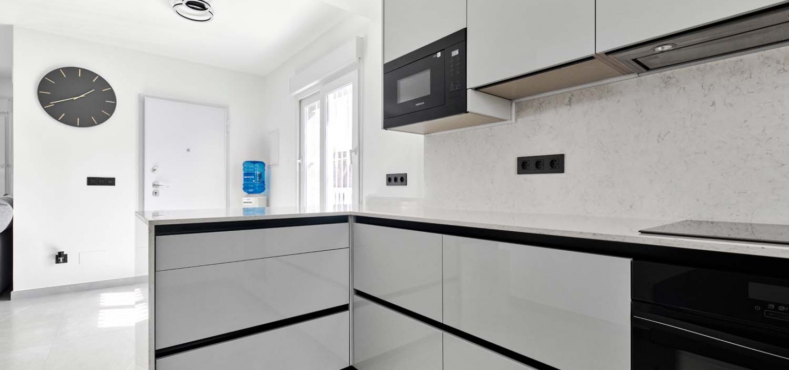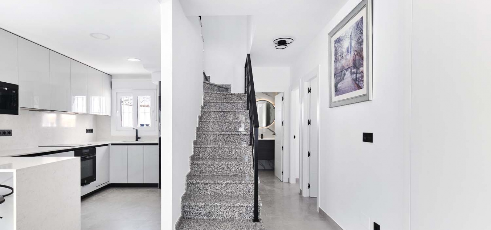 Ytterdörren öppnar sig mot ett ljust och rymligt vardagsrum och matsal med öppen planlösning, luftkonditionering och en elegant vägg. Det moderna, väldesignade köket ligger längst bak i matsalen och är avskilt av en frukostbar. Det erbjuder generöst med förvaring och högkvalitativa ytbehandlingar.