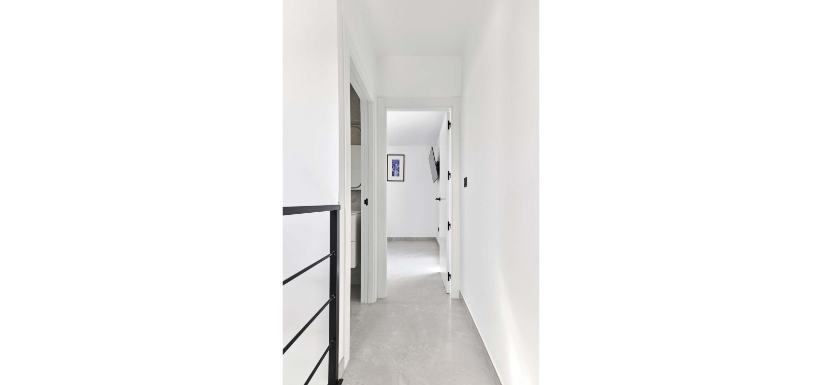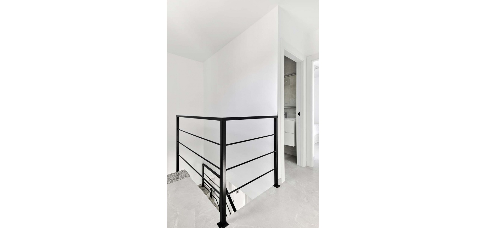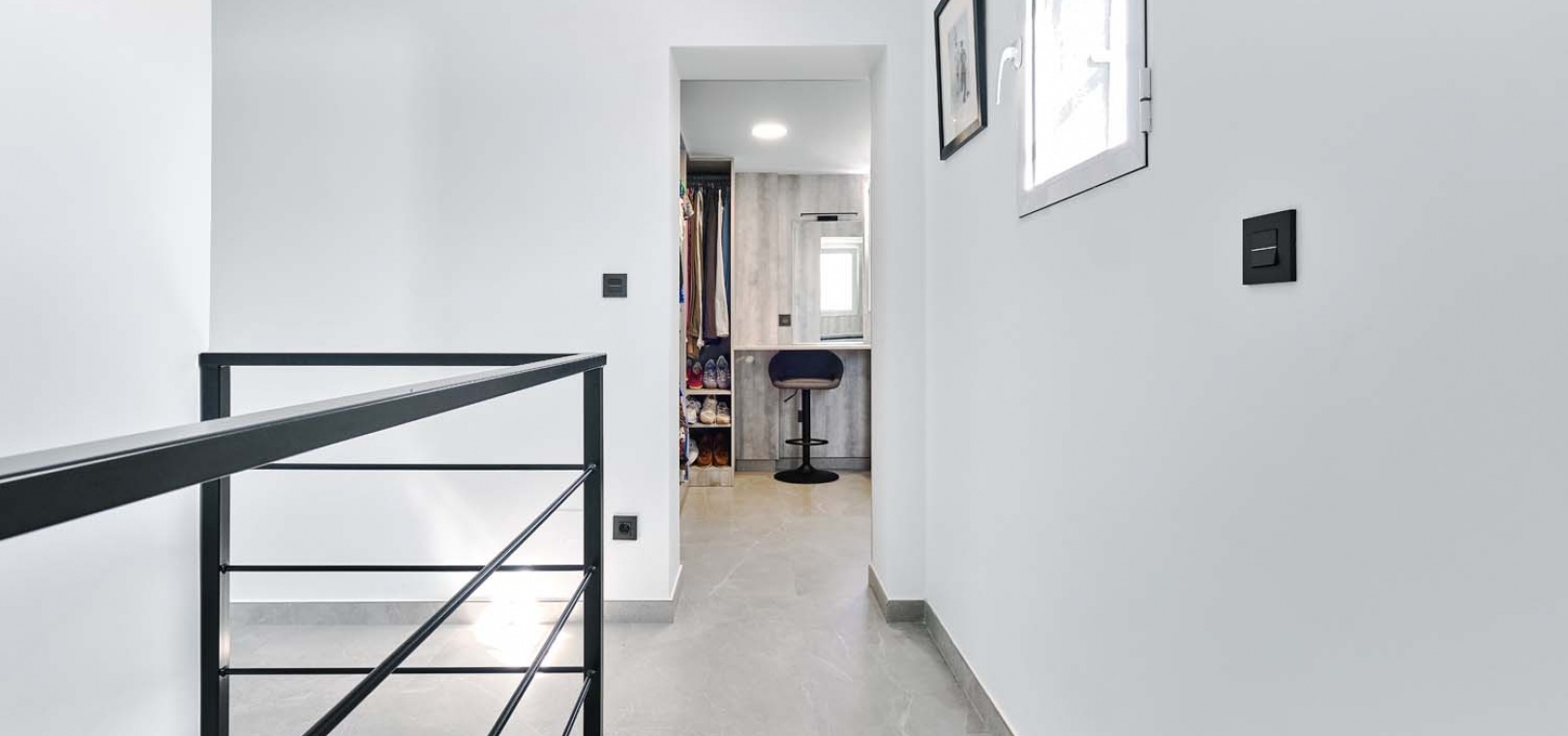 En intern trappa leder från vardagsrummet till första våningen. Högst upp på trappan hittar du en stor, specialdesignad klädkammare och ett omklädningsrum skapat av de nuvarande ägarna. Intill ligger det andra familjebadrummet, som också har en stor duschkabin. Denna våning kompletteras av sovrummet, som har varm/kall luftkonditionering och altandörrar som öppnar upp mot en privat takterrass med härlig utsikt över den omgivande landsbygden.